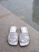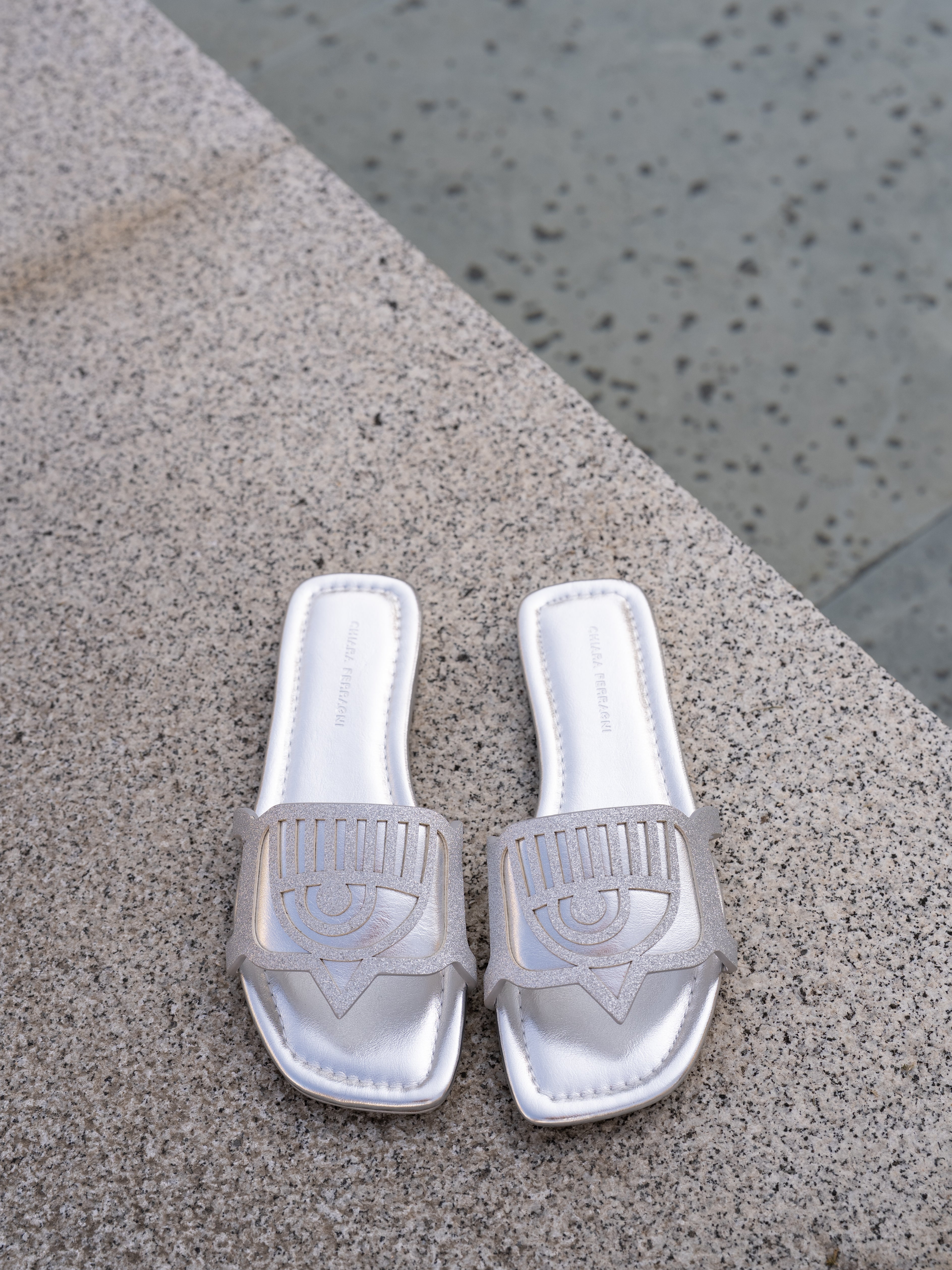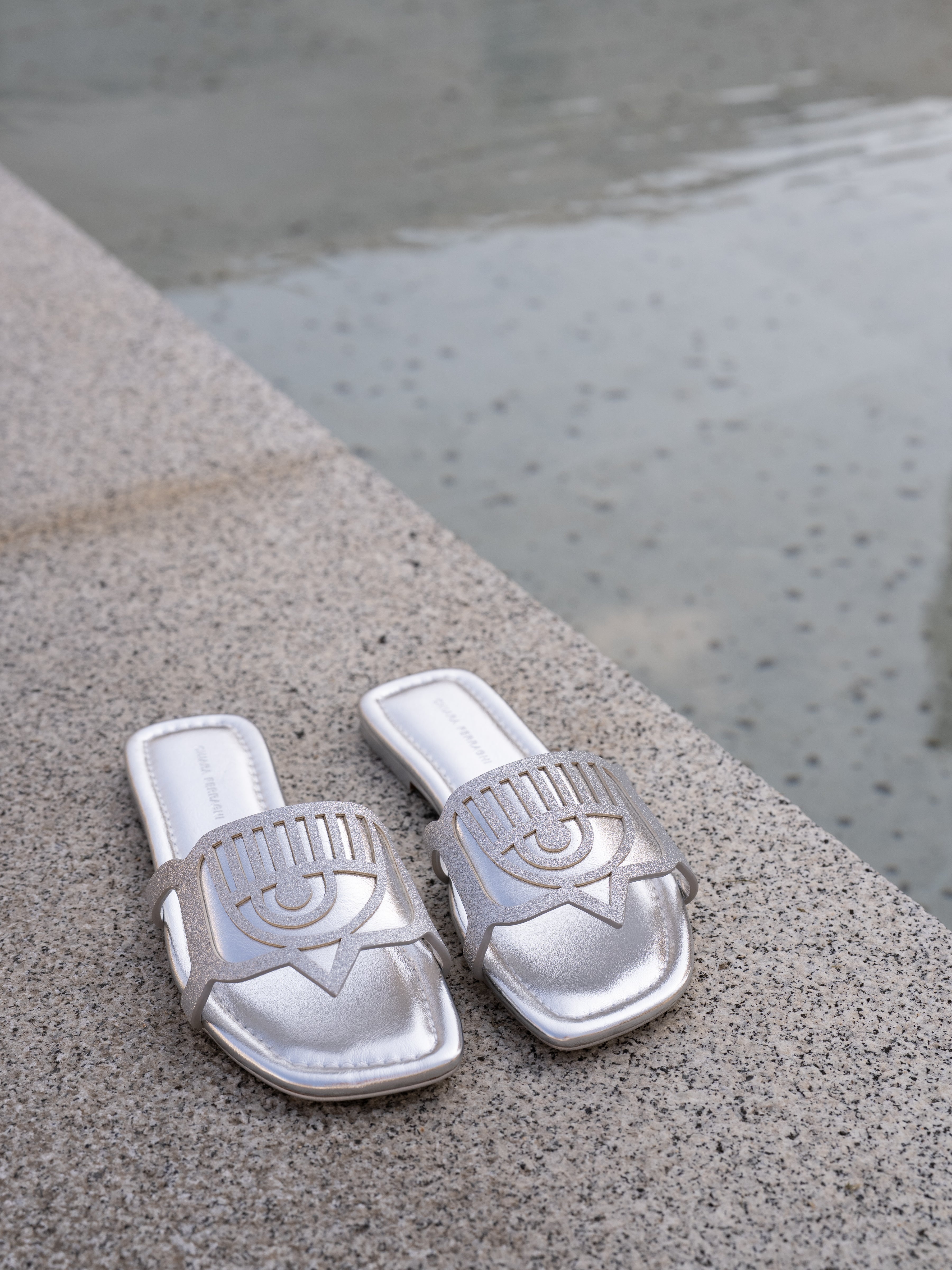 These Chiara Ferragni sandals feature a sleek and glamorous design in metallic silver. The open-toe style is complemented by a bold cut-out strap showcasing the brand’s signature eye motif, adding a touch of uniqueness and sophistication. The square-toe silhouette and cushioned insole provide both comfort and modern elegance. Perfect for elevating summer outfits, these sandals blend fashion and functionality with Chiara Ferragni’s signature sparkle.