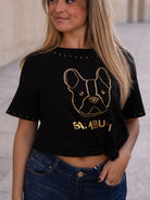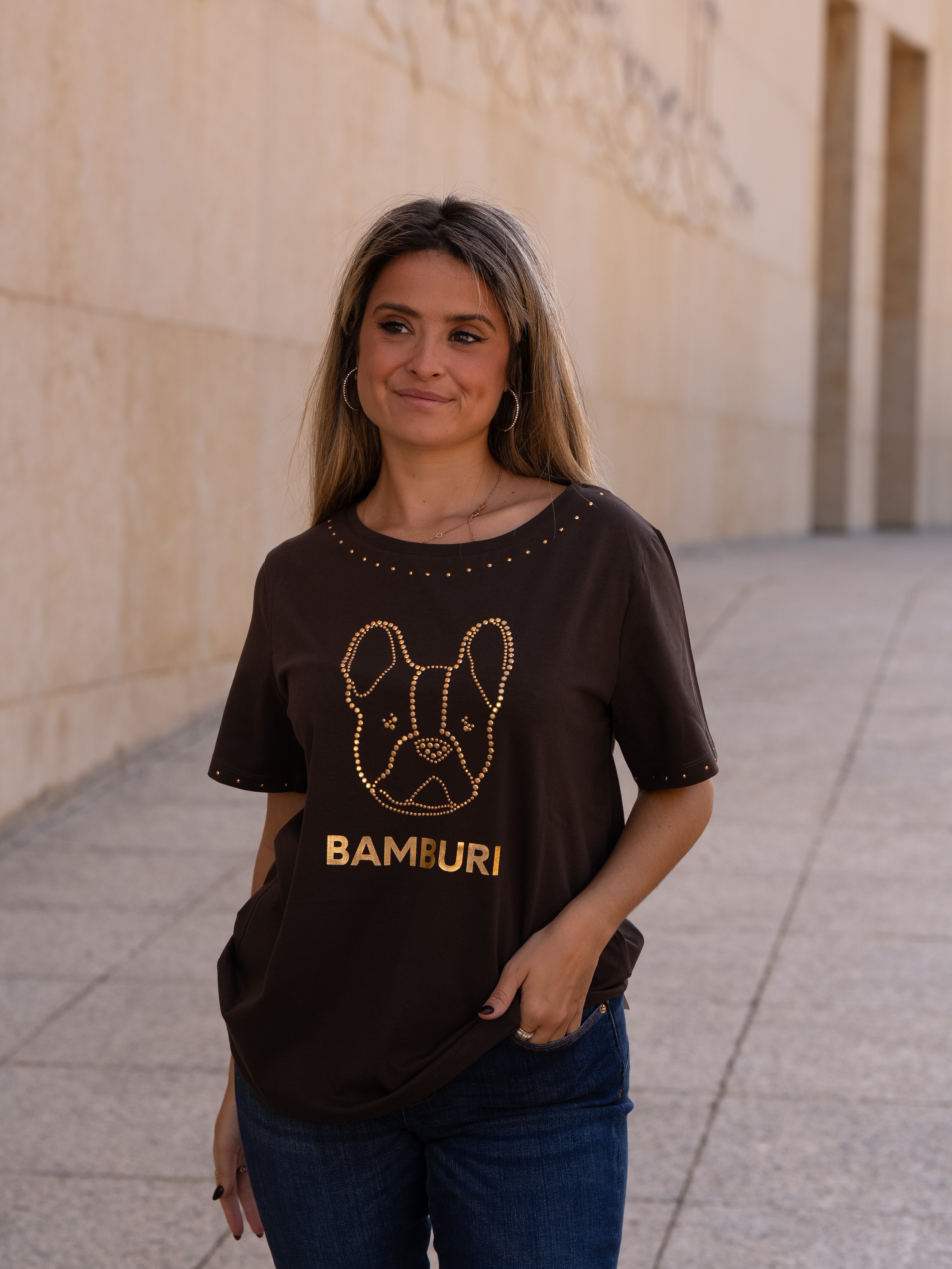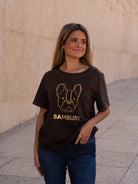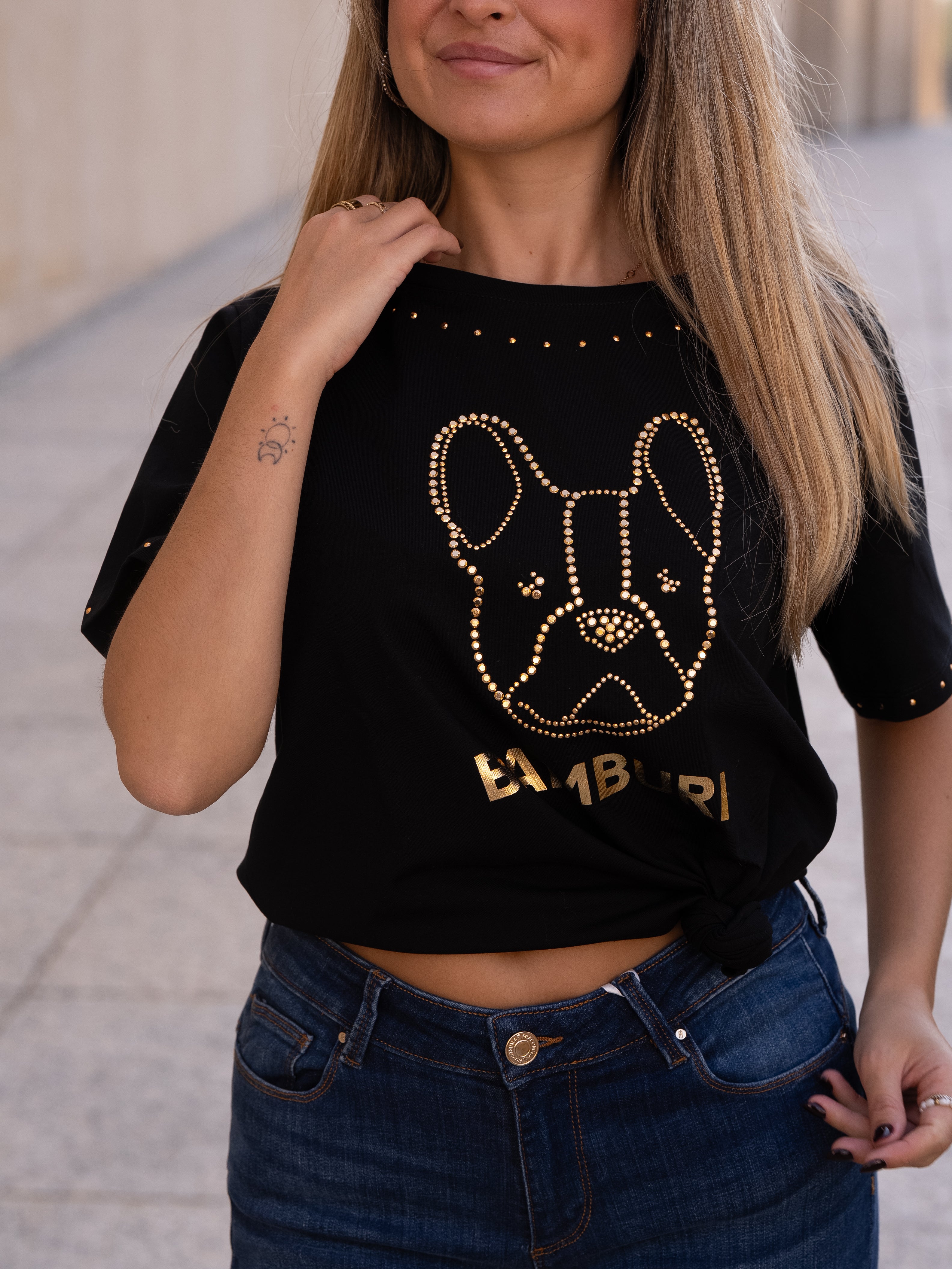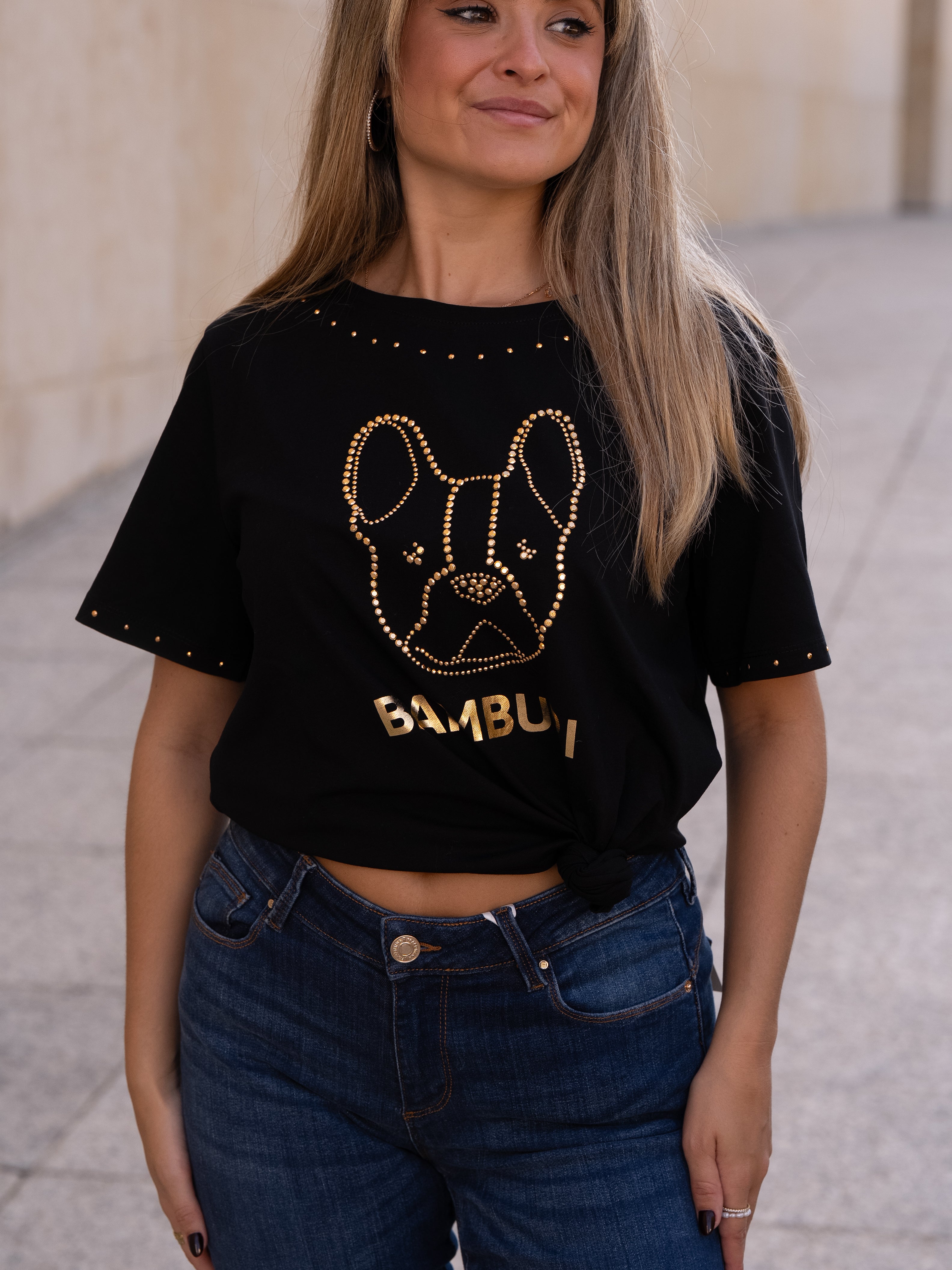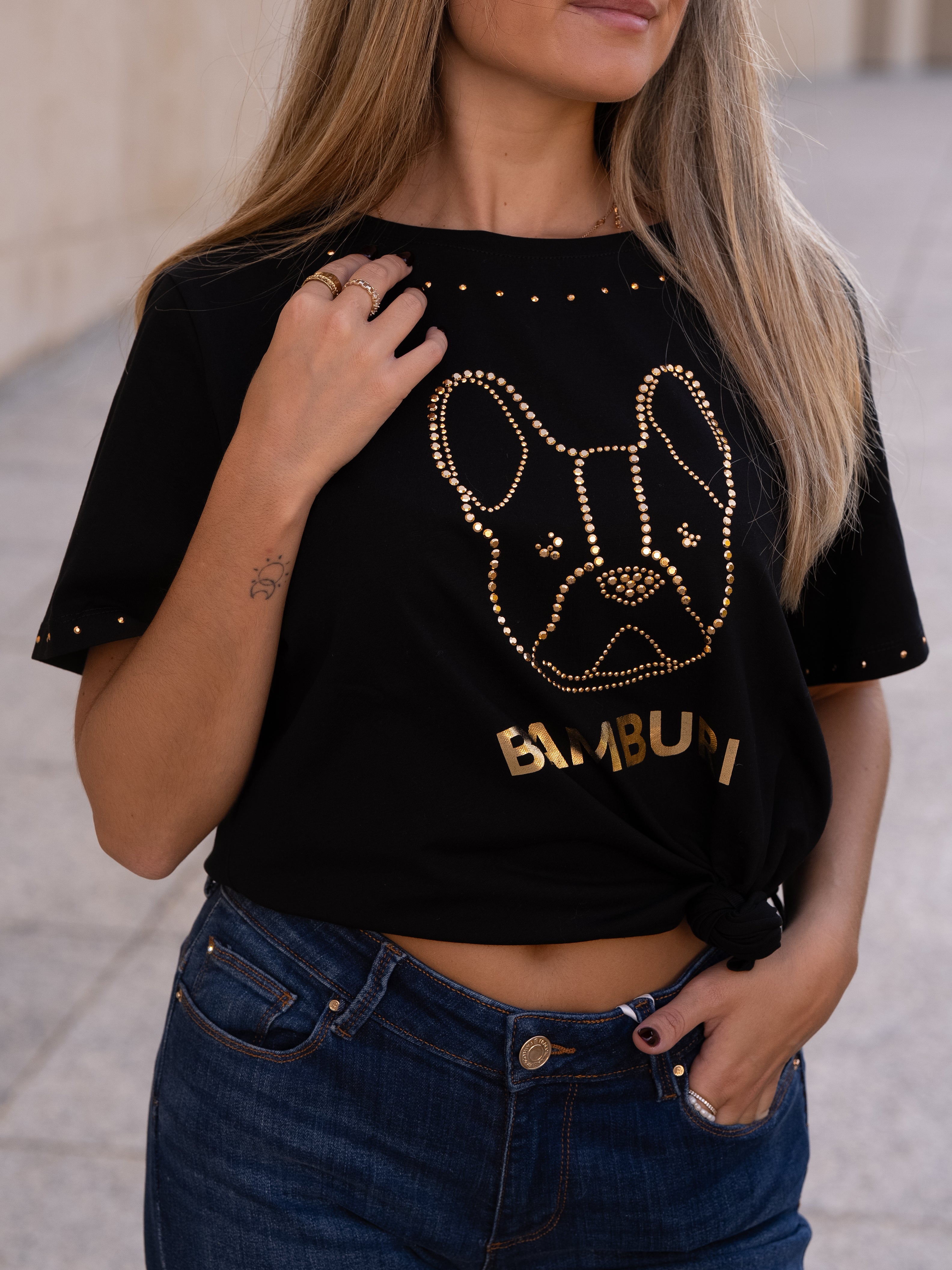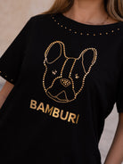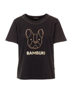 This black cotton t-shirt showcases one of Bamburi’s signature logos — the stylized French bulldog — outlined in gold studs for a bold yet refined statement. Additional stud detailing at the neckline and sleeves adds a subtle shimmer, making it a standout essential that captures the brand’s playful sophistication.
