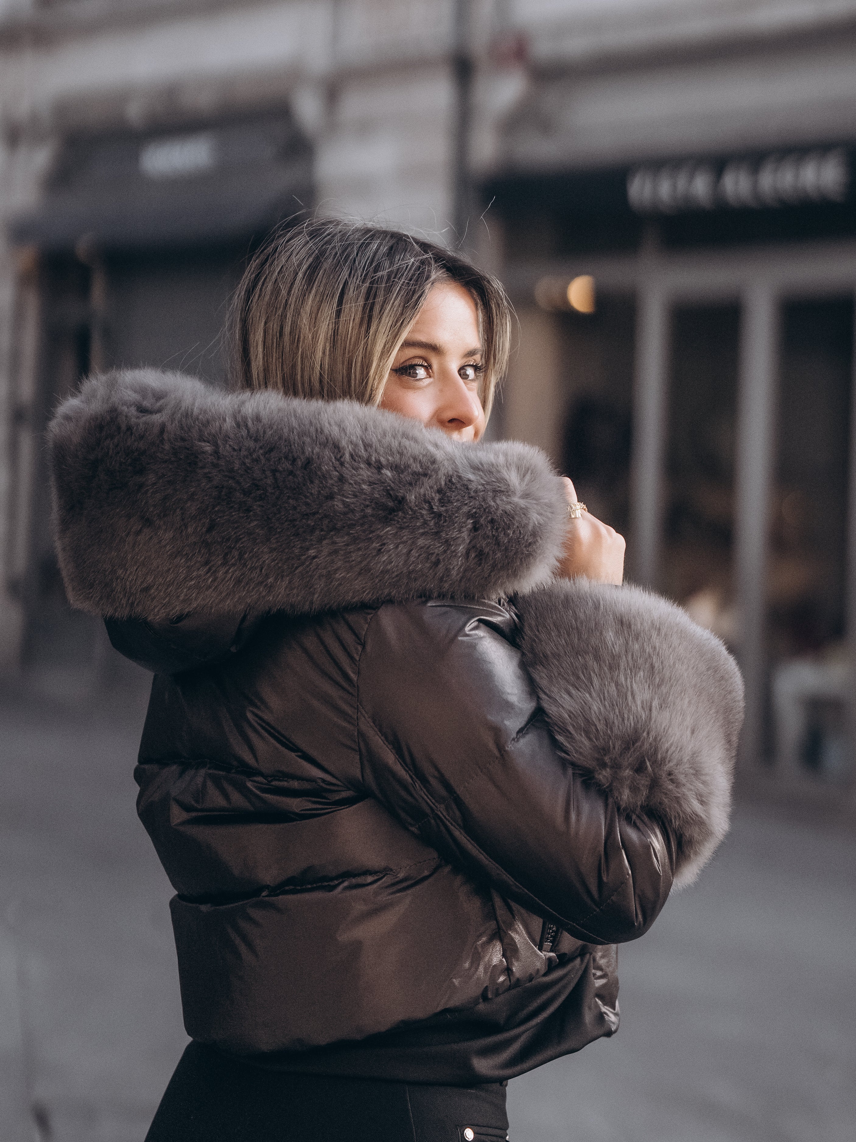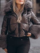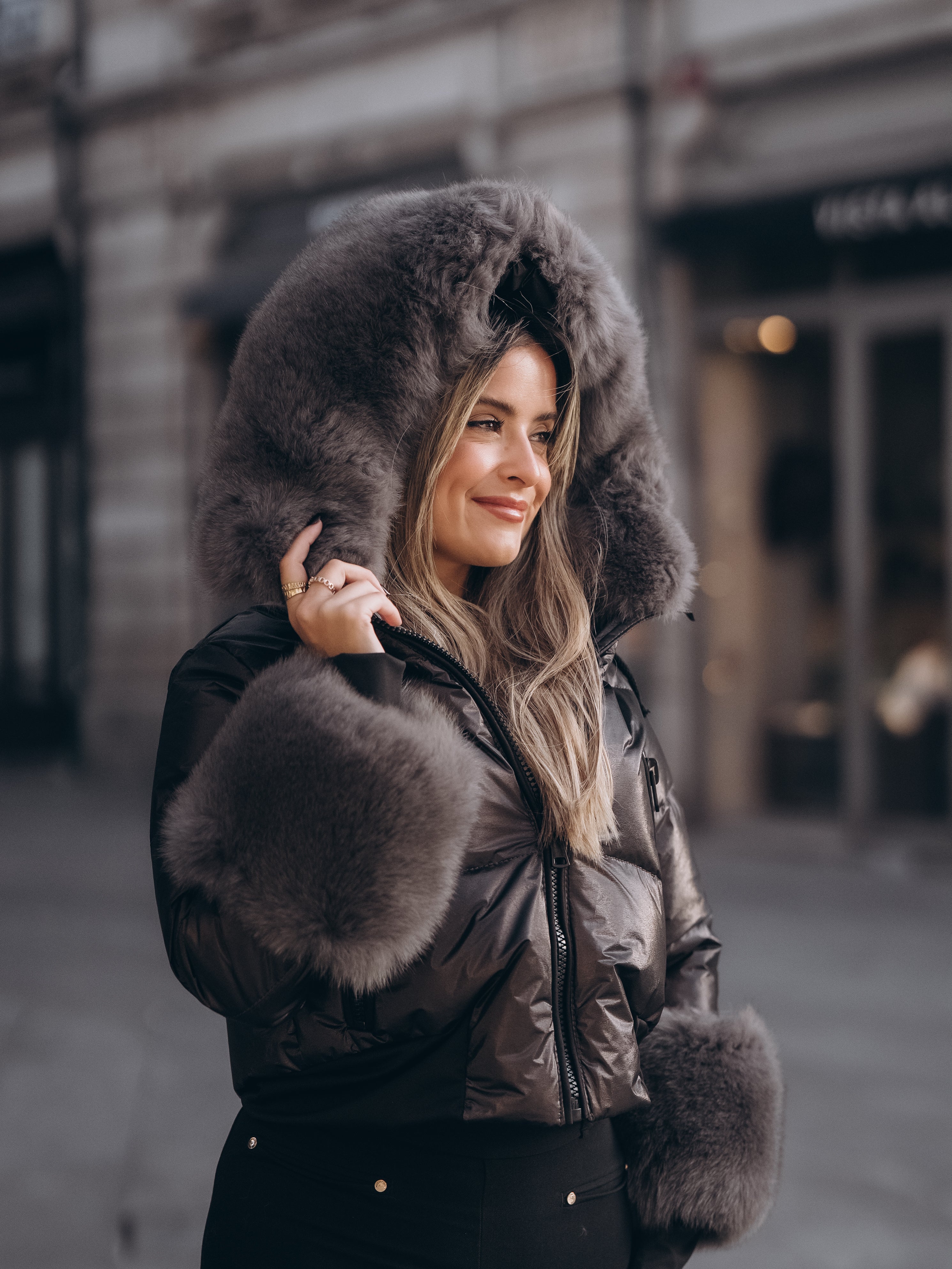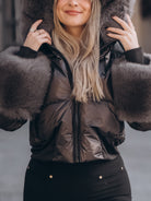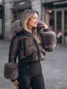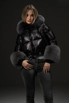 Casaco preto curto com pelo nos punhos e capuz
