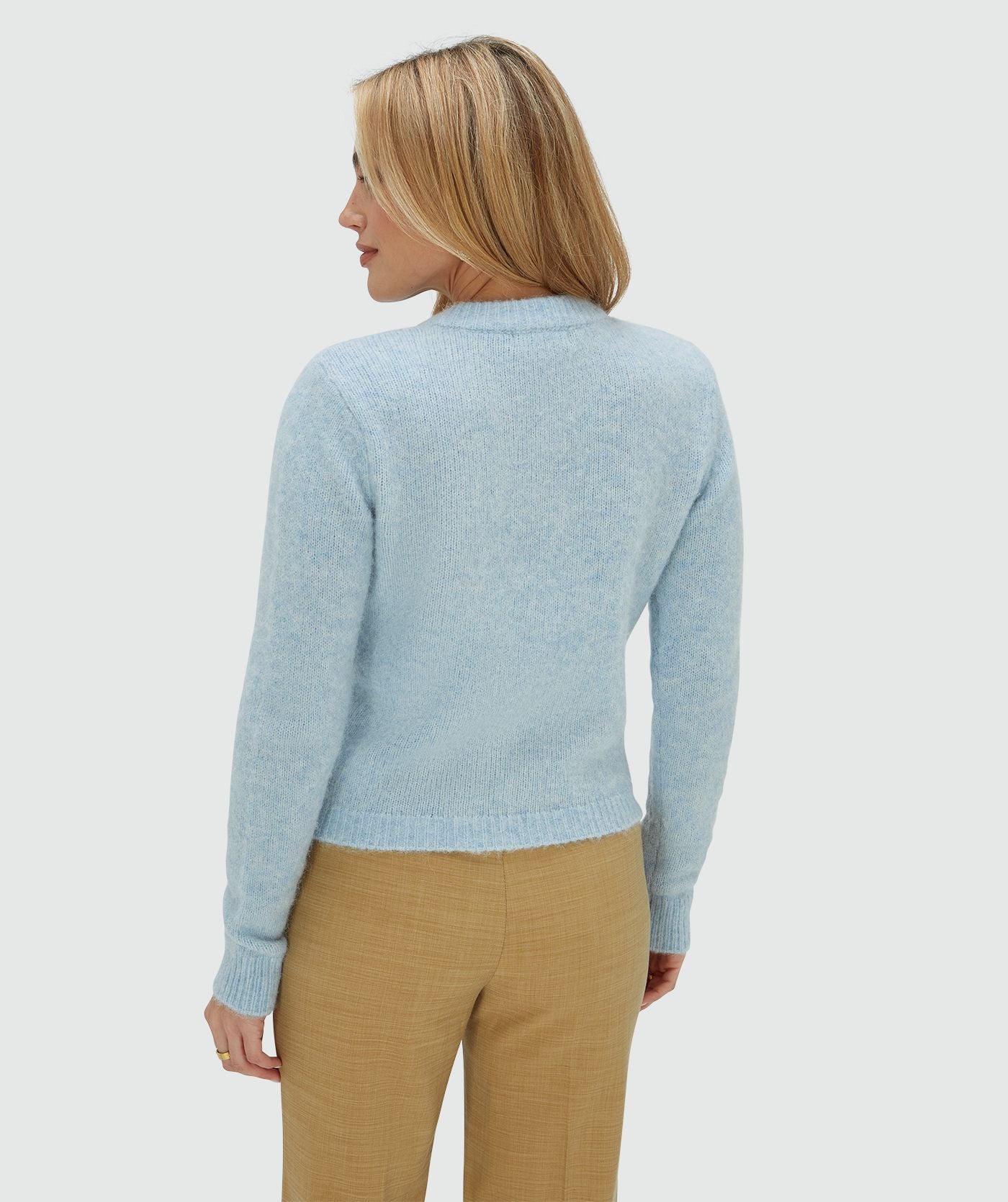 The JOSH V Pauline women’s cardigan in the color Fresh Blue Melange is a fine-knit cardigan with removable shoulder pads (attached with snap buttons). The light blue cardigan is made from a soft, high-quality blend with fine merino wool and kid alpaca. The regular-fit cardigan is finished with branded buttons and a gold-colored brand emblem on the chest. Styling tip: Wear it closed with a high-waisted skirt or tailored trousers and complete the look with minimalist jewelry and a statement bag