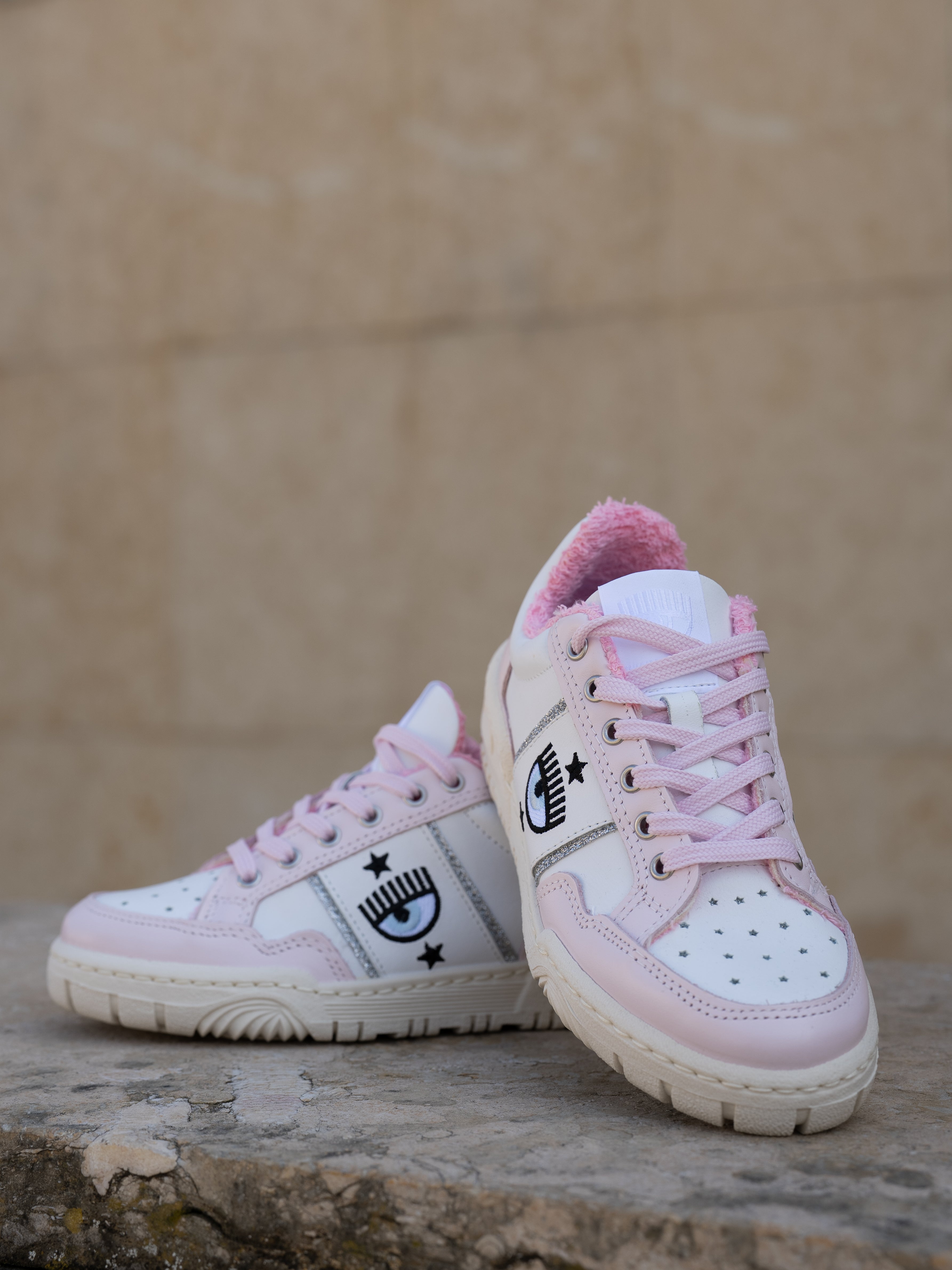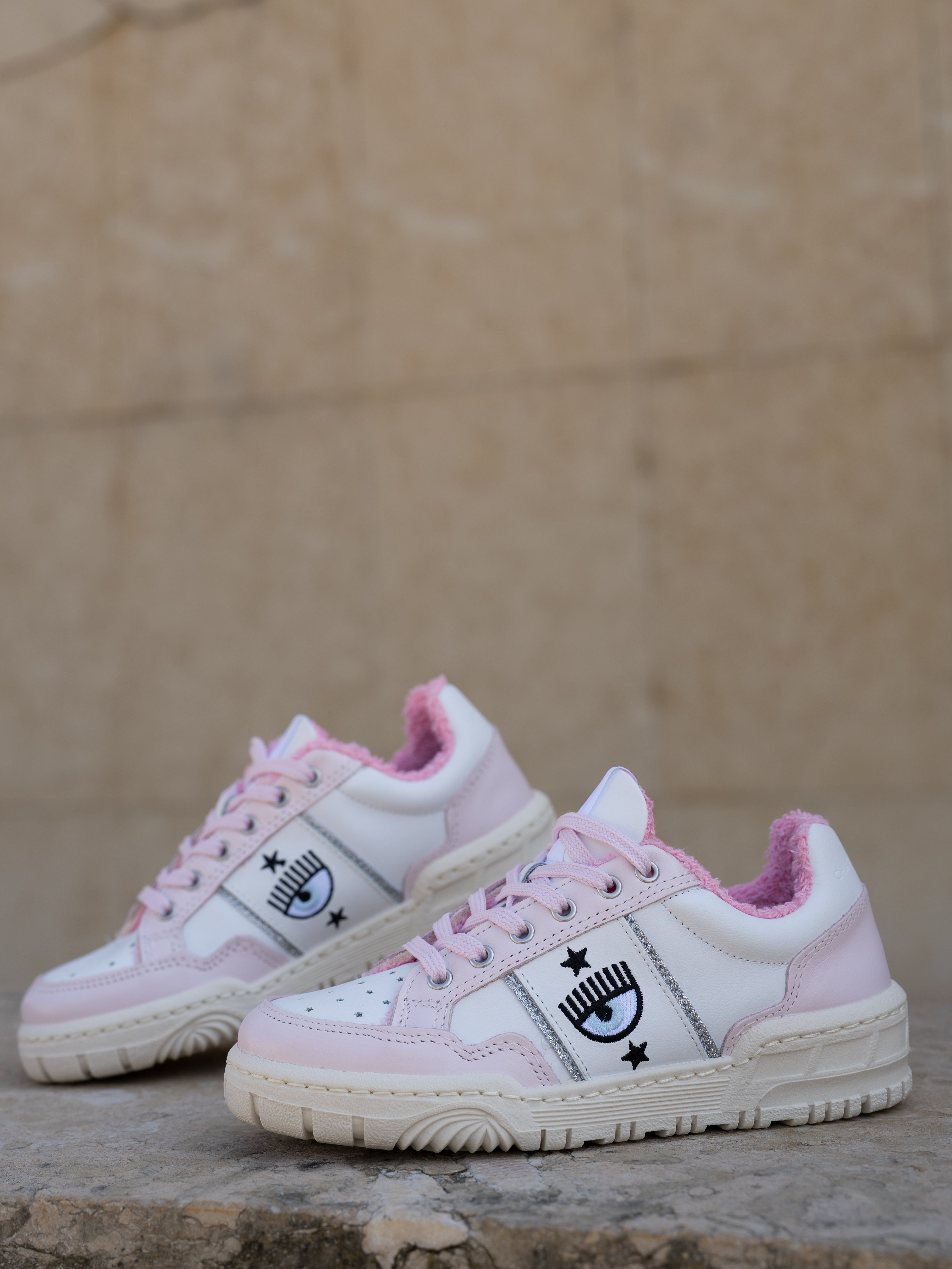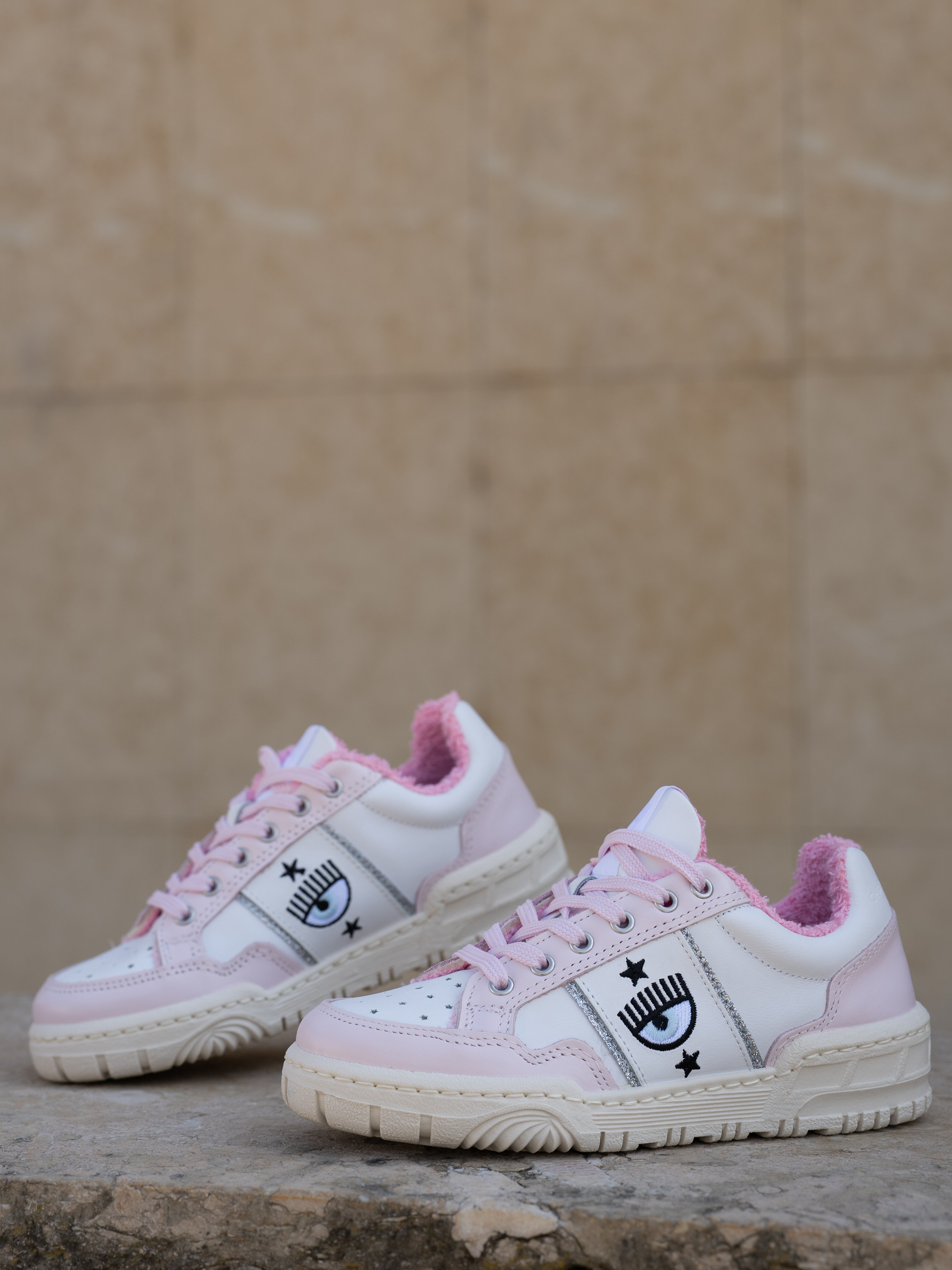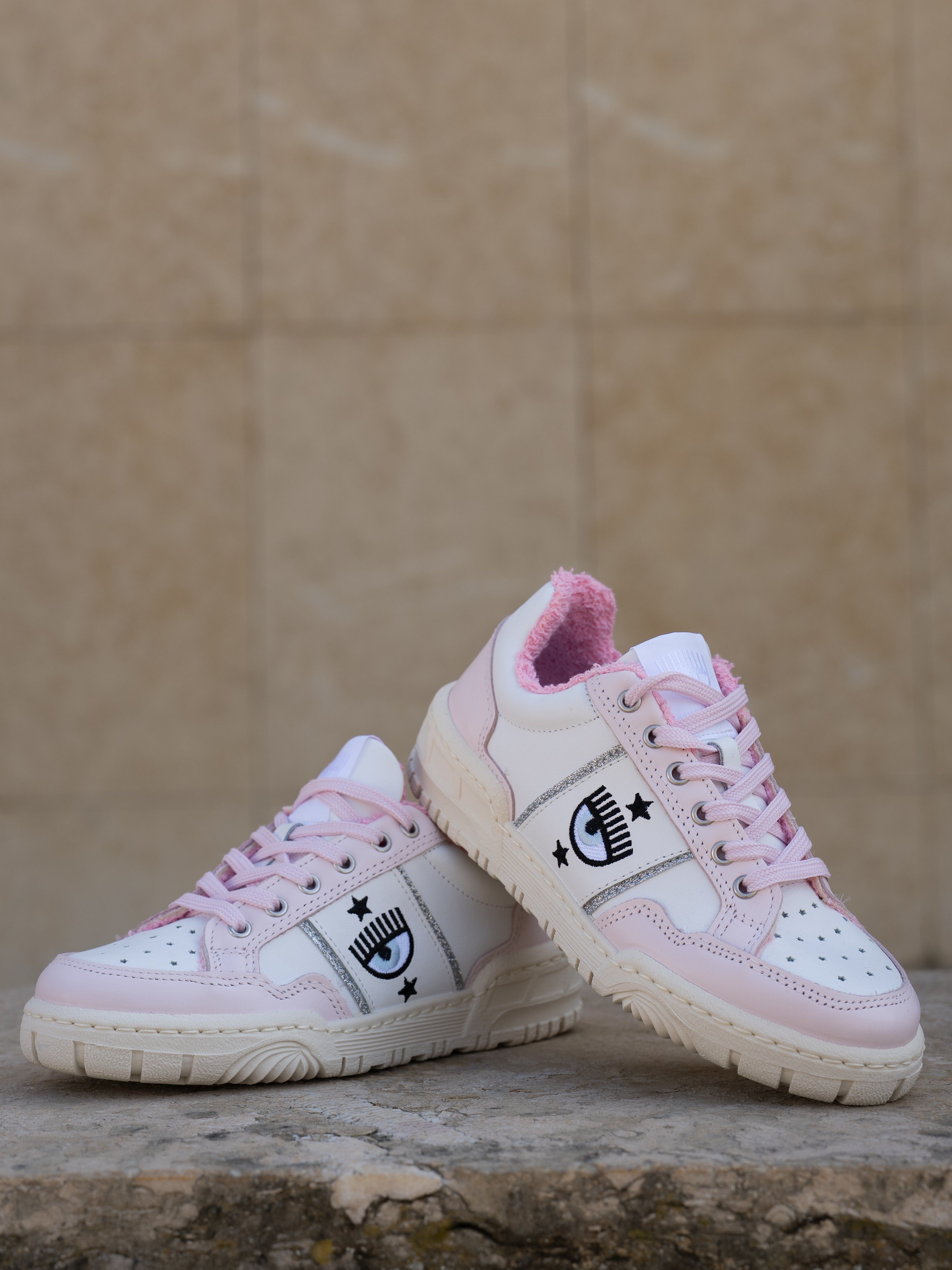 These Chiara Ferragni sneakers feature a trendy and playful design with a mix of white and pastel pink tones. The upper showcases the brand’s signature eye motif embroidered alongside small black stars, adding a unique and stylish touch. The sneakers have a durable rubber sole, perforated toe box for breathability, and pink laces that complement the cozy pink inner lining. Perfect for a casual yet fashionable look, these sneakers blend comfort with Chiara Ferragni’s signature bold aesthetic.