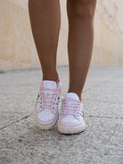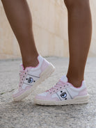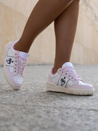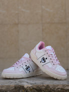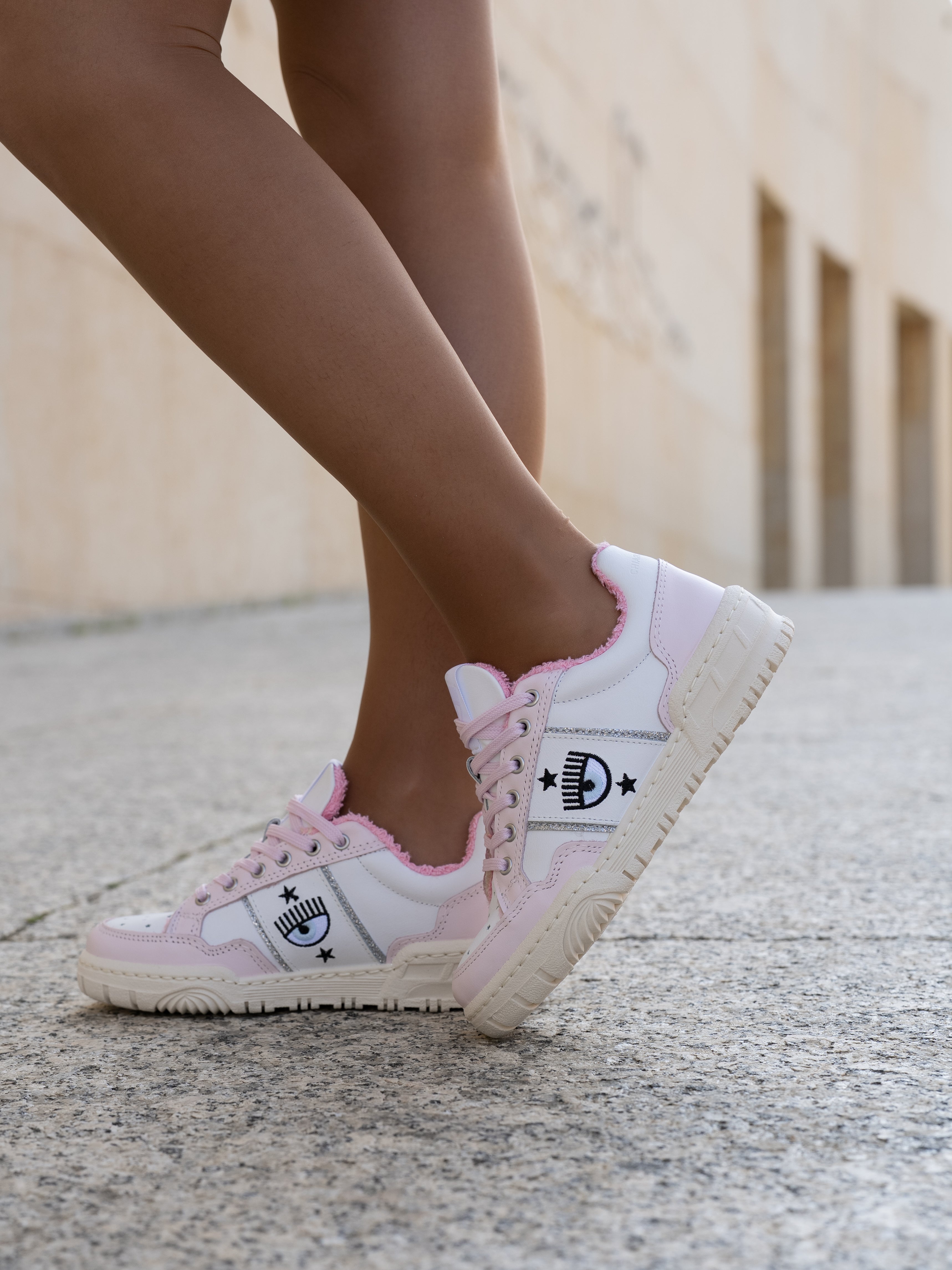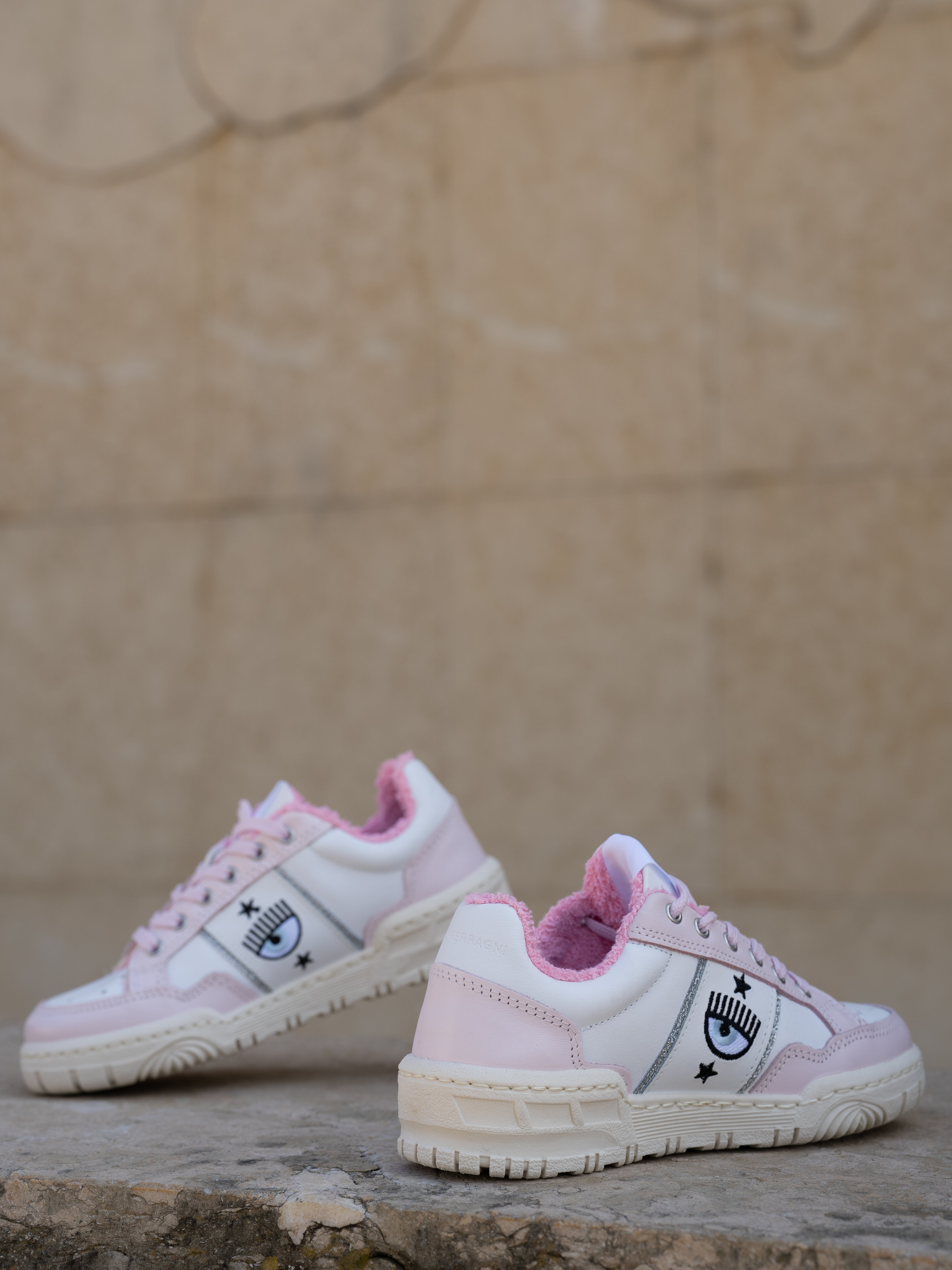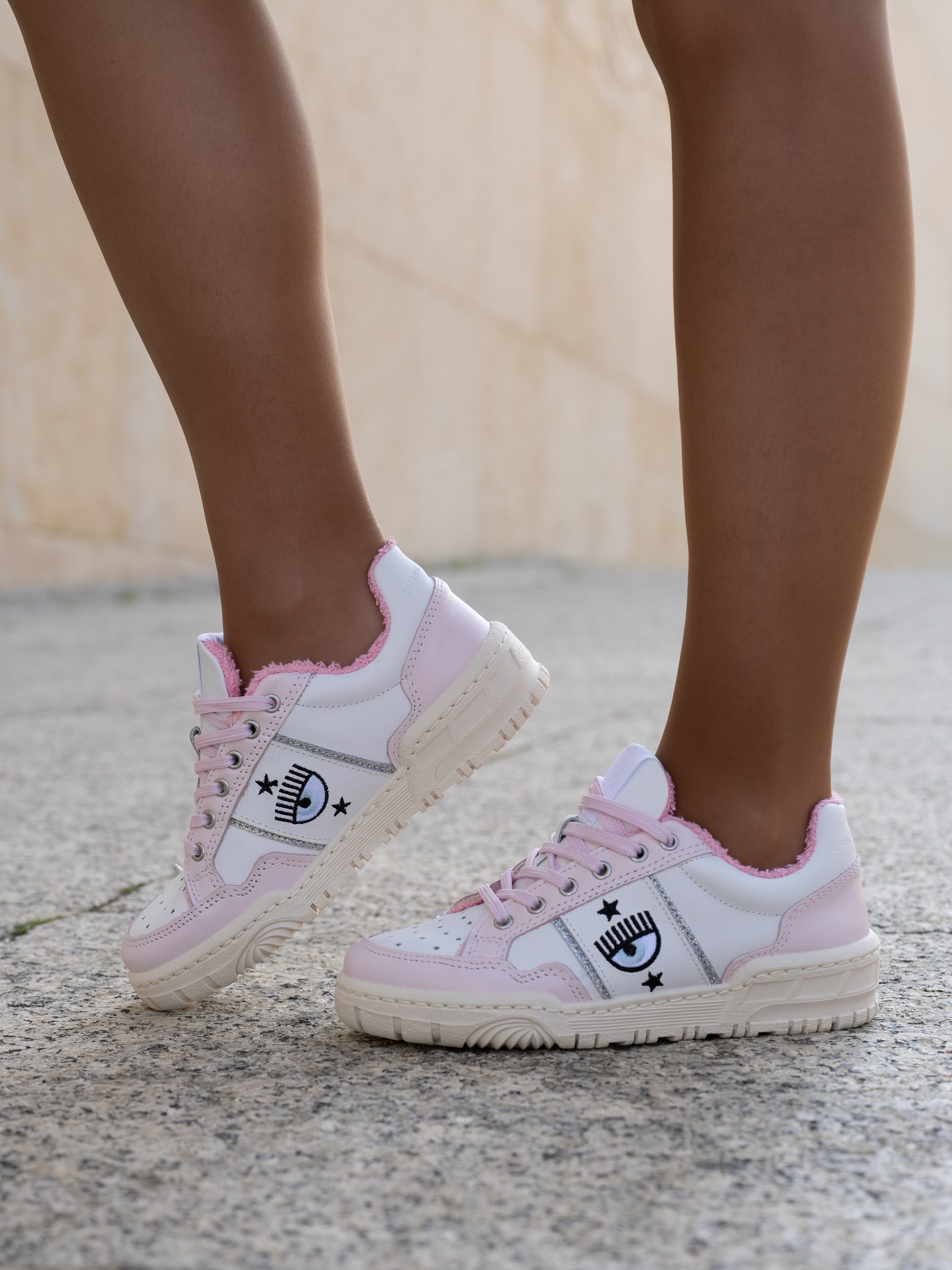 These Chiara Ferragni sneakers feature a trendy and playful design with a mix of white and pastel pink tones. The upper showcases the brand’s signature eye motif embroidered alongside small black stars, adding a unique and stylish touch. The sneakers have a durable rubber sole, perforated toe box for breathability, and pink laces that complement the cozy pink inner lining. Perfect for a casual yet fashionable look, these sneakers blend comfort with Chiara Ferragni’s signature bold aesthetic.