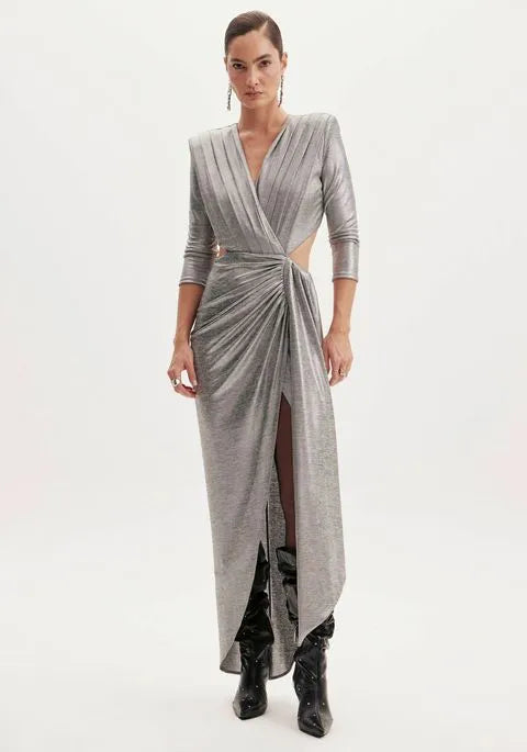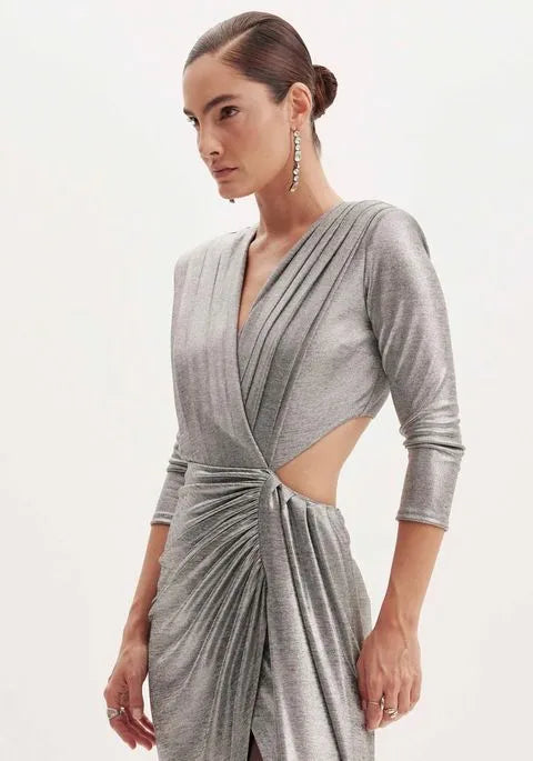 O vestido apresenta mangas longas com ombreiras, que estrutura a peça. O decote v profundo, o detalhe com recorte e a fenda trazem um ar sexy e poderoso ao look. Possui fechamento posterior em zíper. Prepare-se para arrasar com esse modelo!