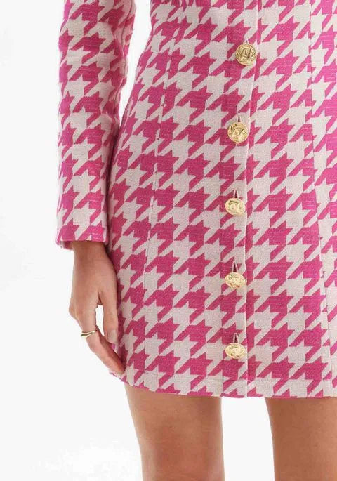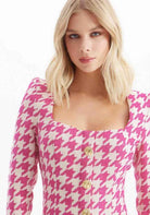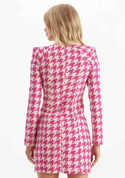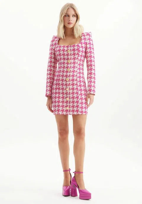 O vestido curto estampado é uma peça versátil e cheia de estilo. Apresenta shape justo, decote quadrado e mangas longas com ombreiras. O acabamento em botões é outro destaque