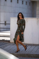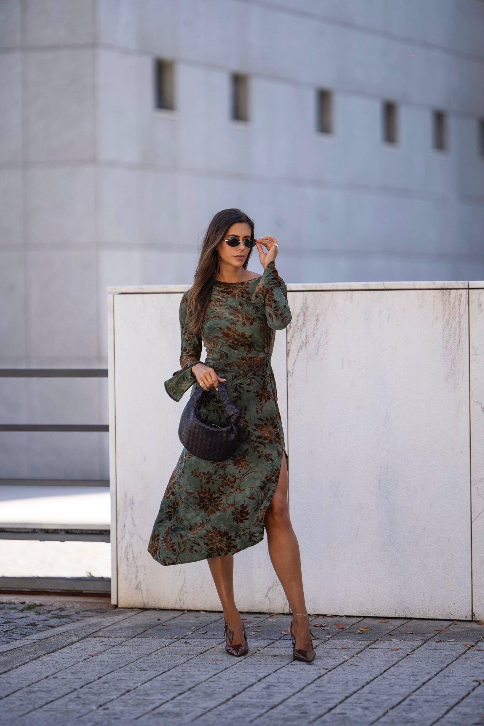 Vestido midi em veludo devoré com padrão floral em tons ricos. O design de manga comprida e decote redondo é complementado por um nó lateral que define a cintura e cria um drapeado elegante. A assimetria subtil na bainha acrescenta leveza e movimento à silhueta.