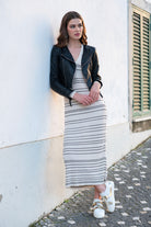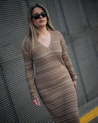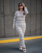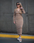 Vestido tubo de malha canelada comprido.Decote em V e manga comprida.