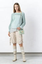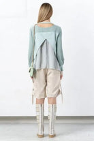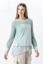 Sage green blouse in plush and knitwear weave pattern on shoulders and sleeves.