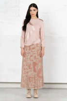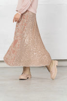 Long skirt made of sequins and pink knitwear.