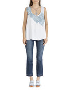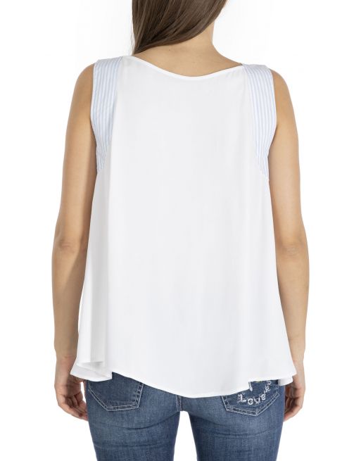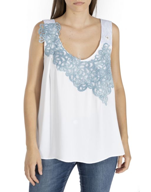 Muito bonita regata com alças largas, decorada com renda azulada.