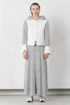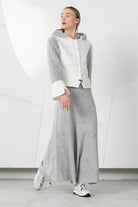 White and gray melange faux fur short jacket with hood.