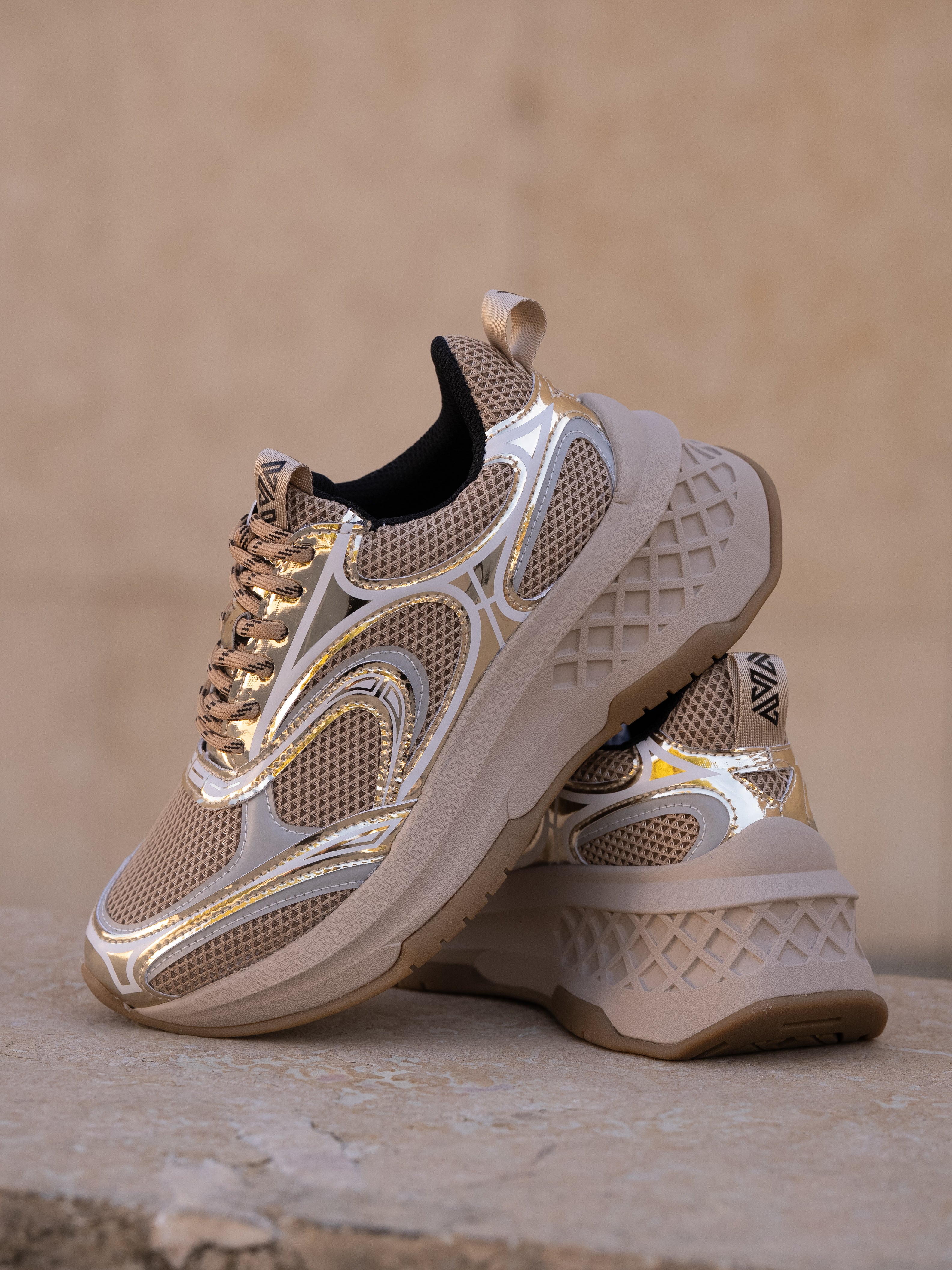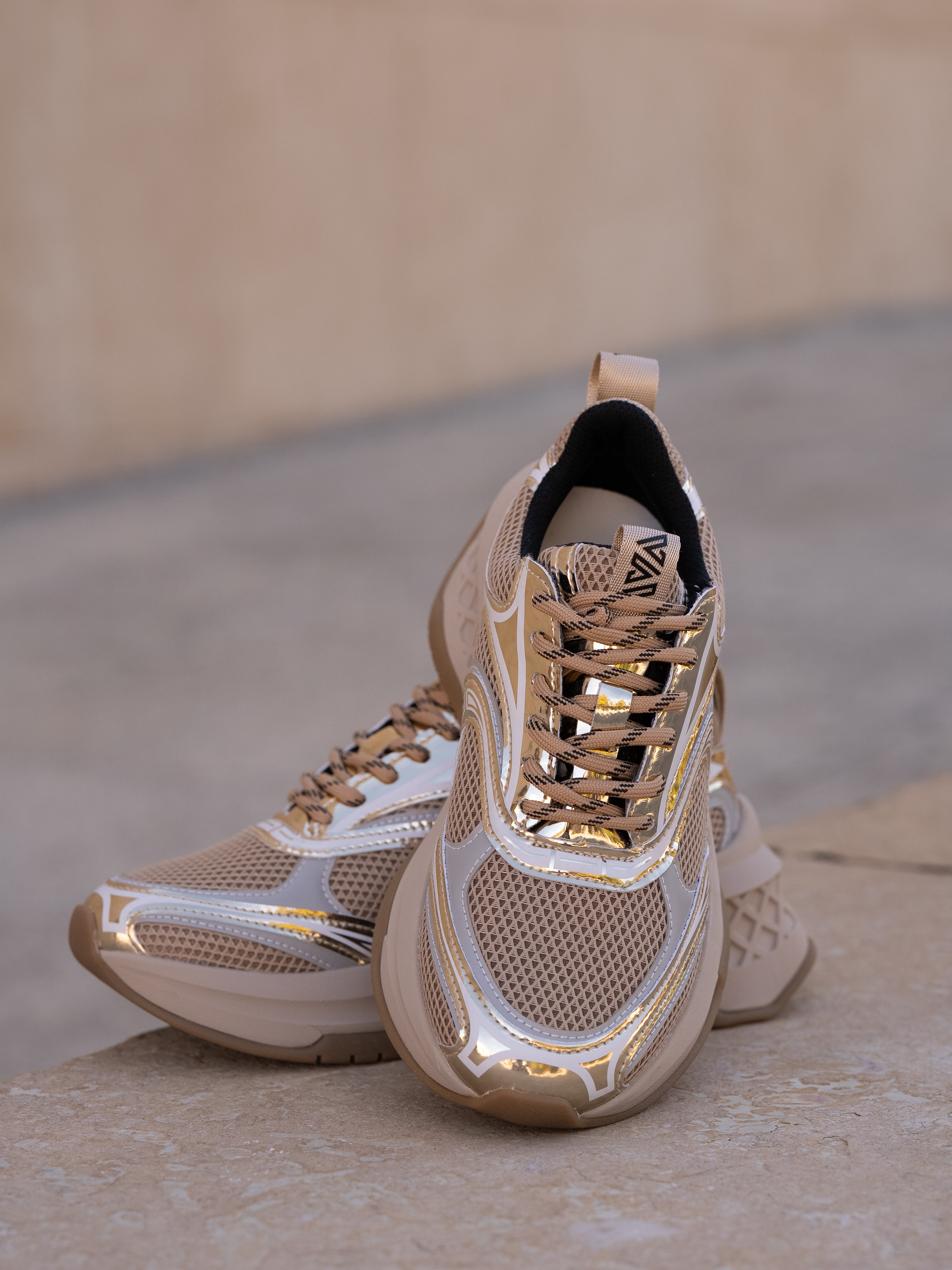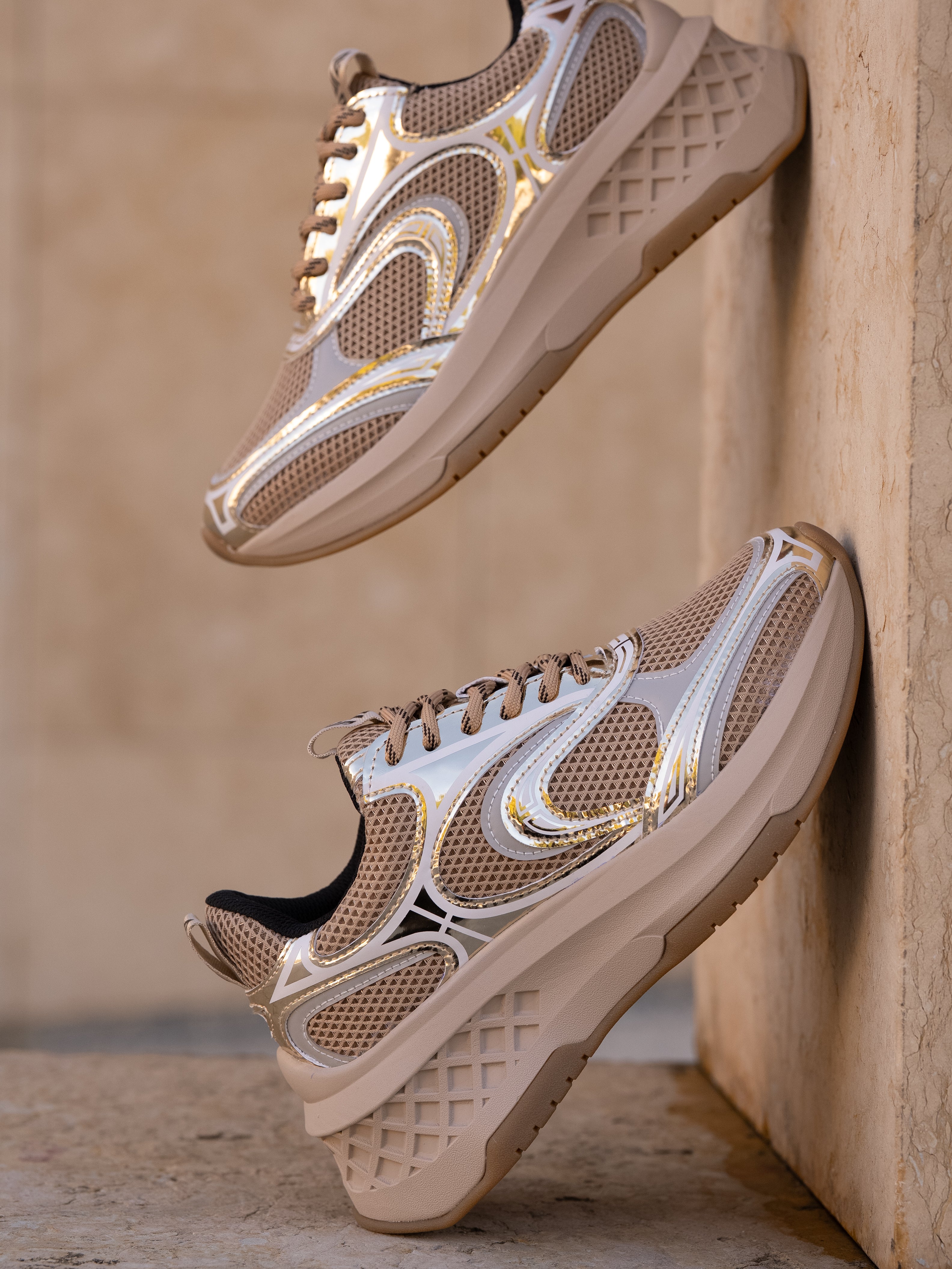 Lace-up running shoes in mirrored material and technical fabric with transparent PVC details and a two-tone lightweight EVA sole.