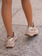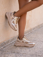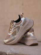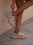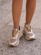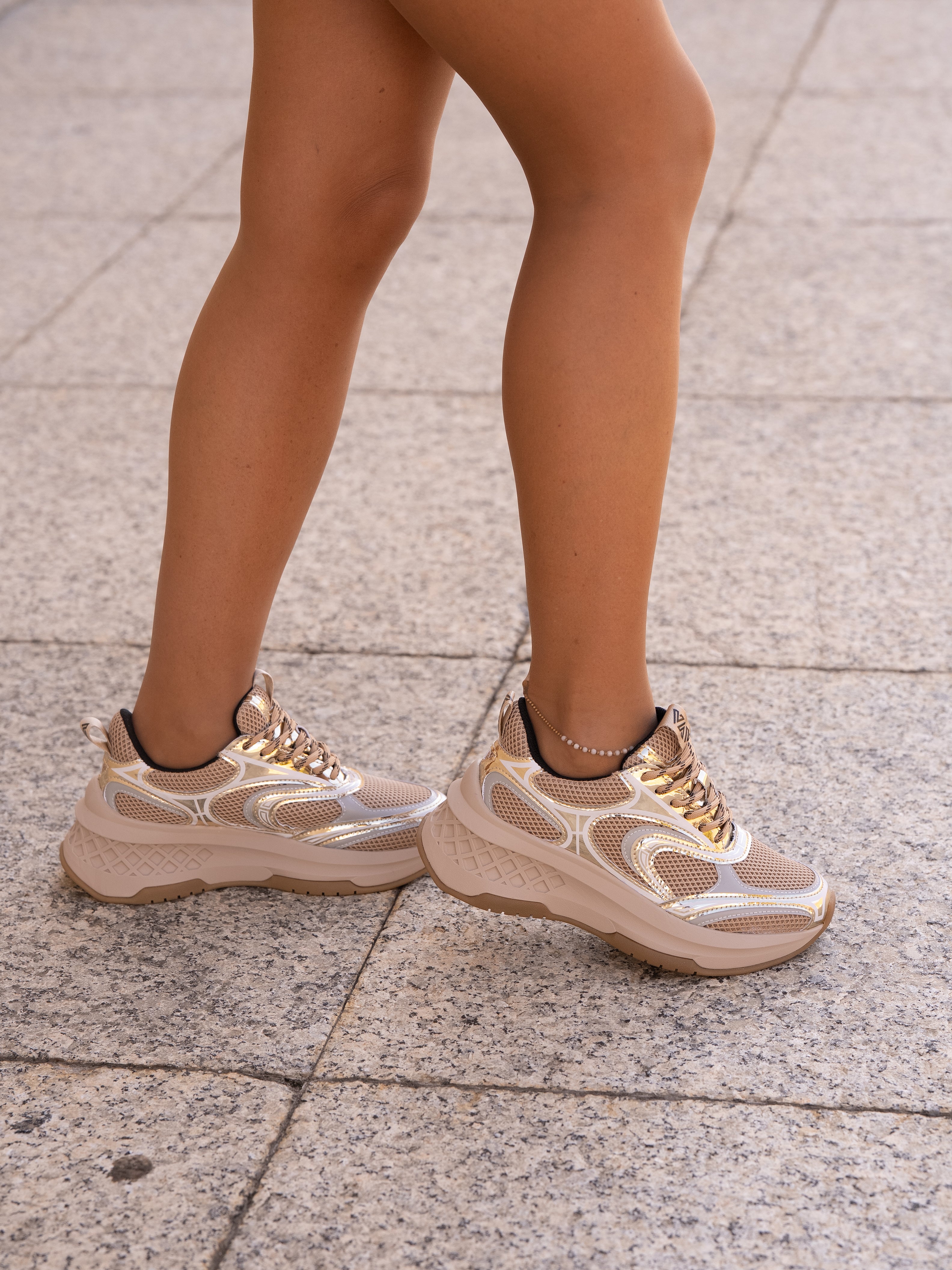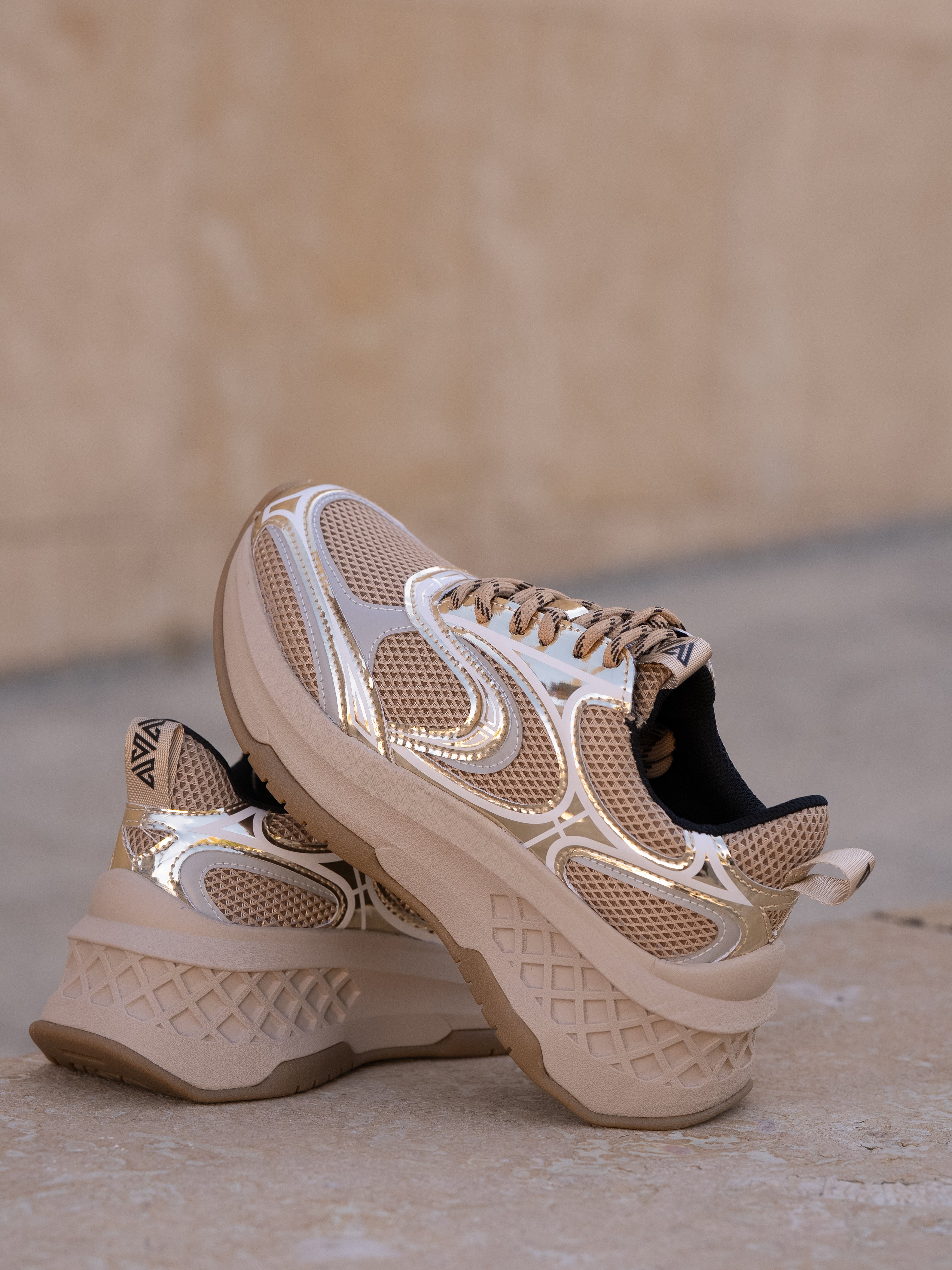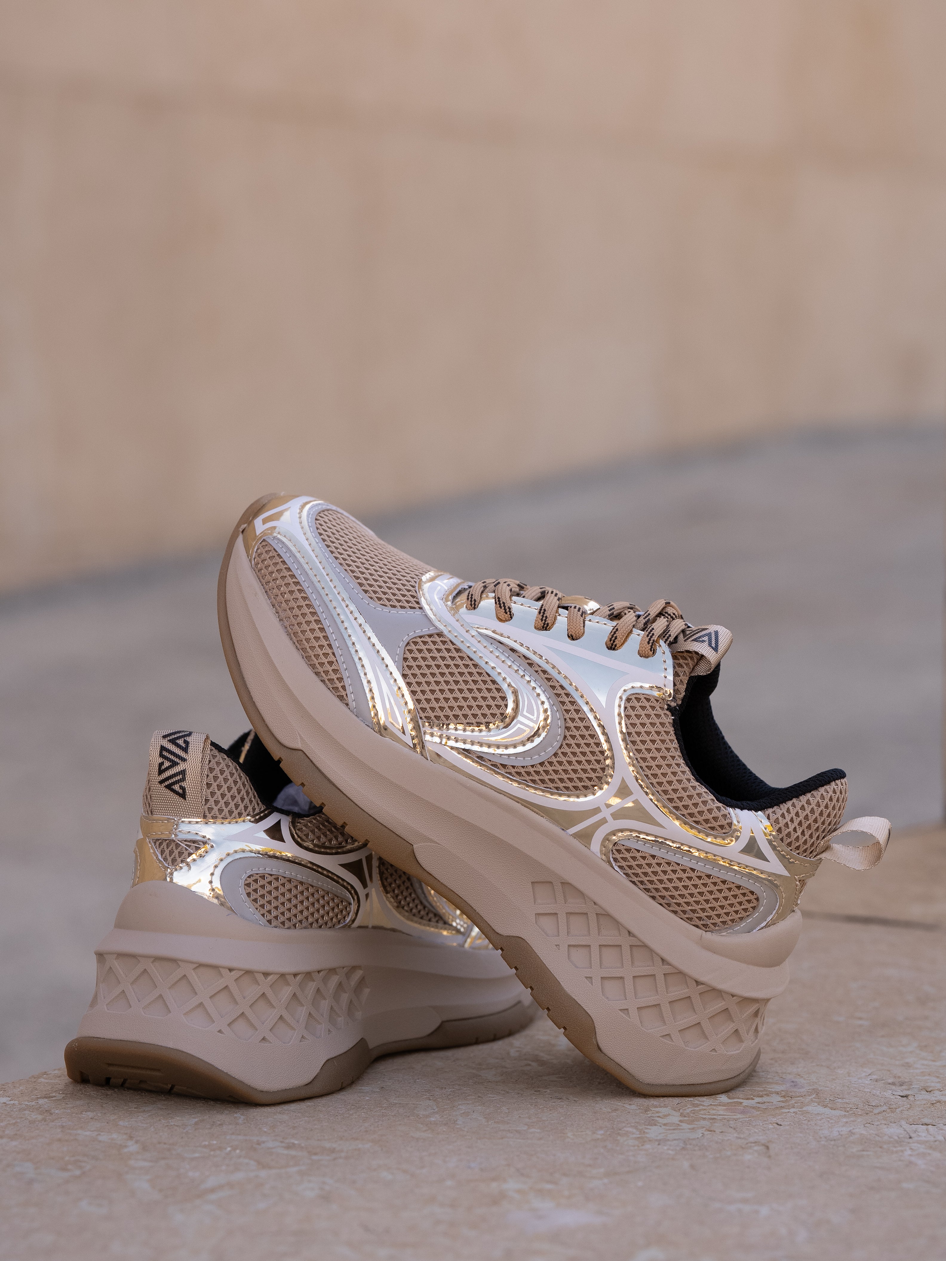 Lace-up running shoes in mirrored material and technical fabric with transparent PVC details and a two-tone lightweight EVA sole.