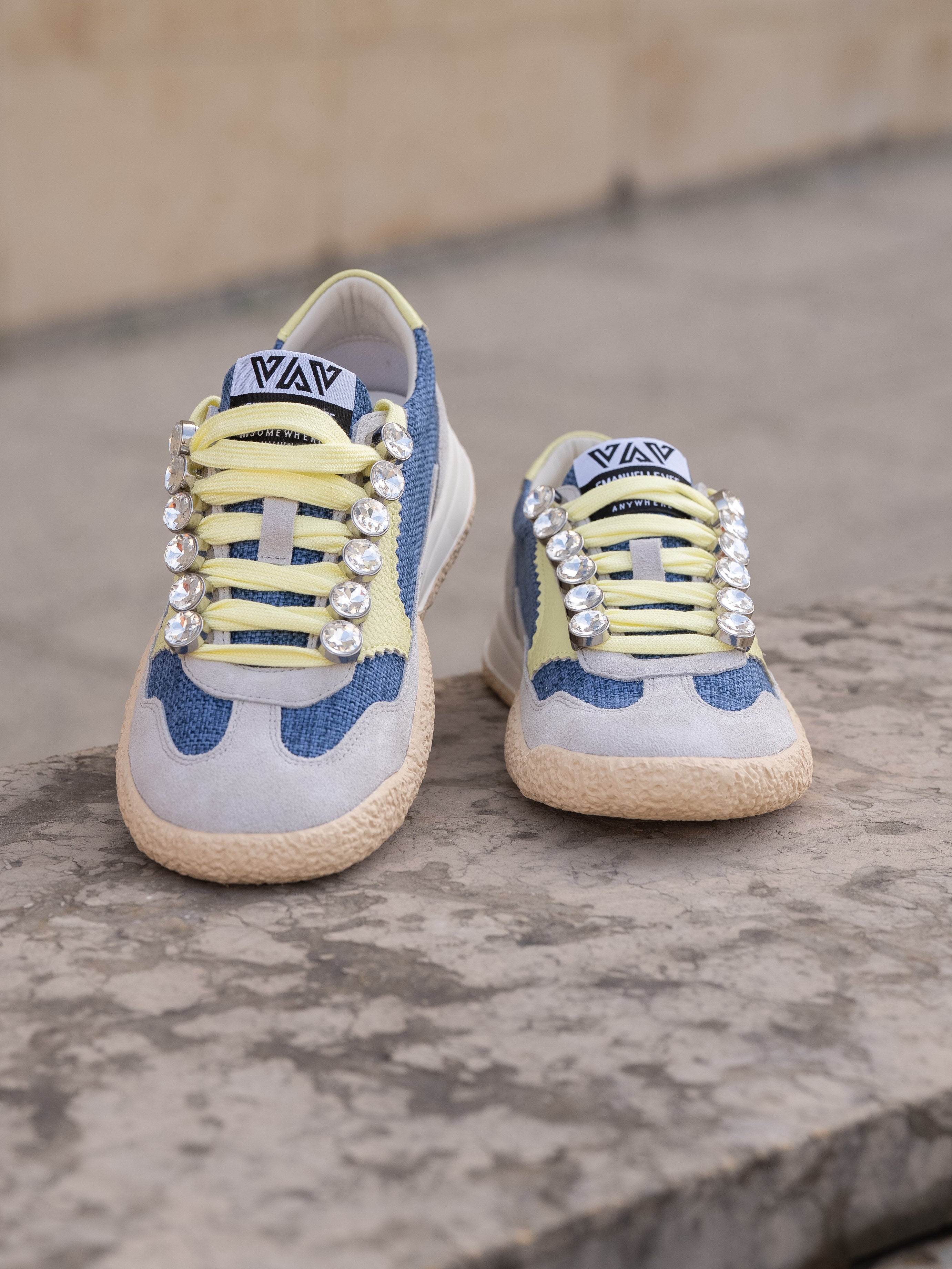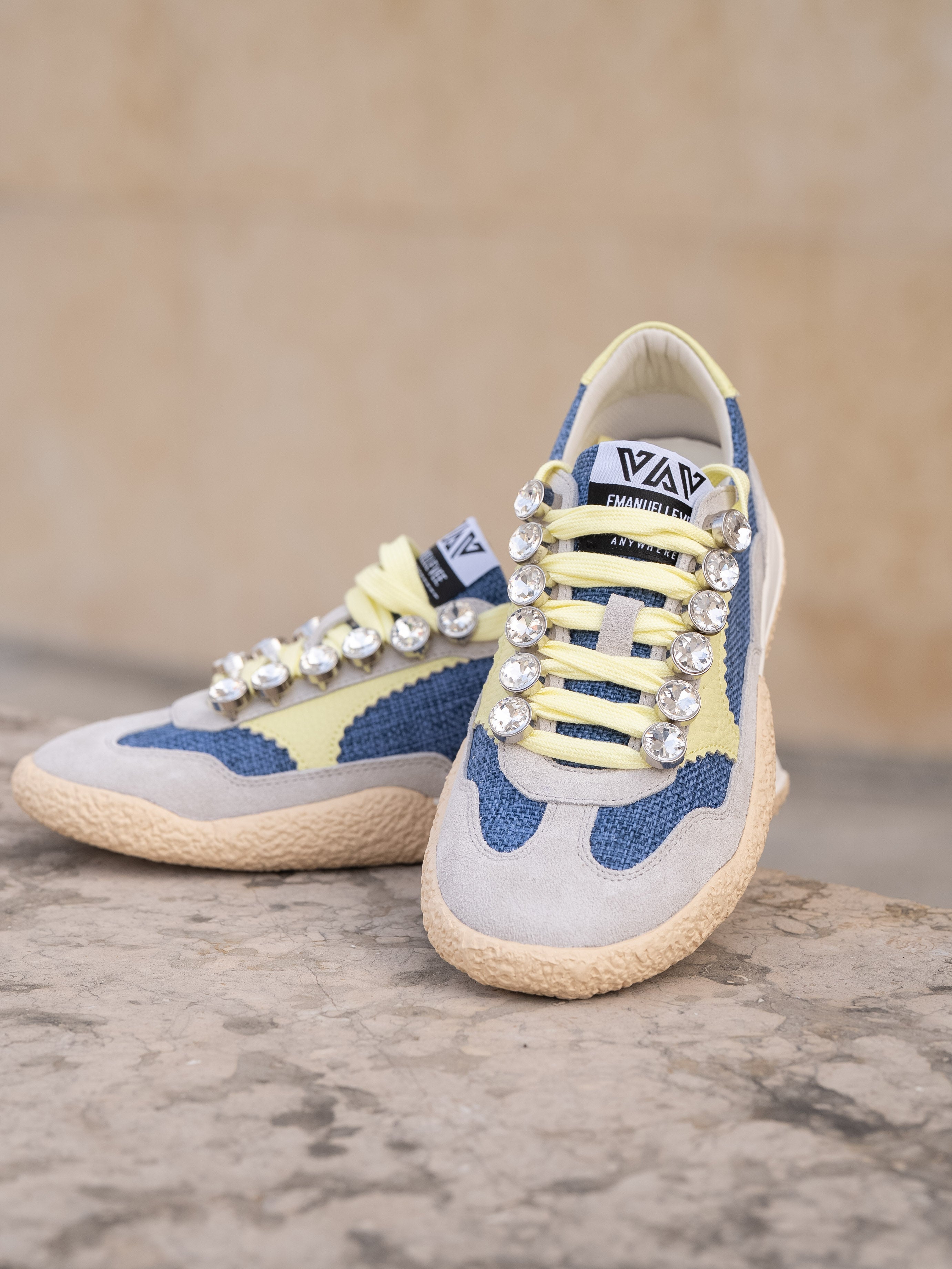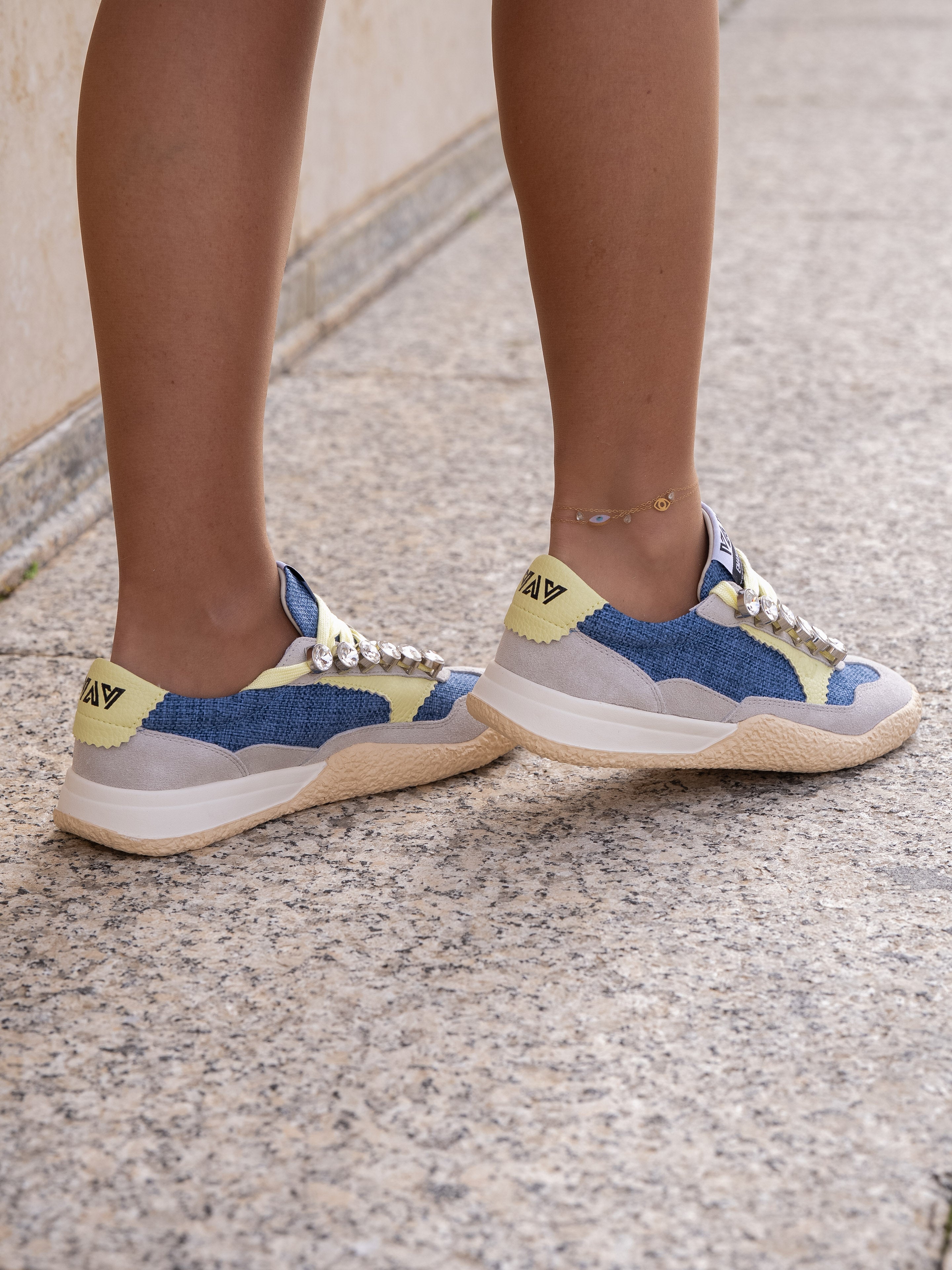 Lace-up sneakes in suede and canvas fabric, rhinestone detail and two-tone sole