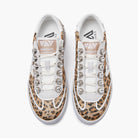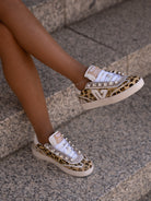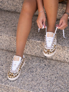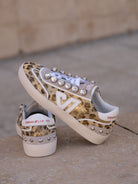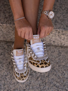 Leopard-textured pony skin box sneaker, rhinestone detail on the lacing and rubber sole.
