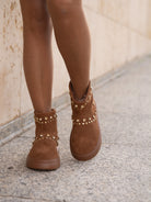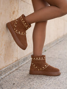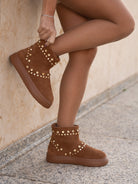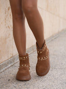 Suede ankle boot lined in faux fur, rhinestone and stud details, 30mm rubber sole