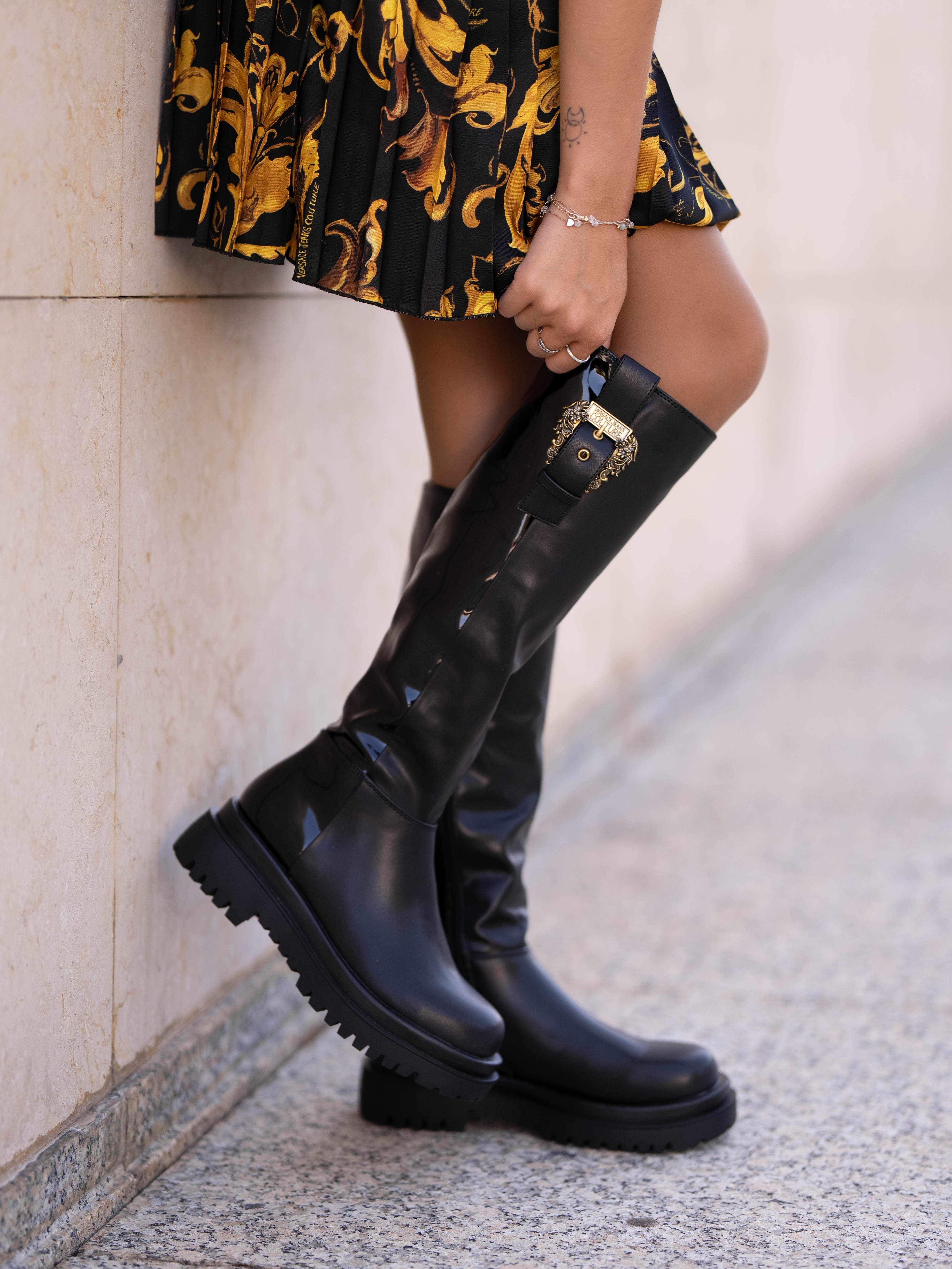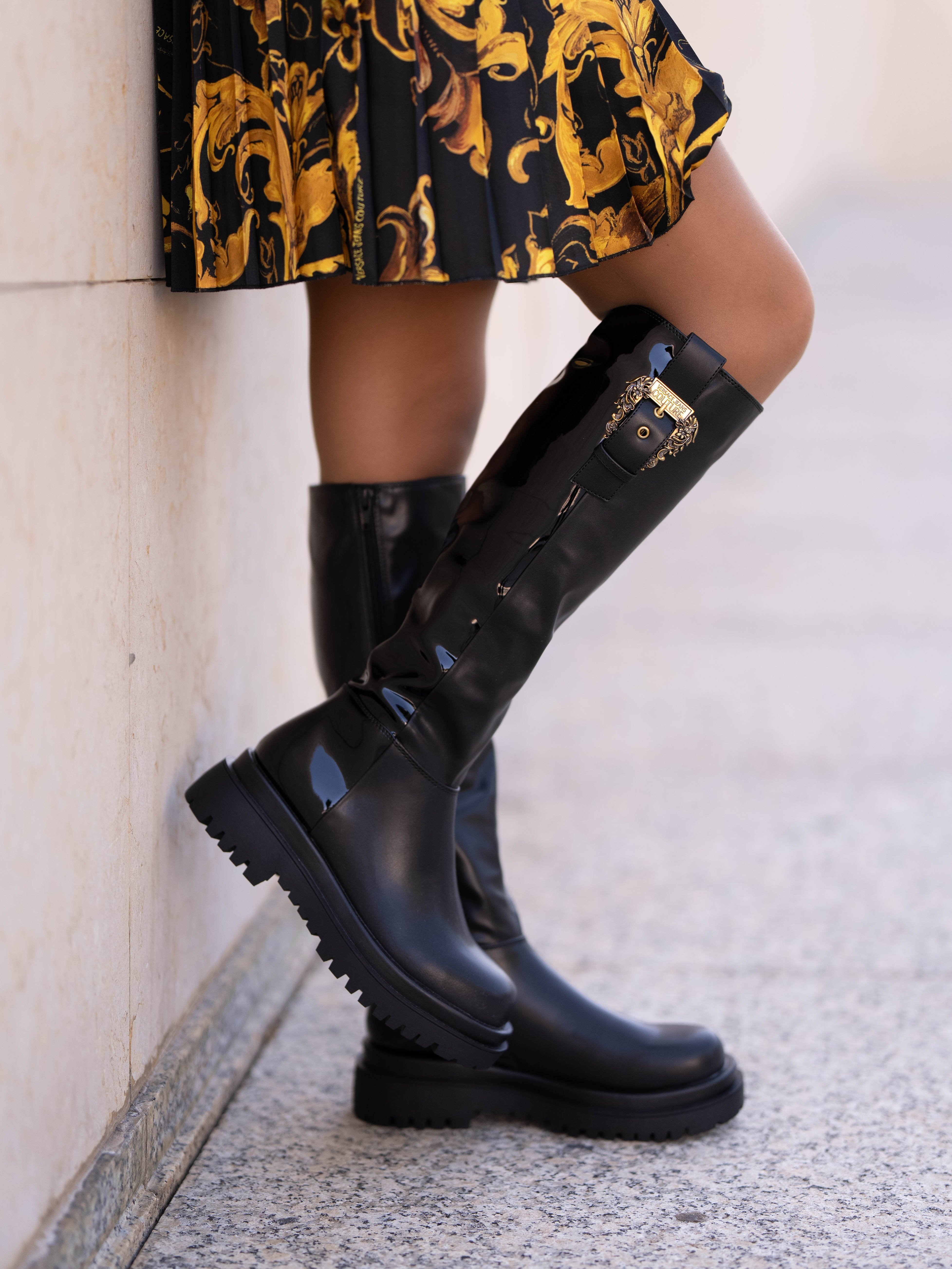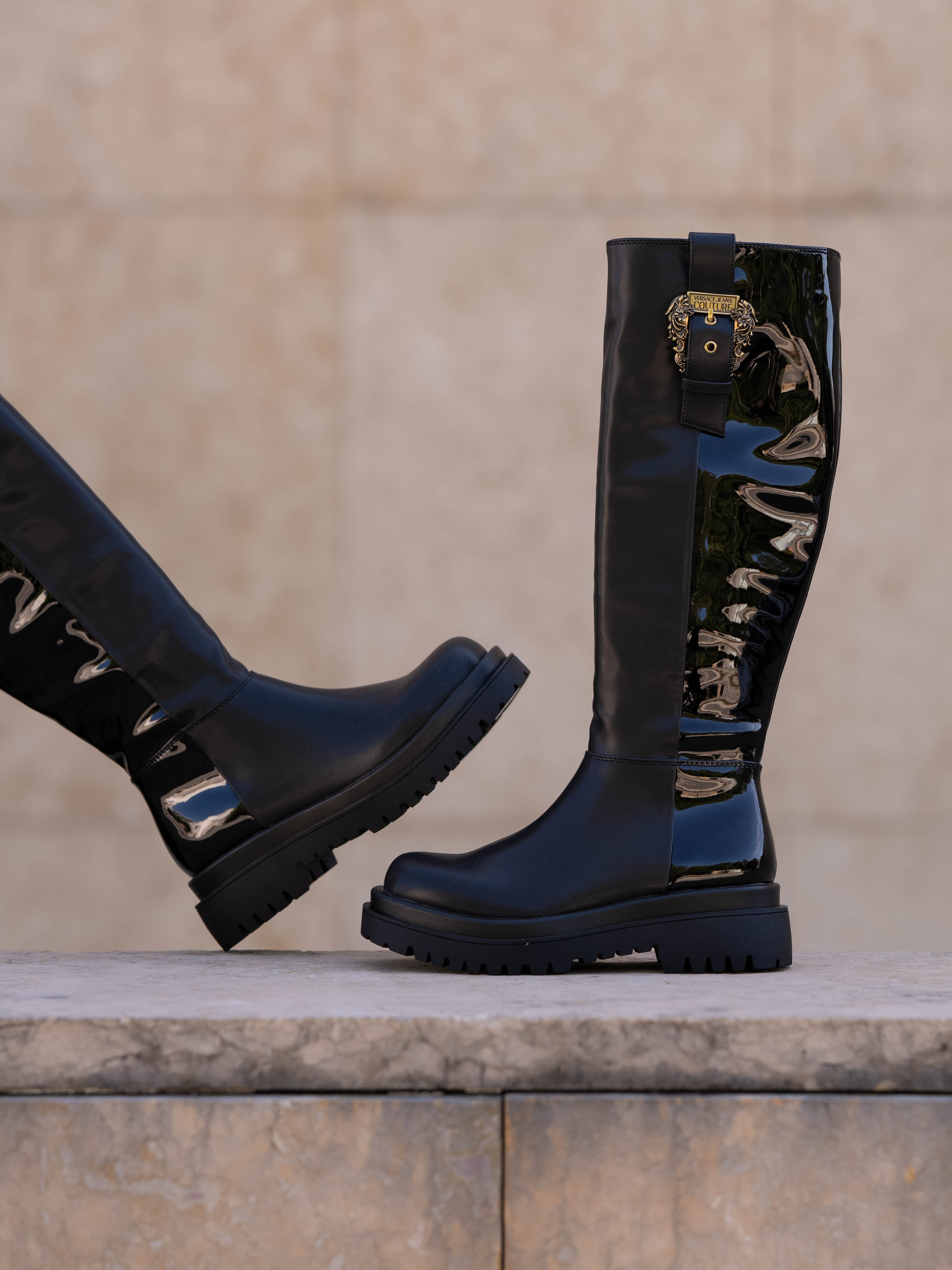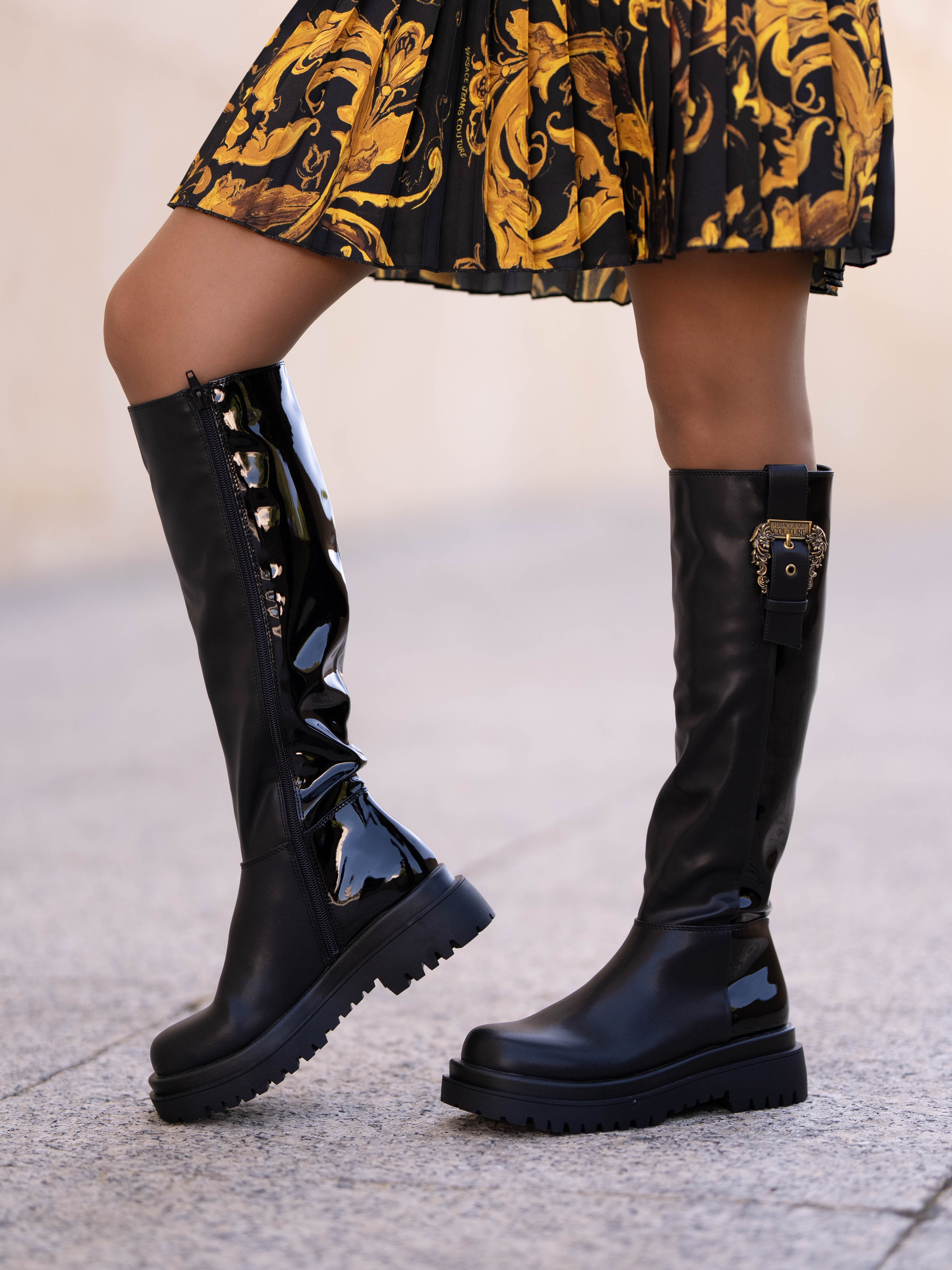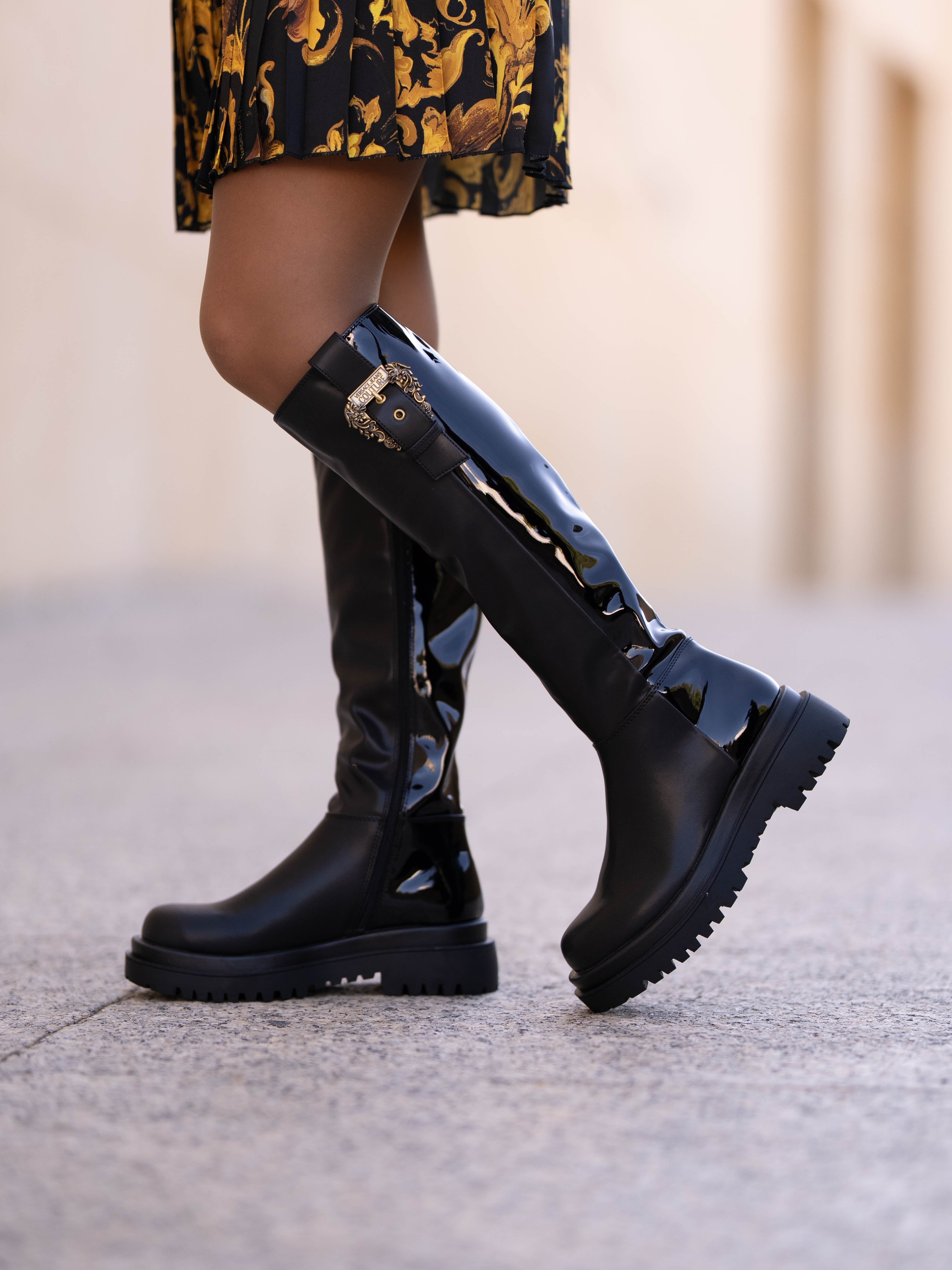 Black PU and Suede Mid-Calf Boot with Metal Harness Detail