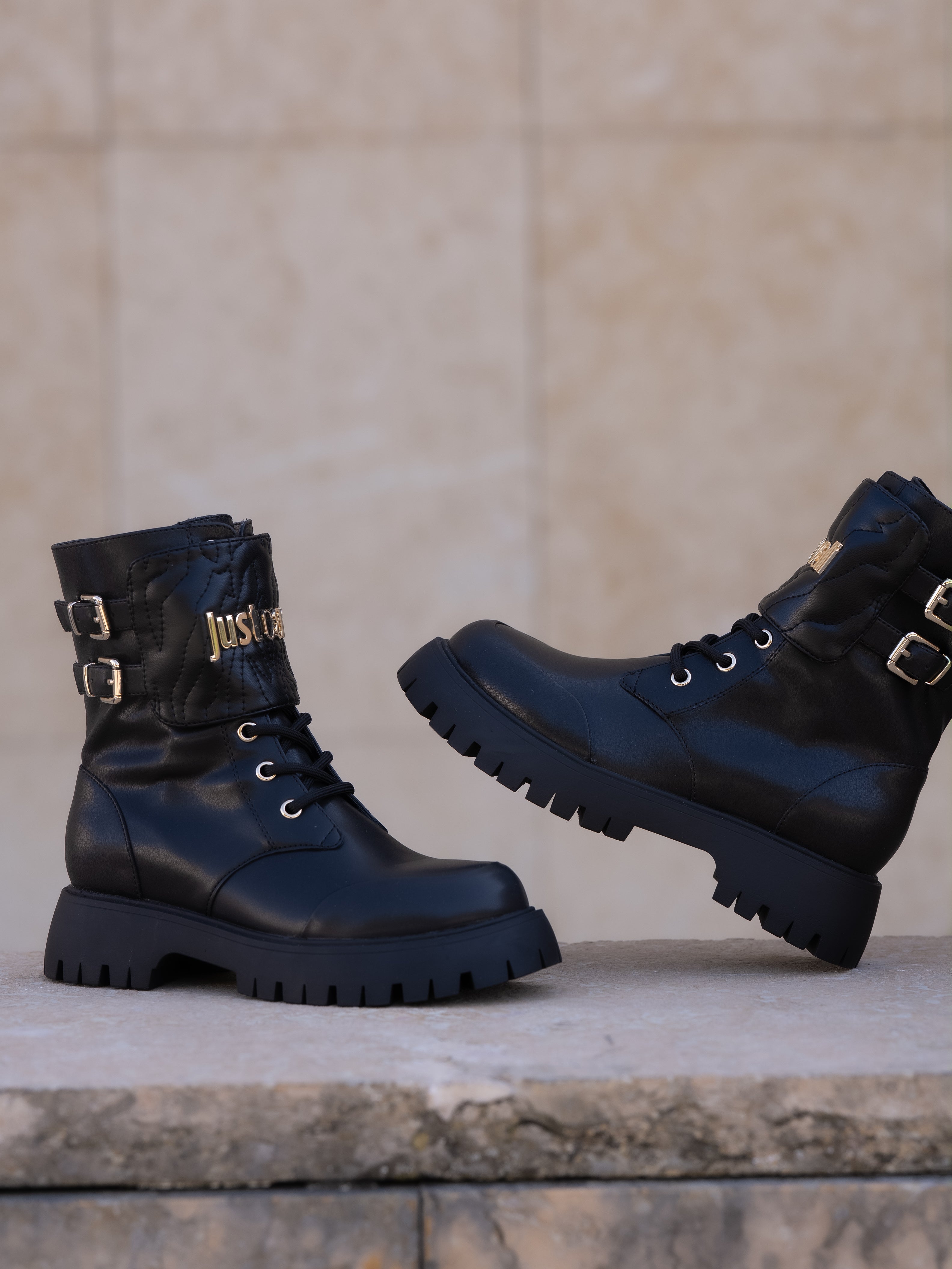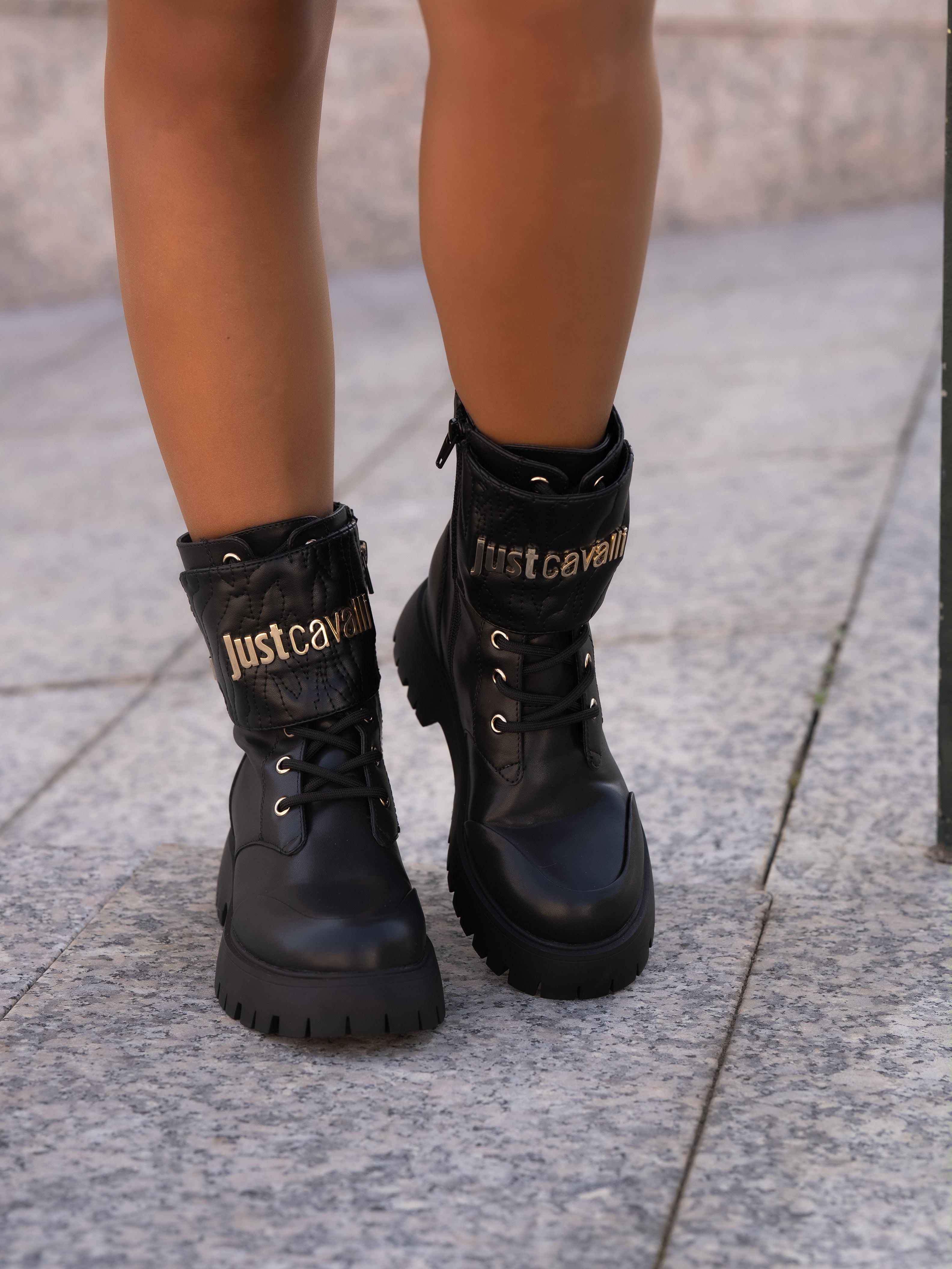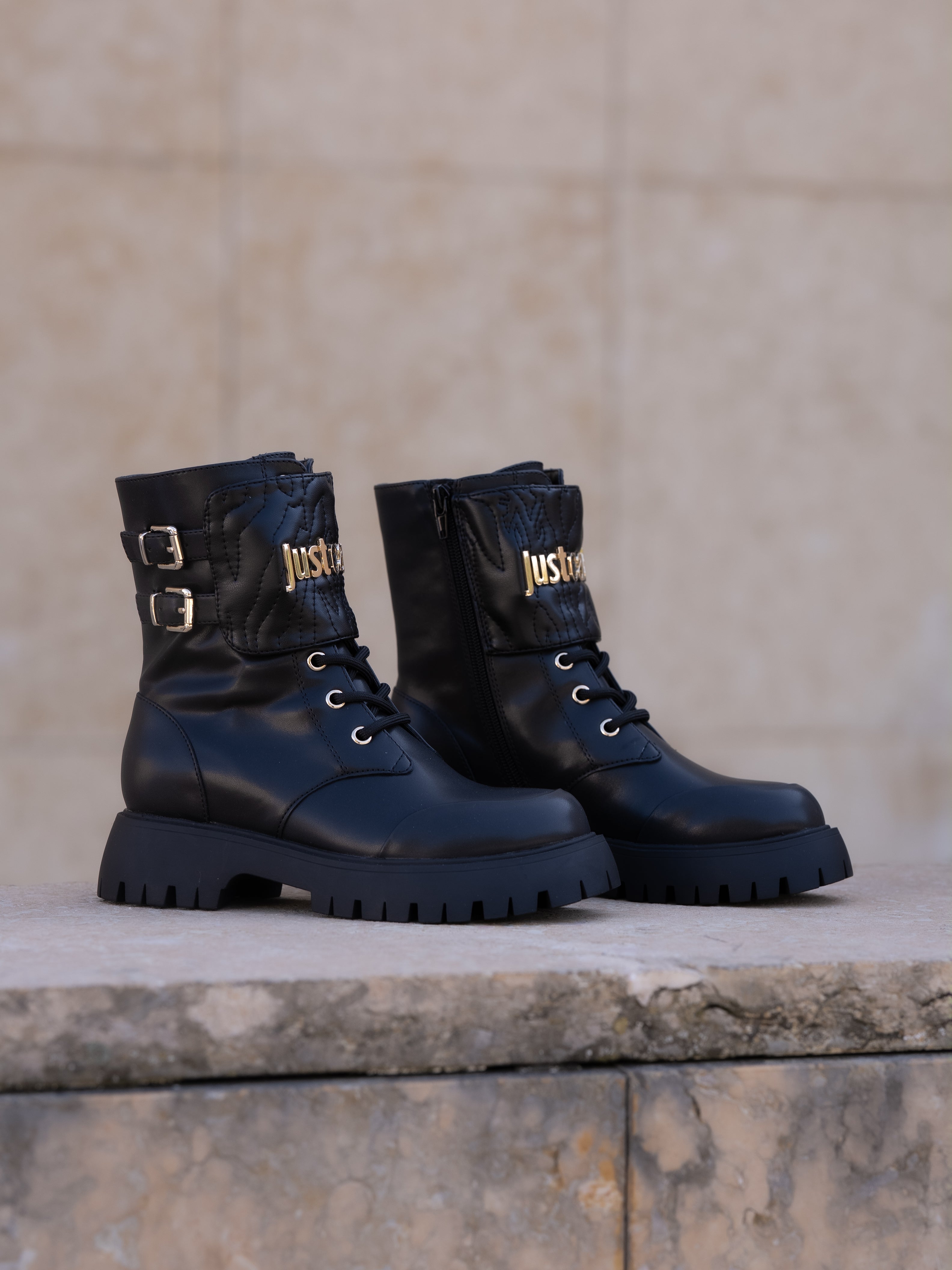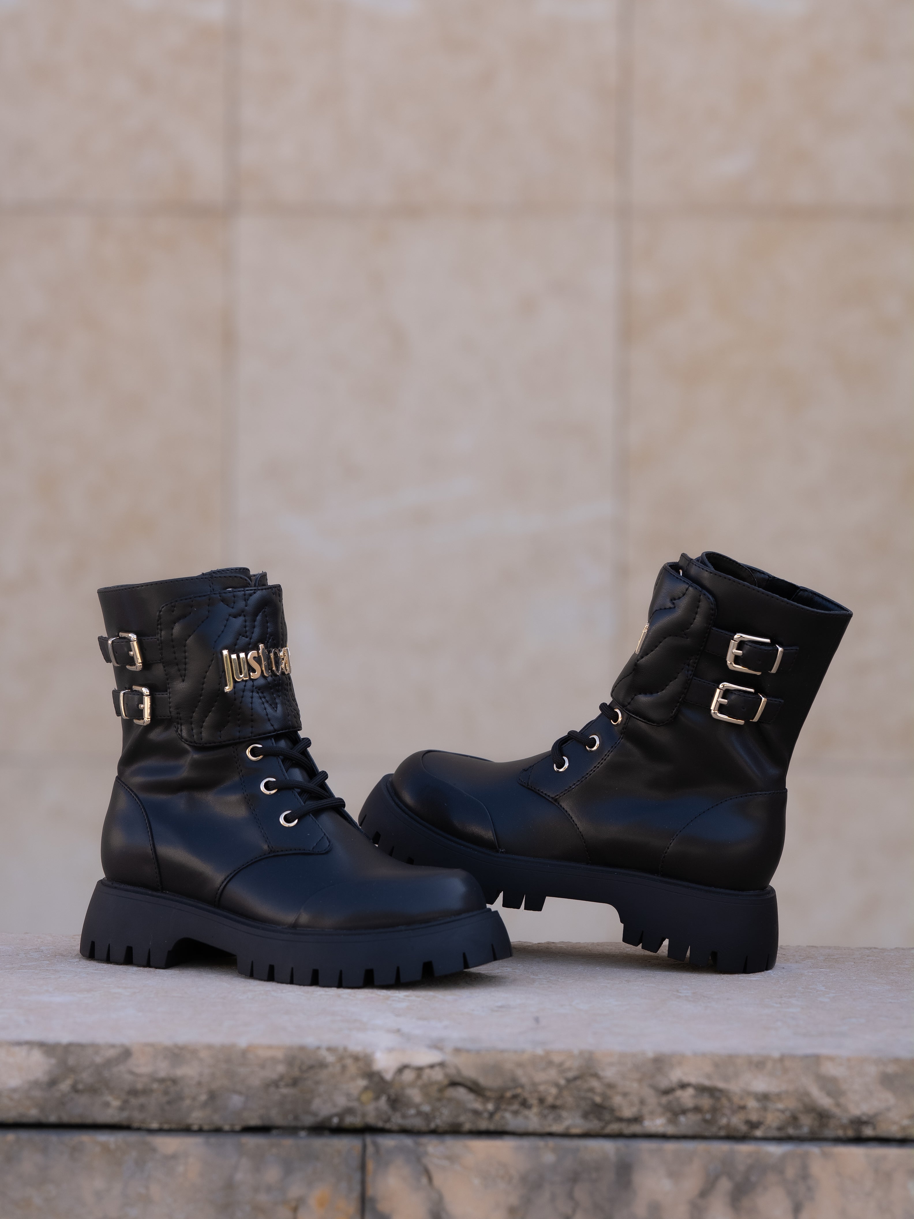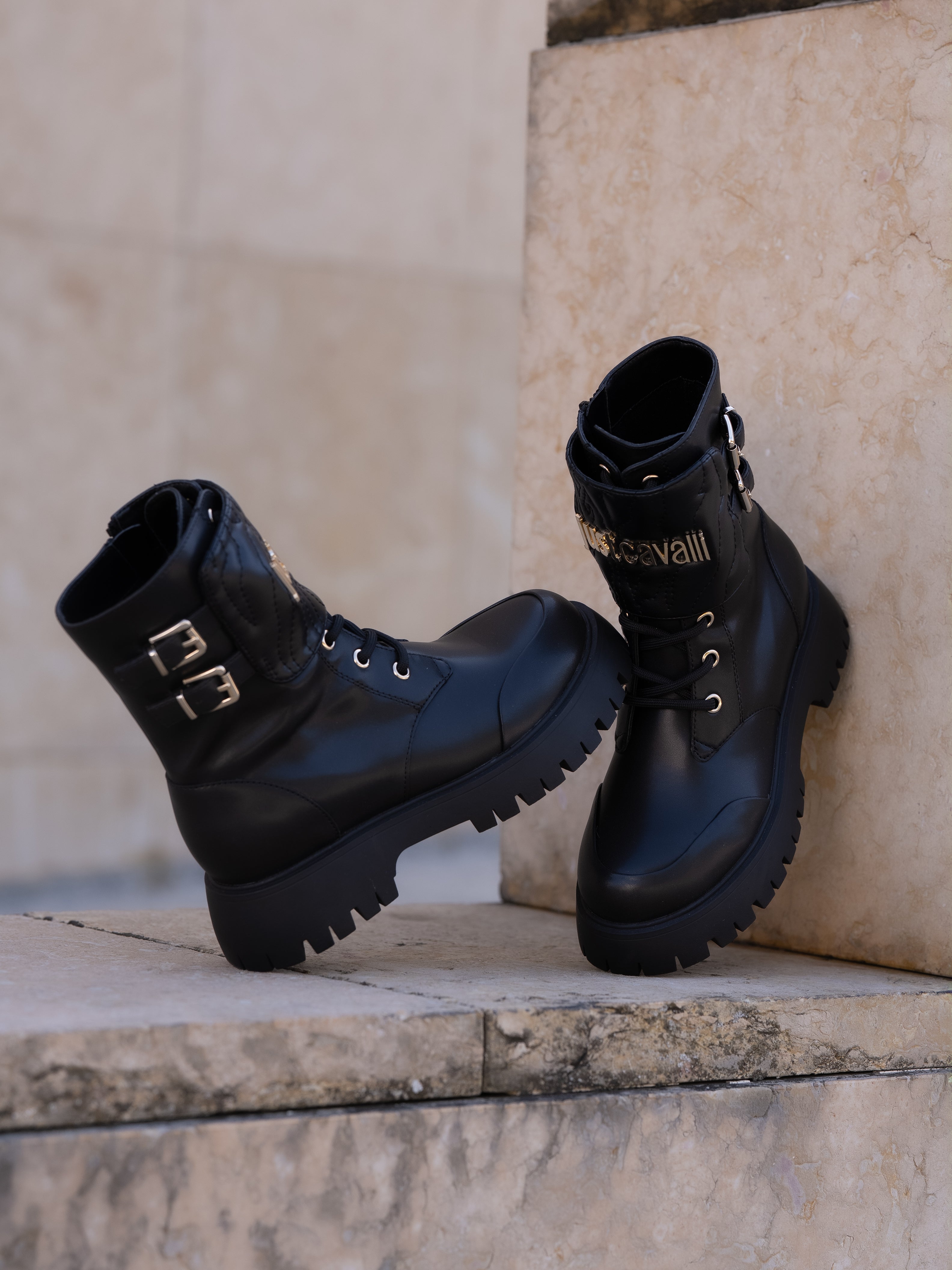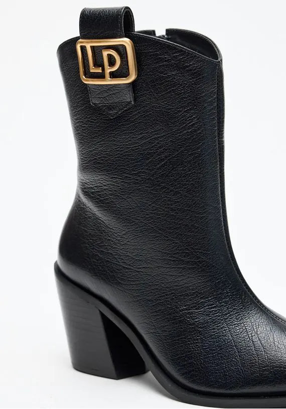 Black PU and Suede Mid-Calf Boot with Metal Harness Detail