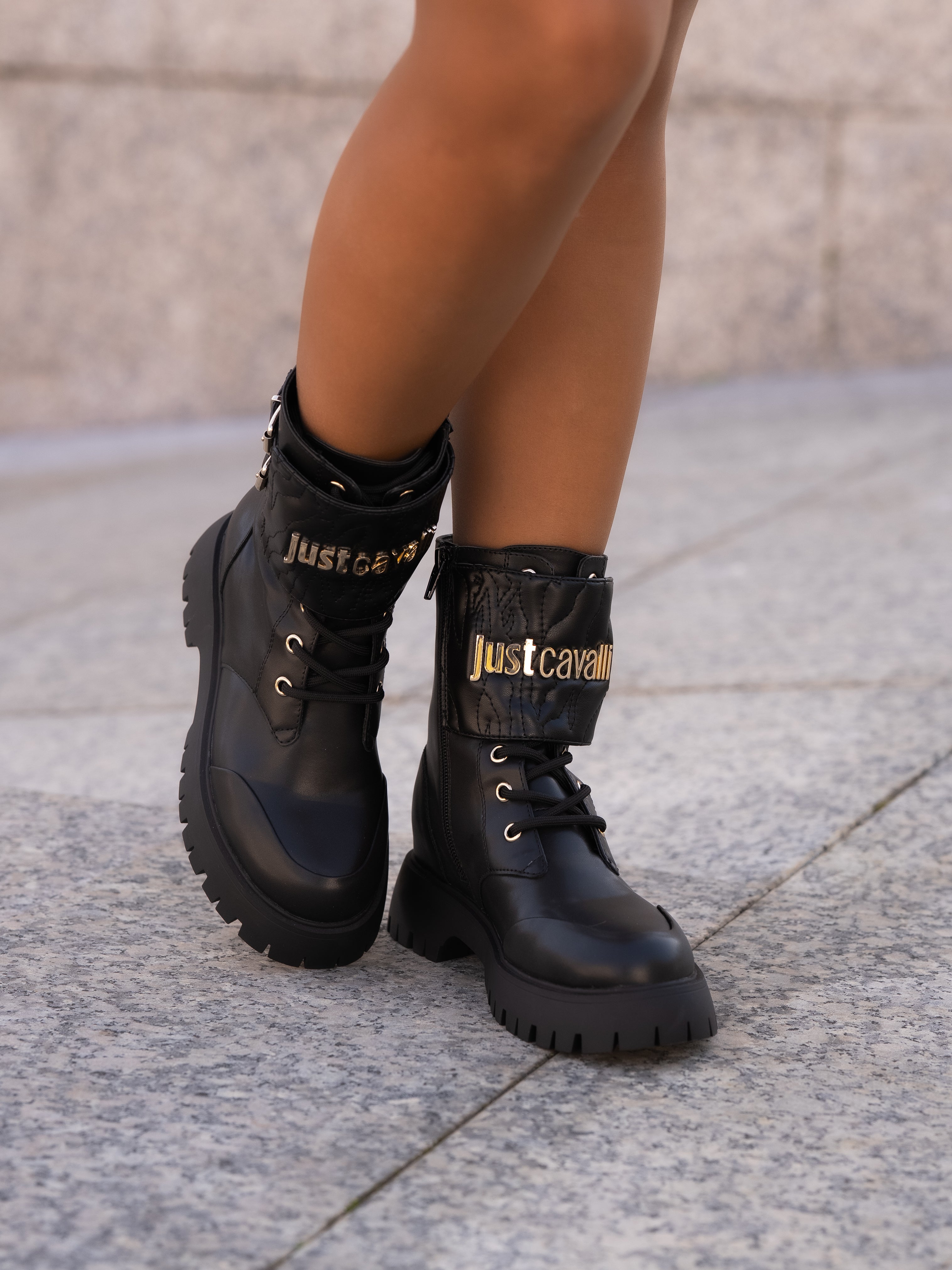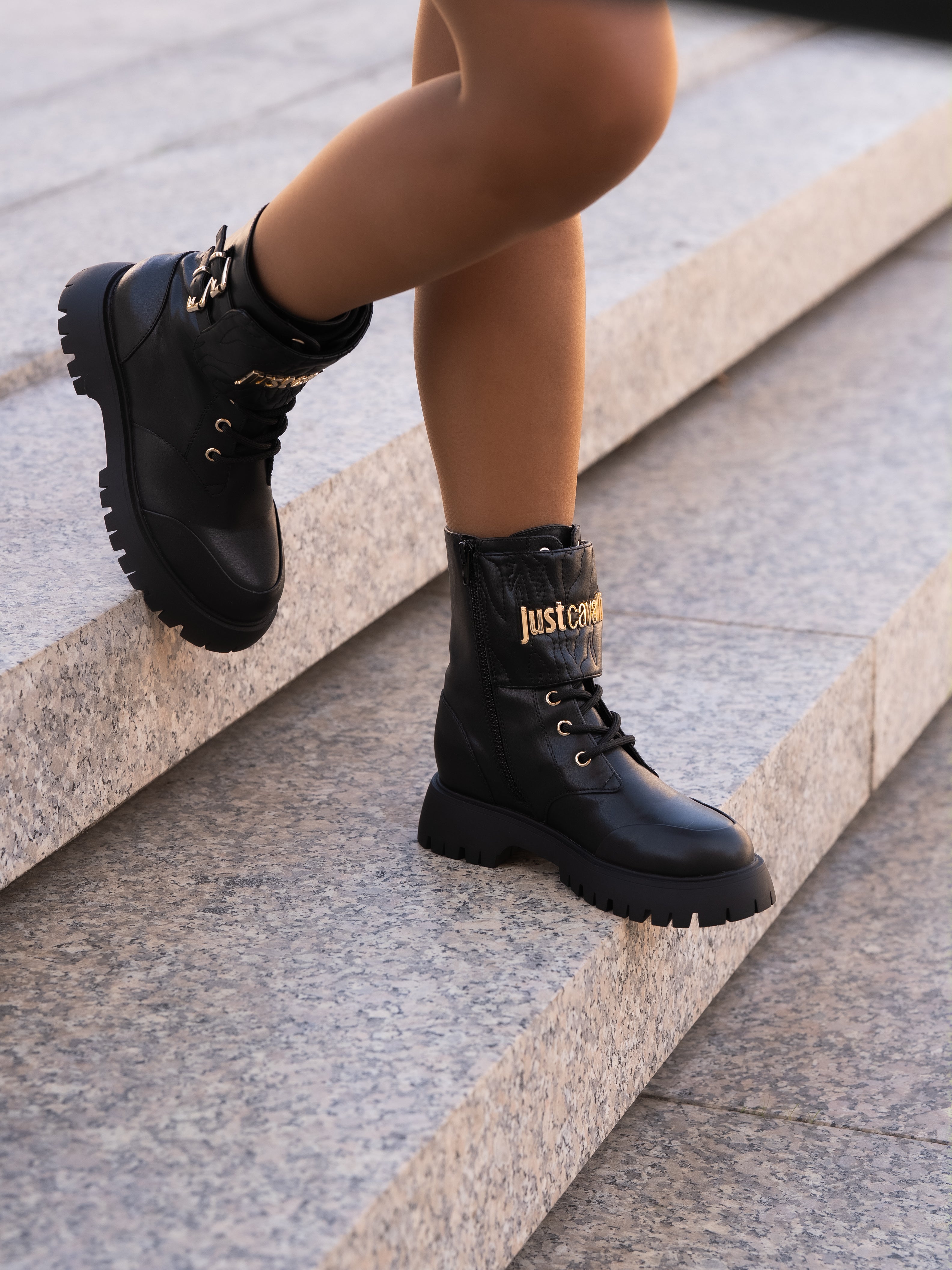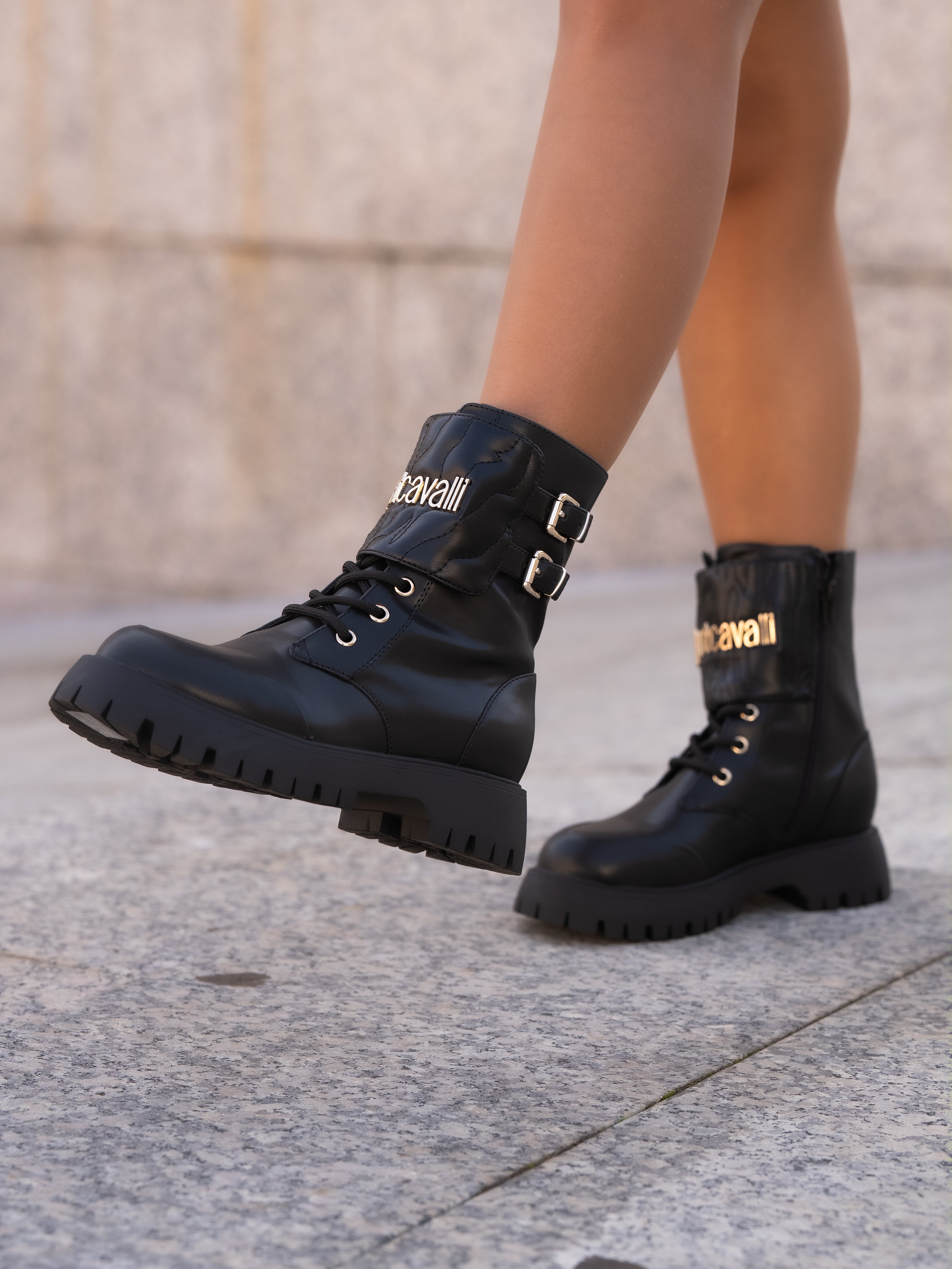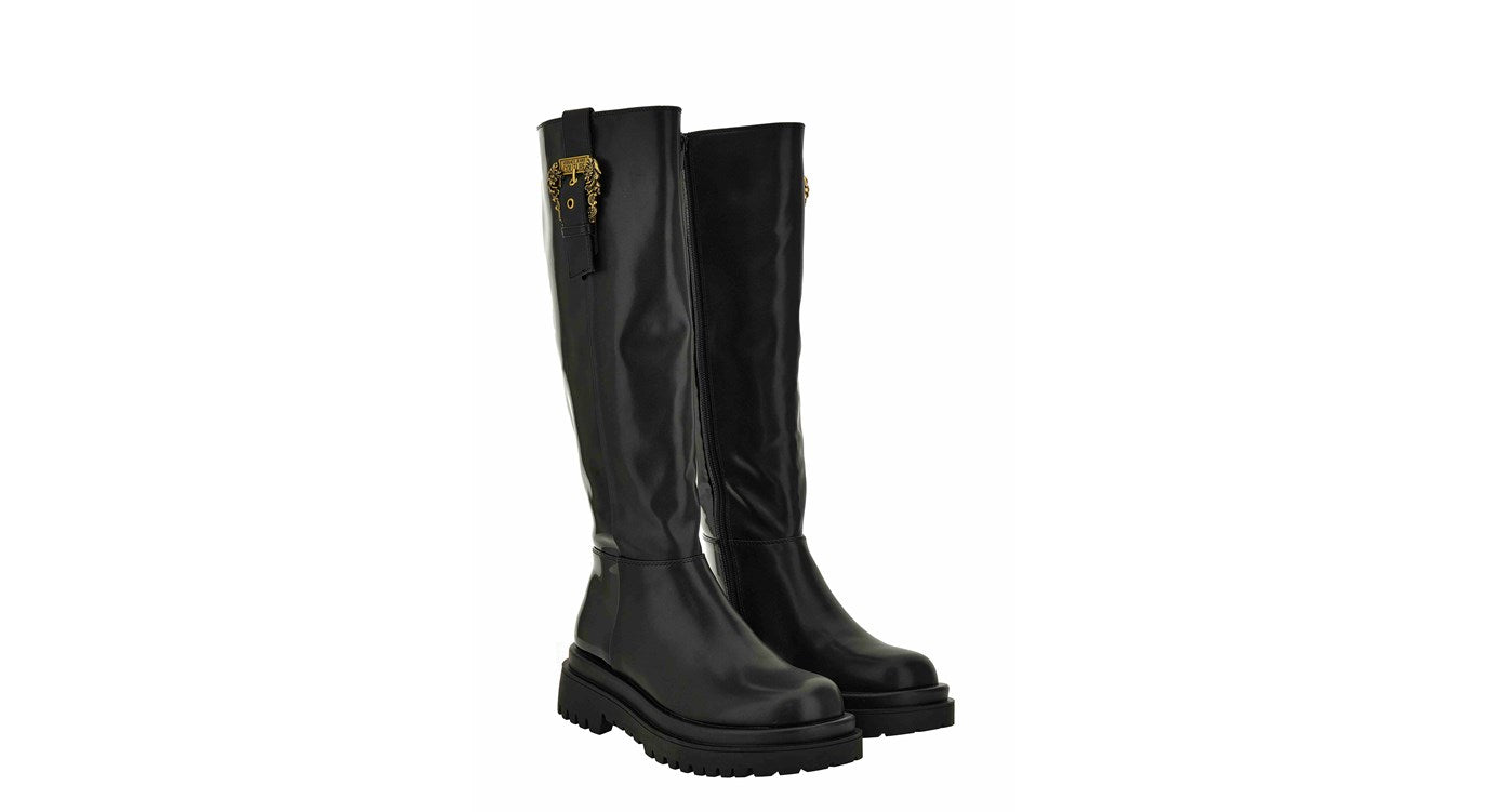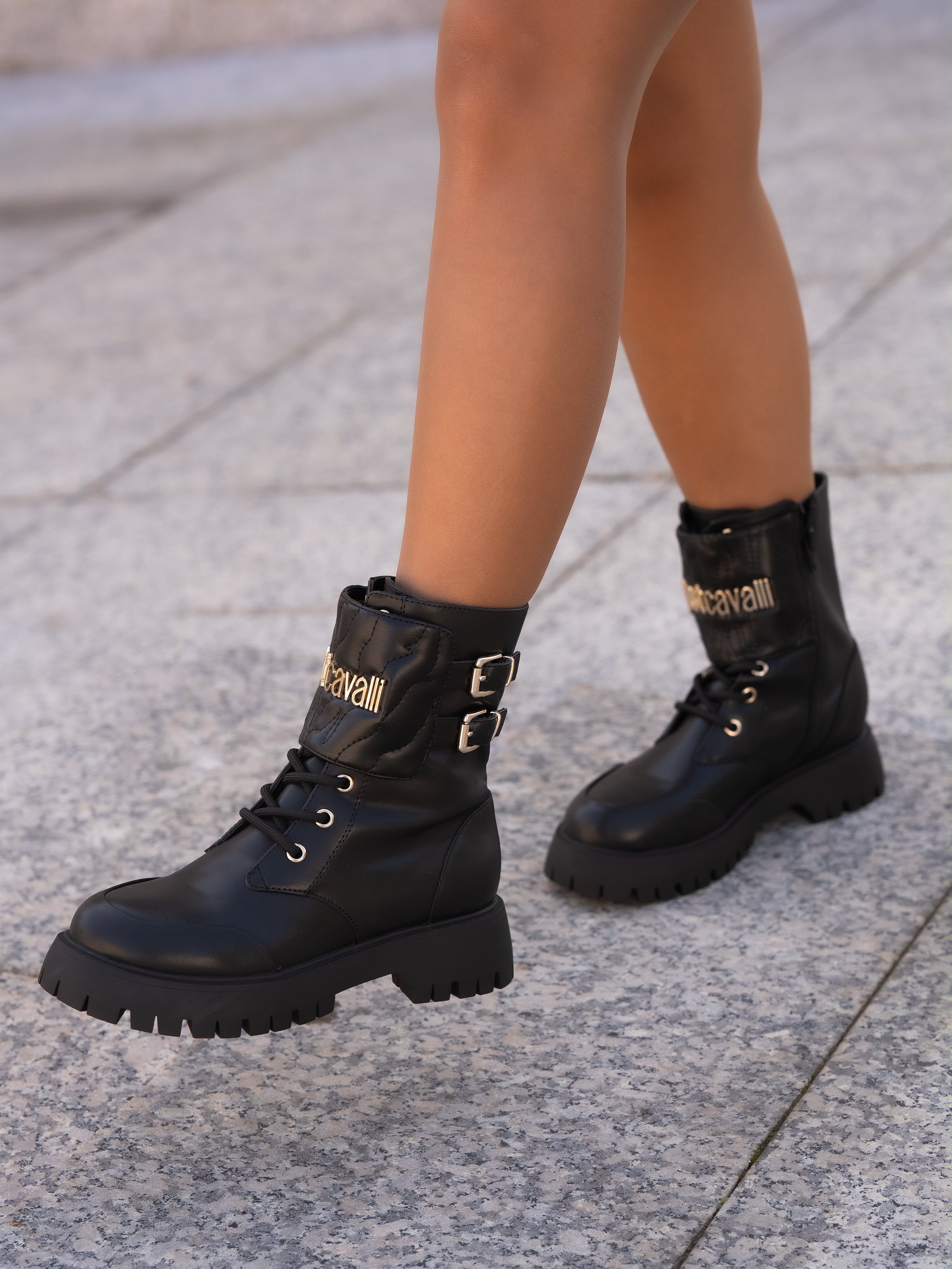 Black PU and Suede Mid-Calf Boot with Metal Harness Detail