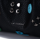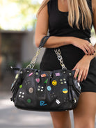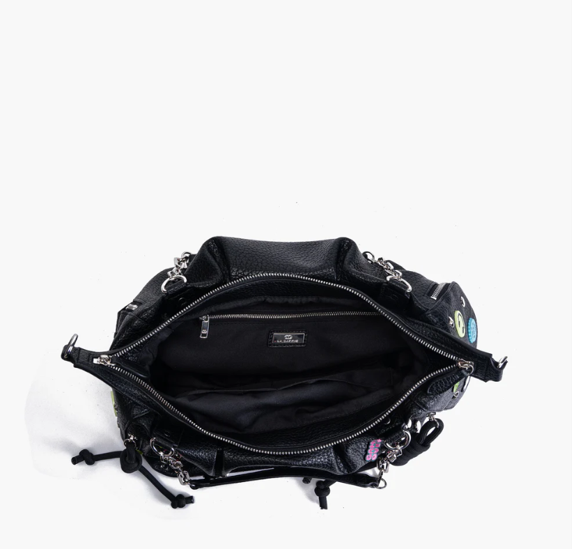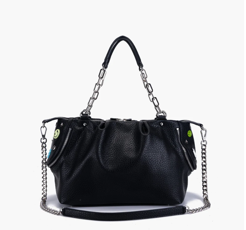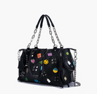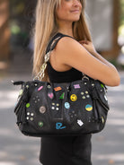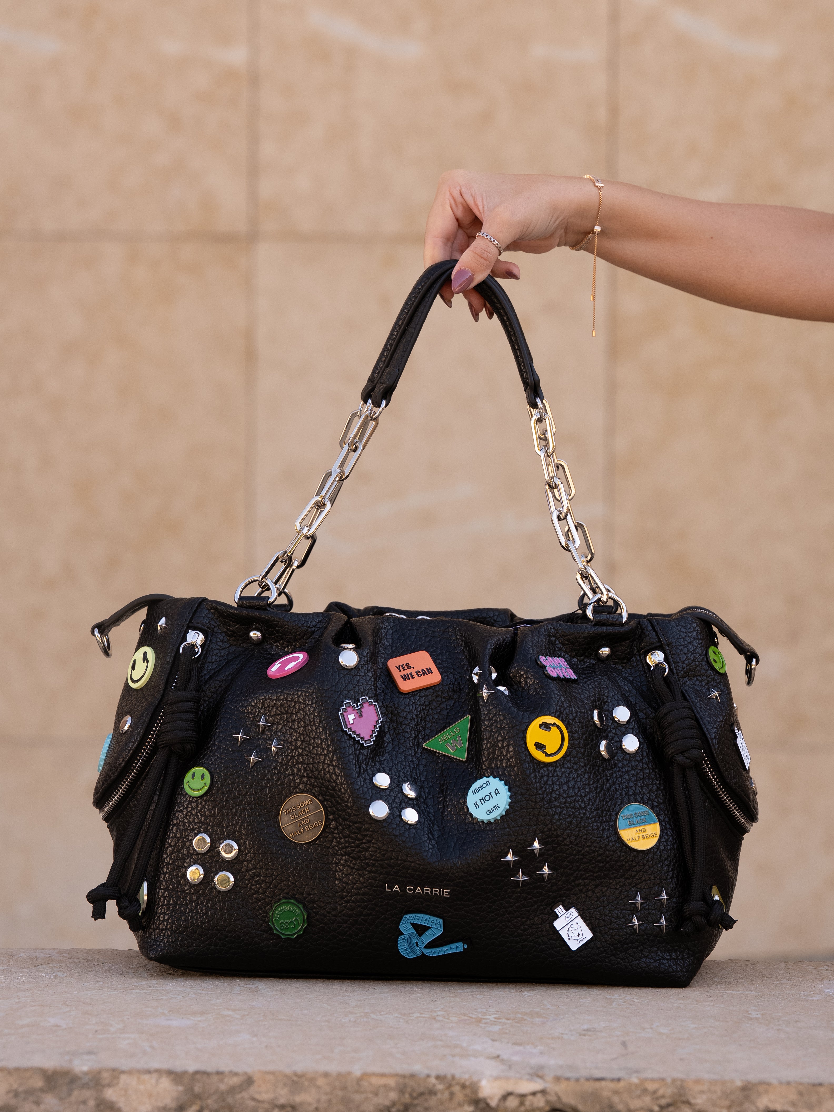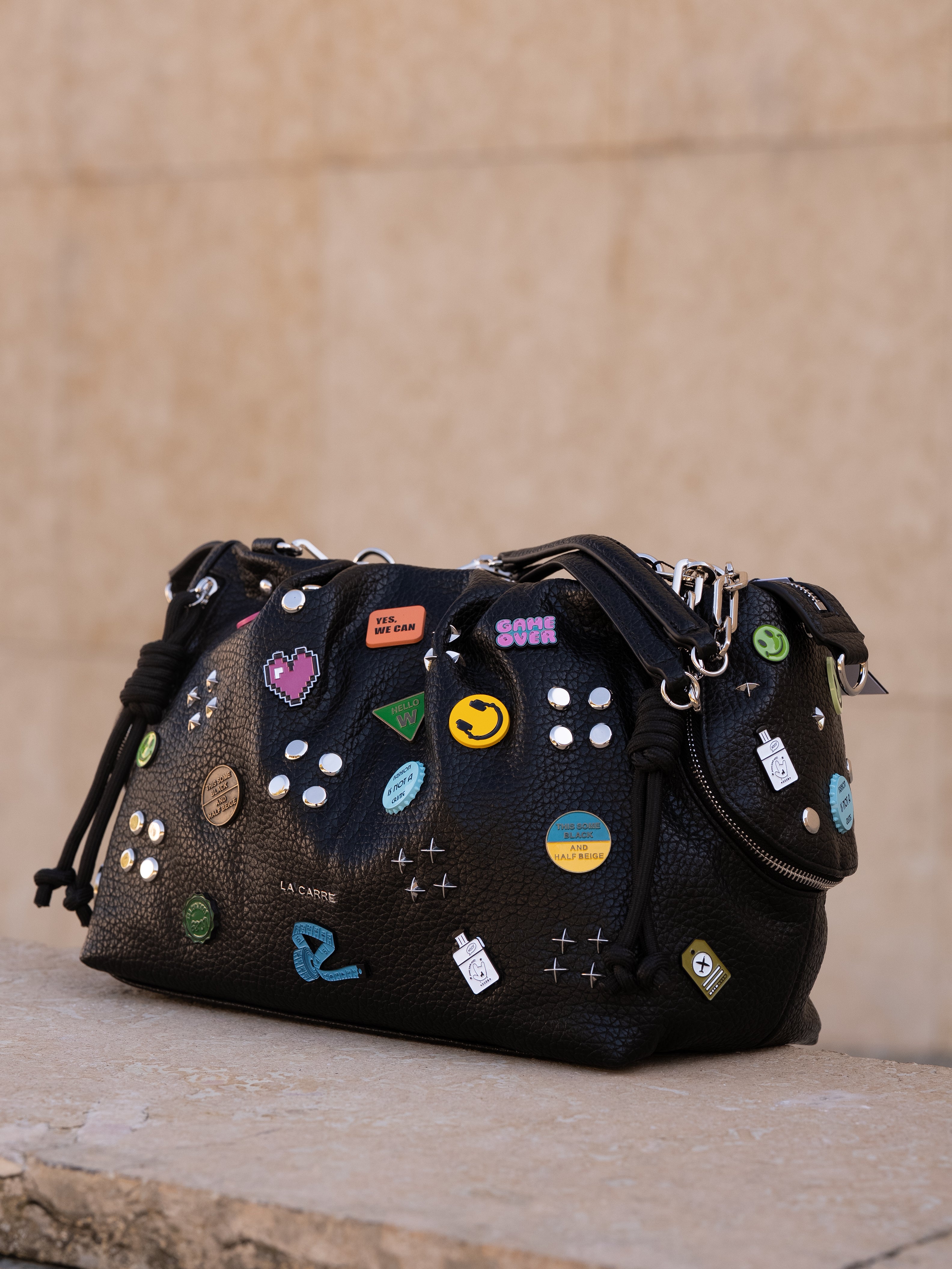 Shopping bag with double handles in hammered faux leather, featuring colorful applied pins and a zip closure.