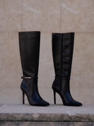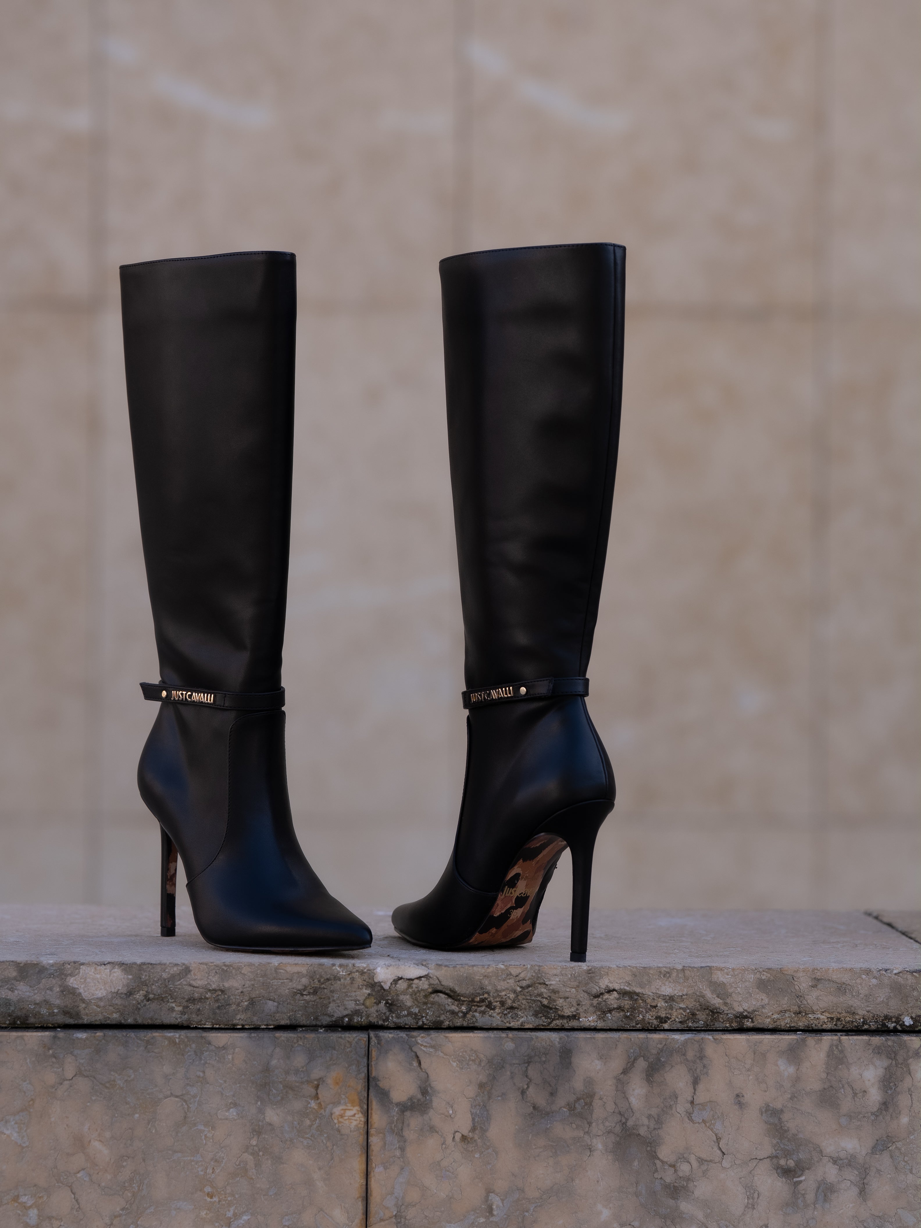 Turn heads with this striking knee-high boot from Just Cavalli, crafted in smooth black leather for a sleek and elegant silhouette. Featuring a pointed toe and a high stiletto heel, this boot exudes sophistication and bold femininity. A subtle branded strap with metallic Just Cavalli lettering adds a luxurious touch around the ankle. The highlight? A surprise animal print sole that delivers an unexpected edge and a signature Cavalli flair. Perfect for elevating your evening look or making a statement with everyday outfits.