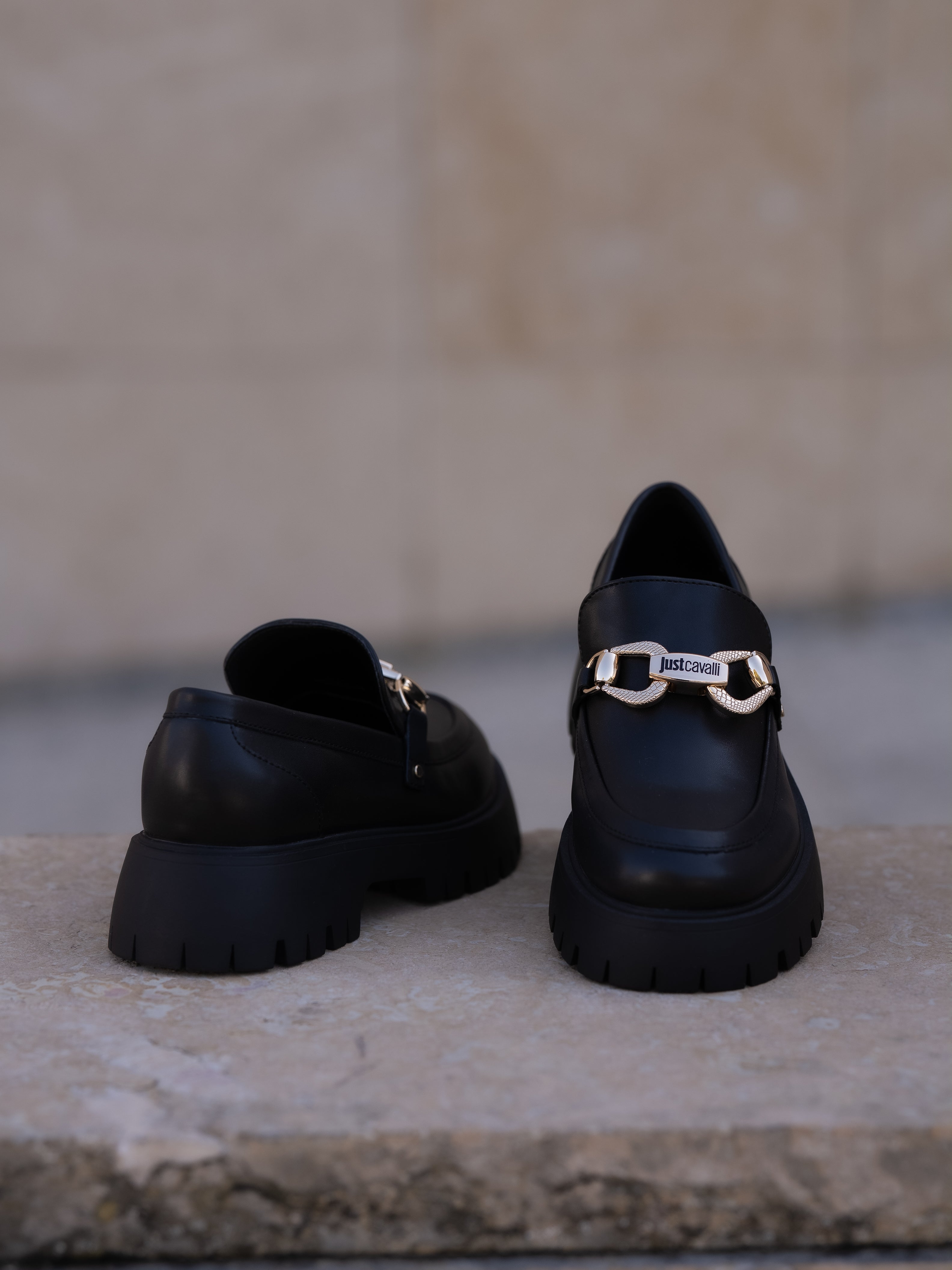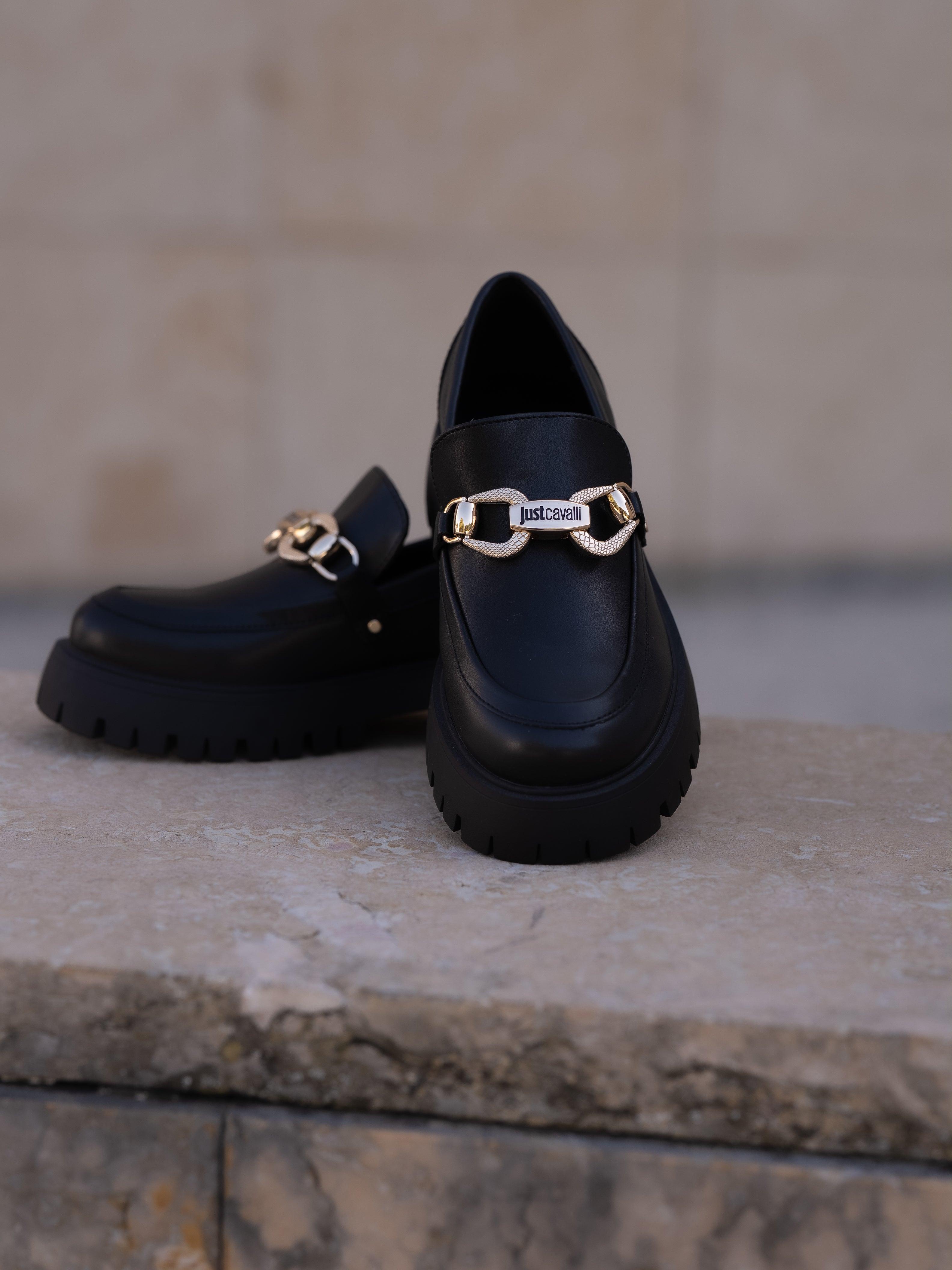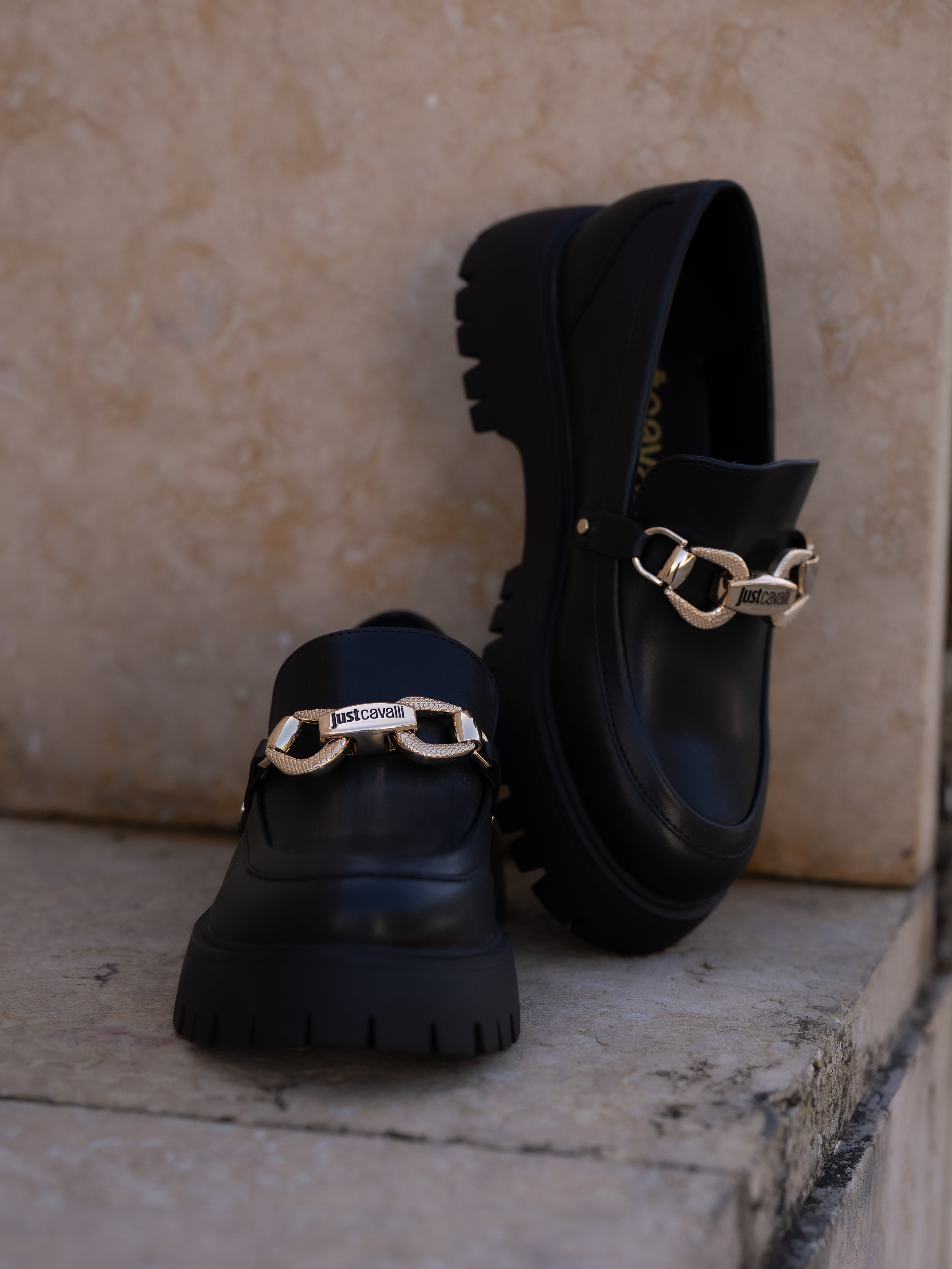 Make a bold statement with this Just Cavalli chunky loafer, designed for those who love to combine elegance with edge. Crafted from sleek black leather, this moccasin features a rugged, thick rubber sole for a modern, urban twist on a classic silhouette. The standout detail is the gold-toned chain across the upper, adding a touch of luxury and signature Cavalli flair. Comfortable, durable, and stylish—this loafer is perfect for elevating your everyday outfits with a hint of attitude.