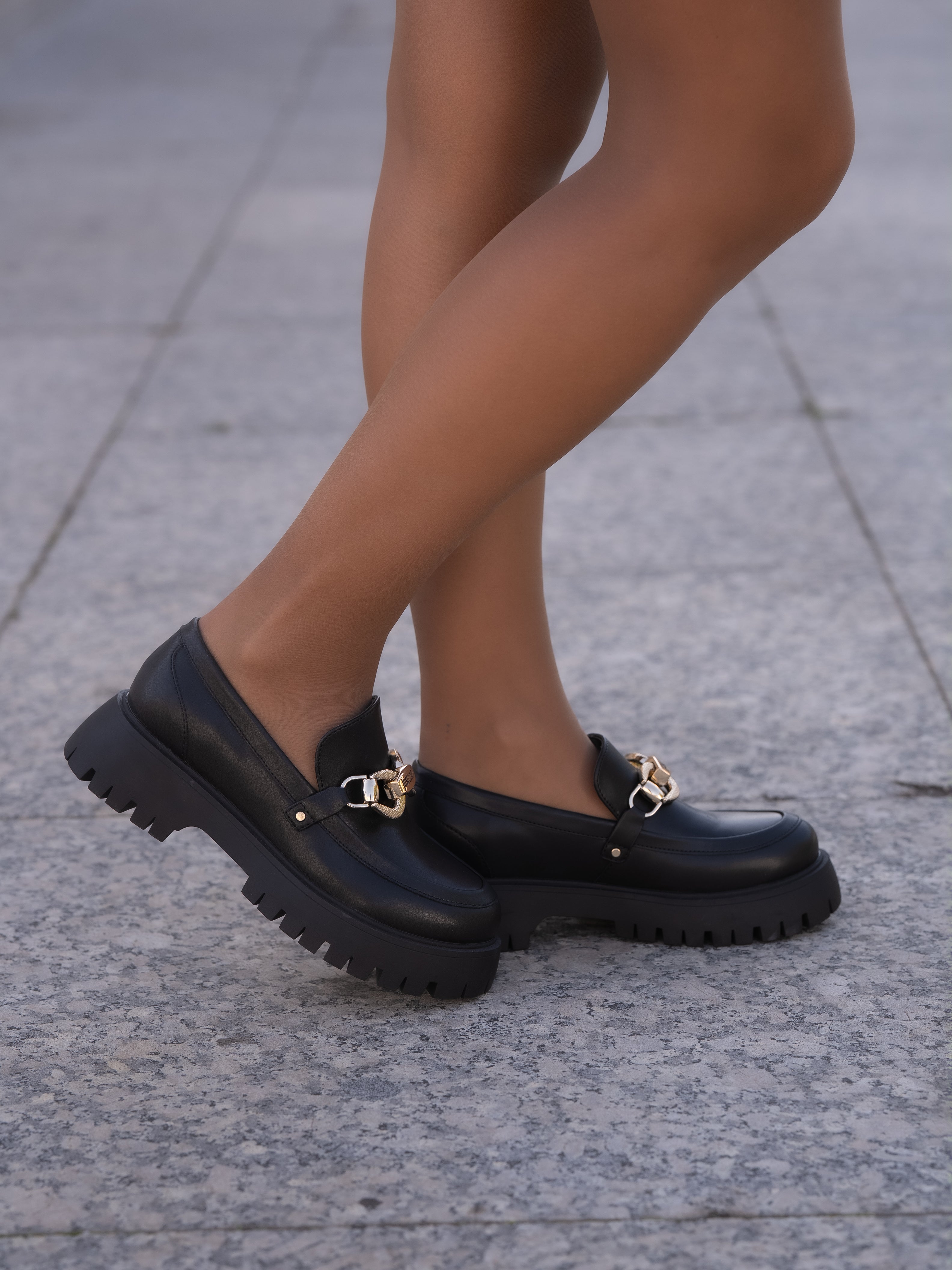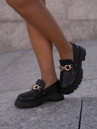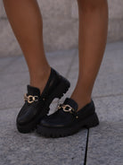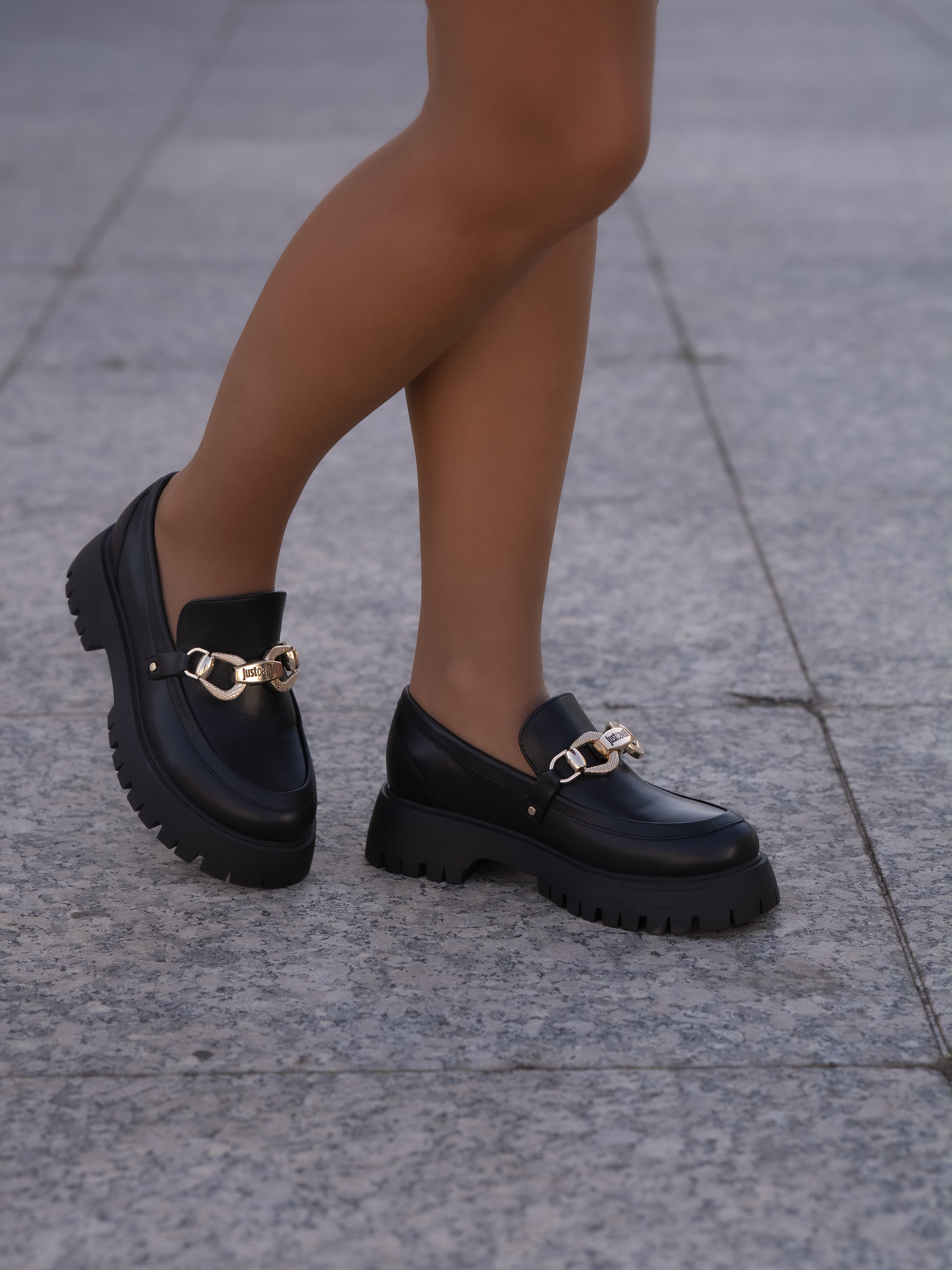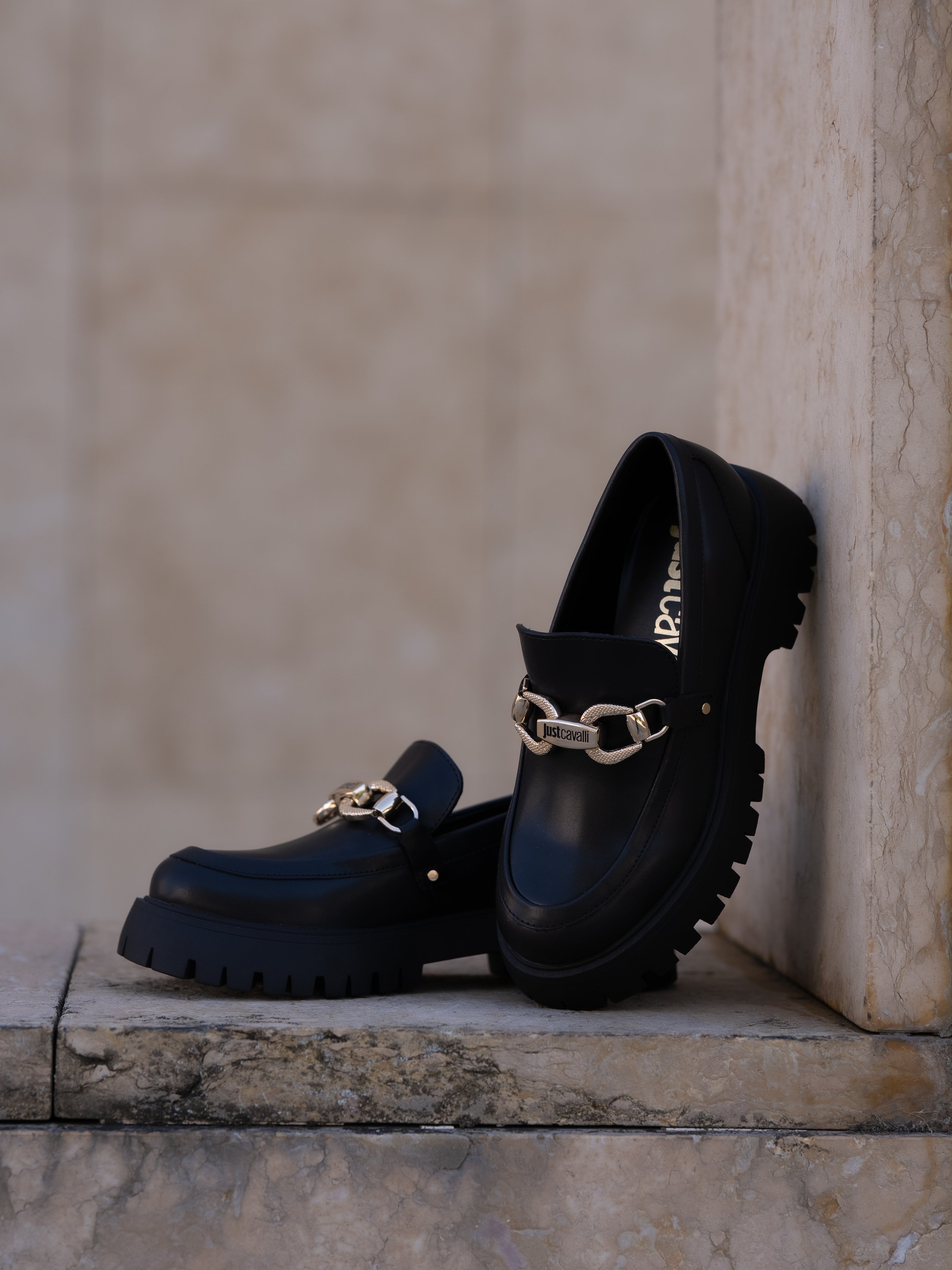 Make a bold statement with this Just Cavalli chunky loafer, designed for those who love to combine elegance with edge. Crafted from sleek black leather, this moccasin features a rugged, thick rubber sole for a modern, urban twist on a classic silhouette. The standout detail is the gold-toned chain across the upper, adding a touch of luxury and signature Cavalli flair. Comfortable, durable, and stylish—this loafer is perfect for elevating your everyday outfits with a hint of attitude.