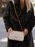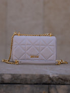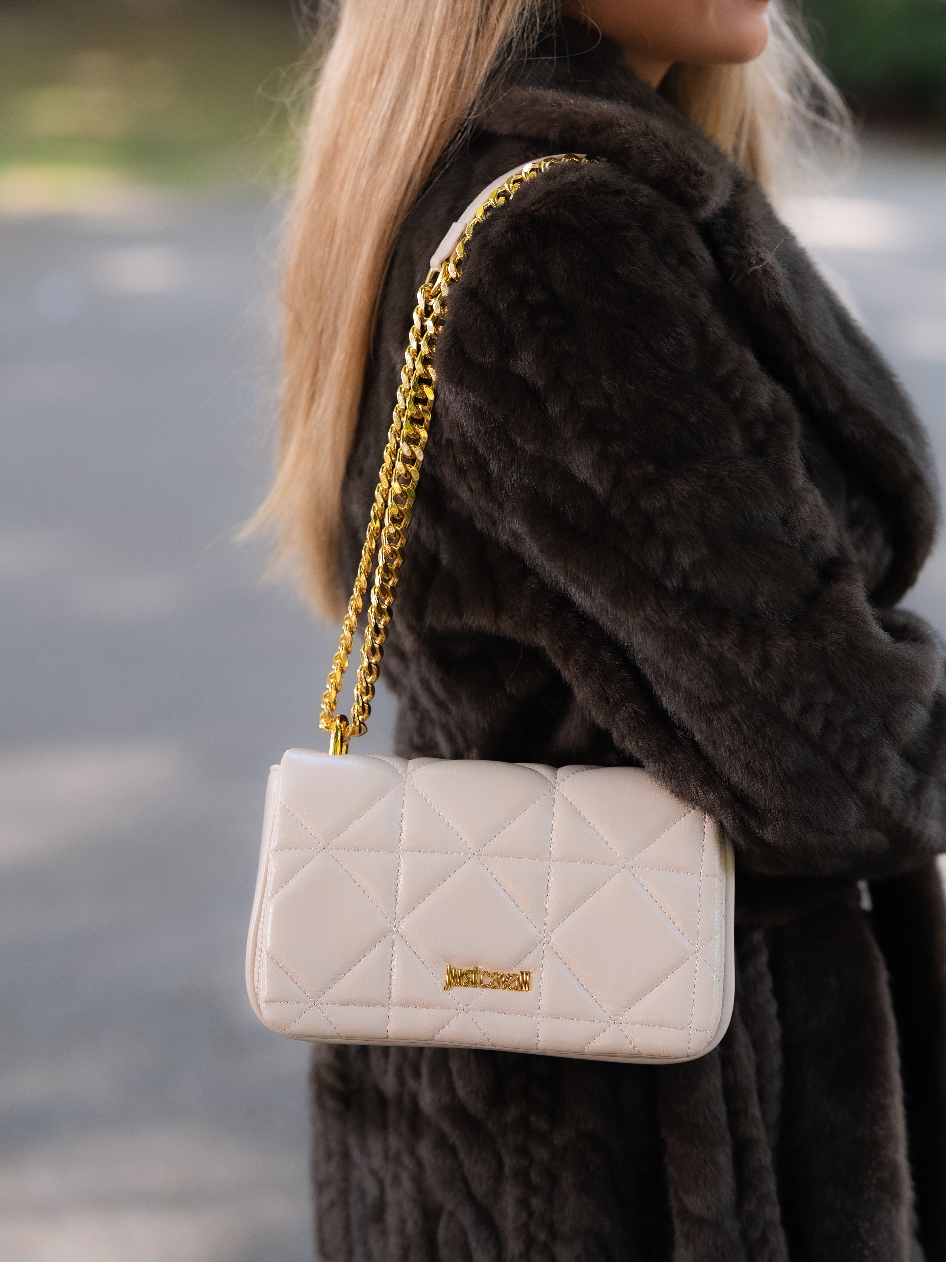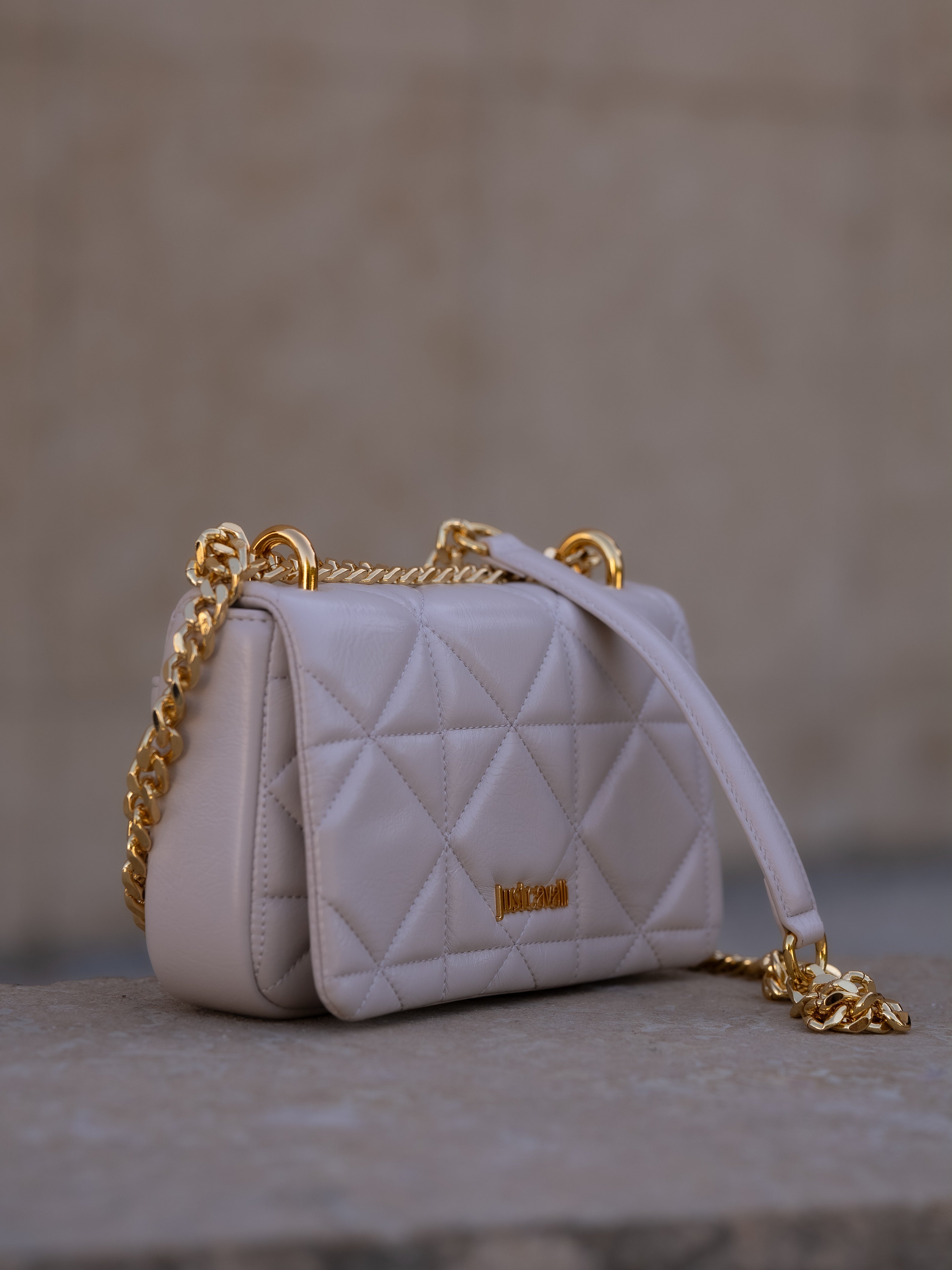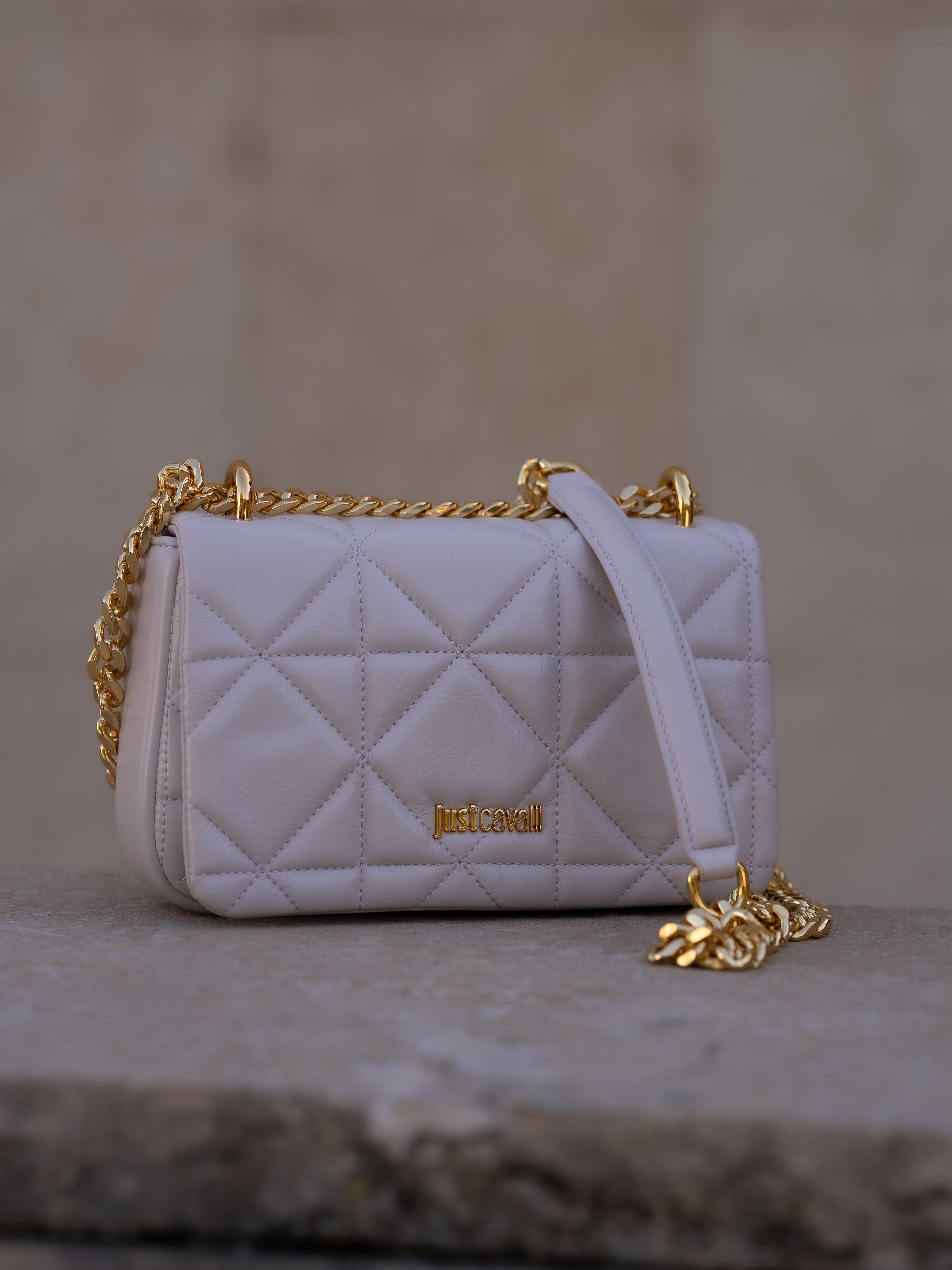 A sophisticated white quilted shoulder bag by Just Cavalli, crafted with a sleek rectangular silhouette. It features gold-tone chain straps interwoven with leather for a chic touch, along with the Just Cavalli logo on the front. Compact yet elegant, this bag is ideal for evening outings or elevating daytime looks.