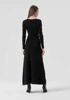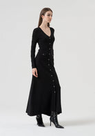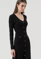 Long knitted dress slim fit. V-neck drop, small buttons on the front, flared skirt and long sleeves