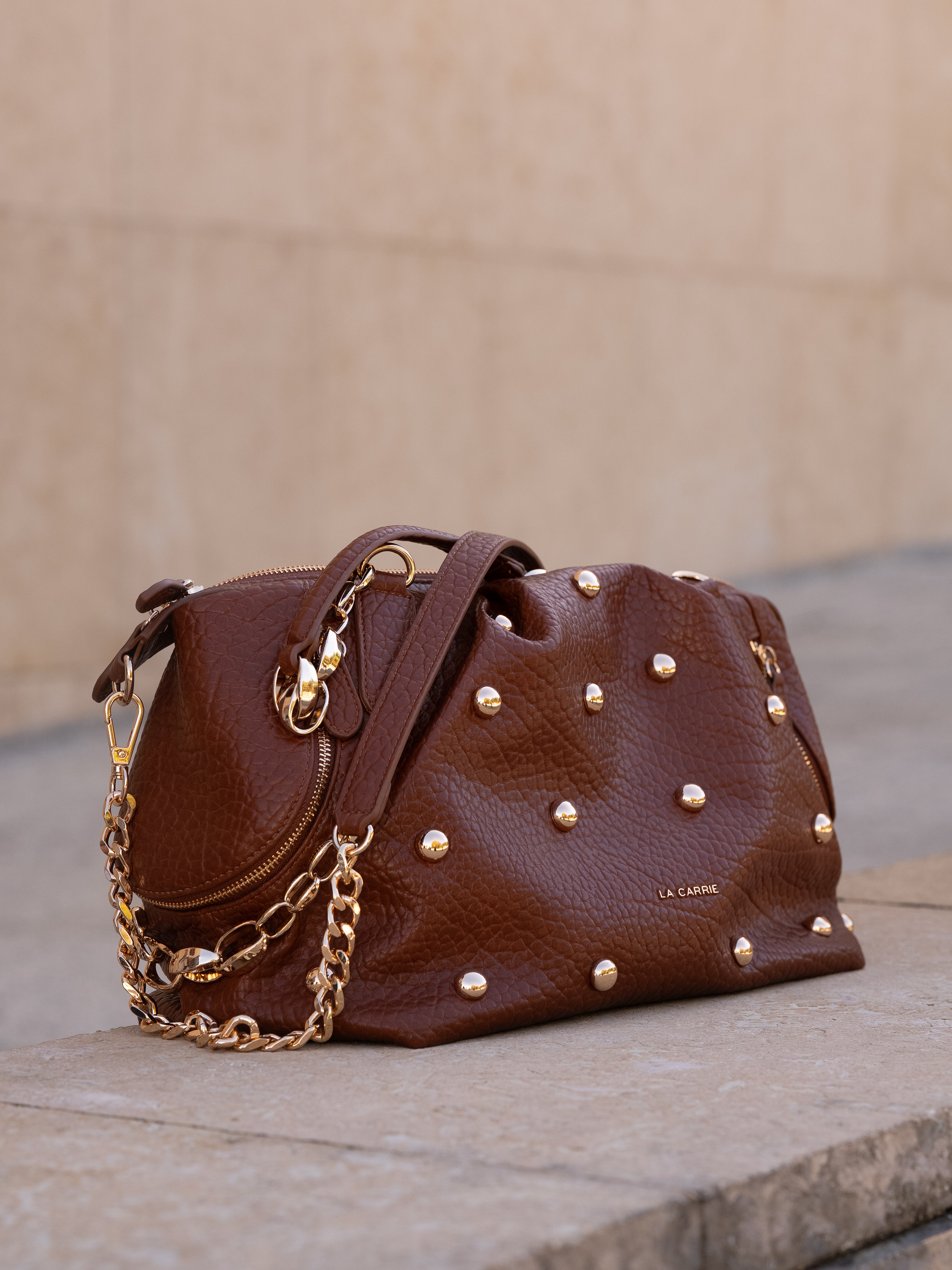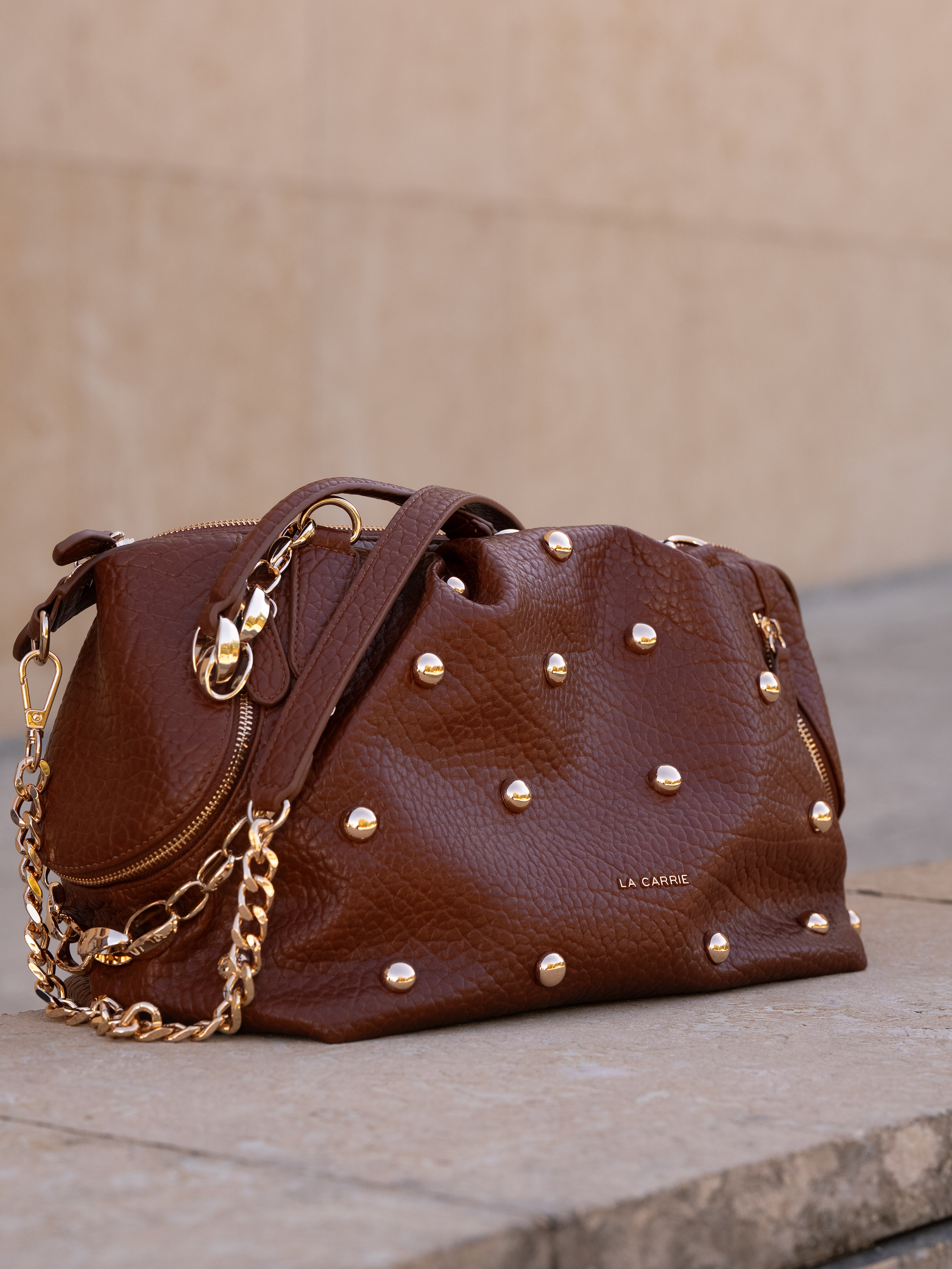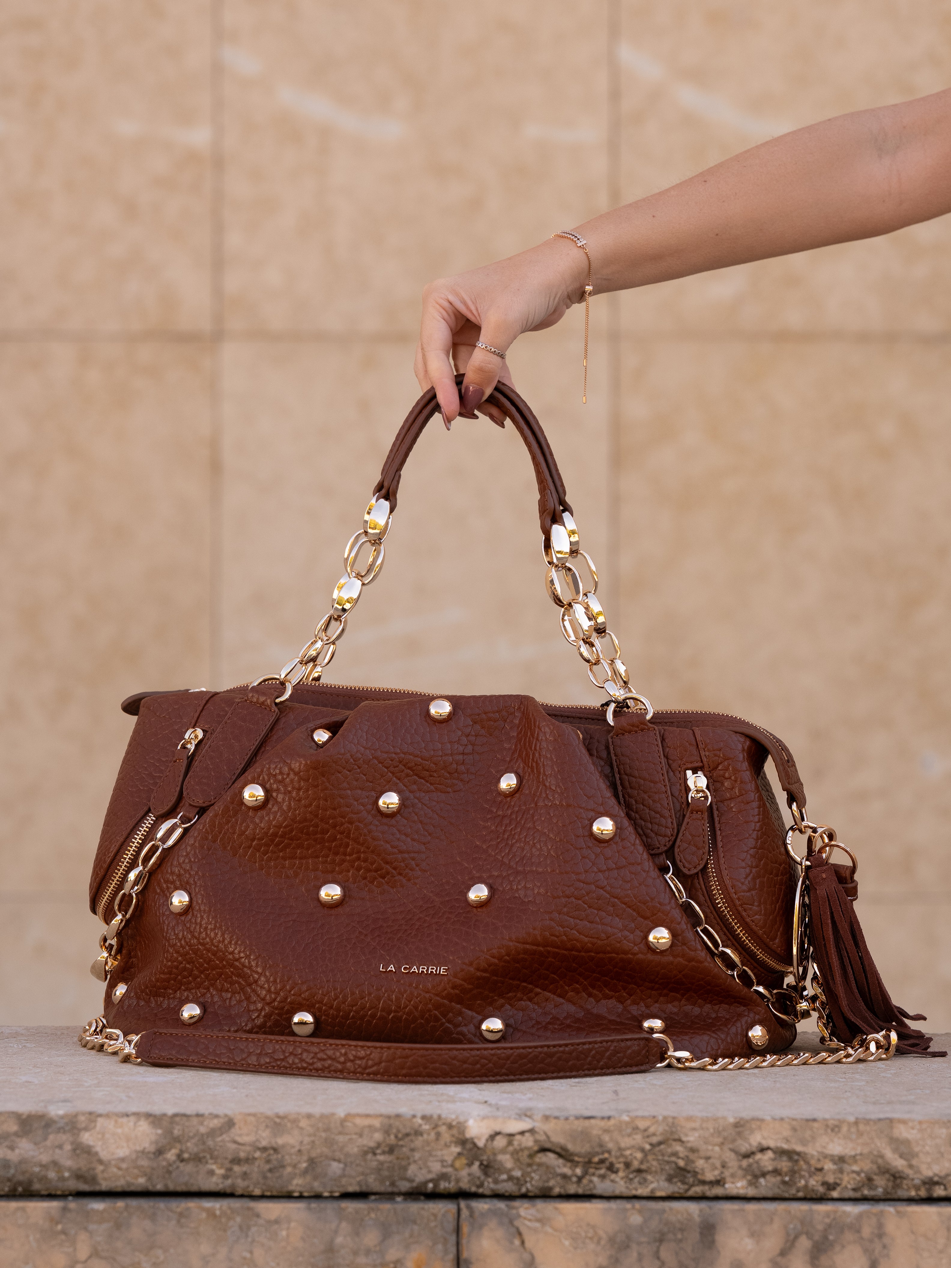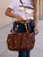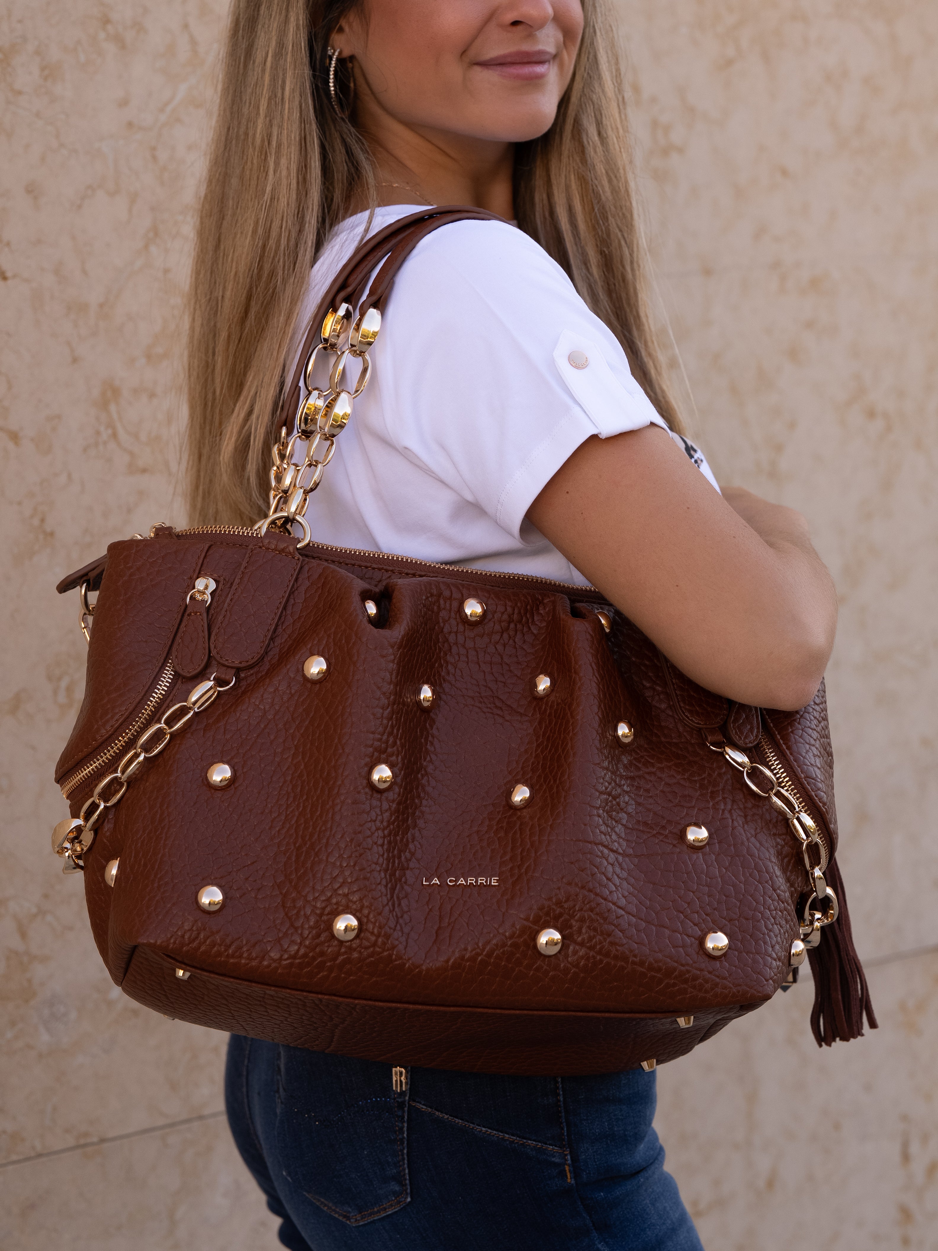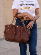 Eco-friendly faux leather shopping bag, chain handles, studs and golden accessories, removable chain shoulder strap