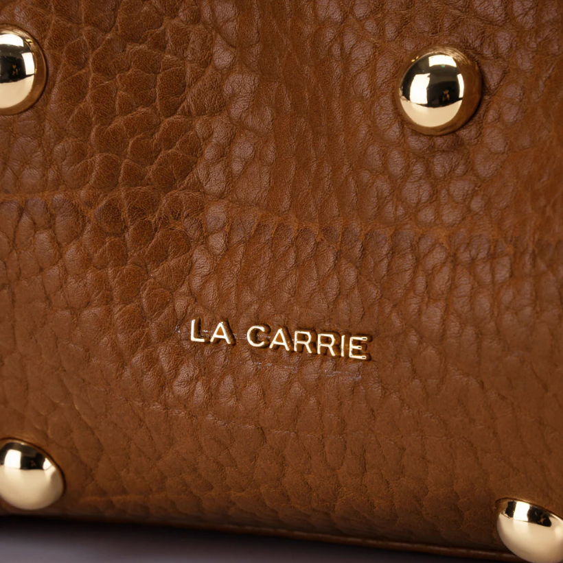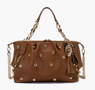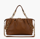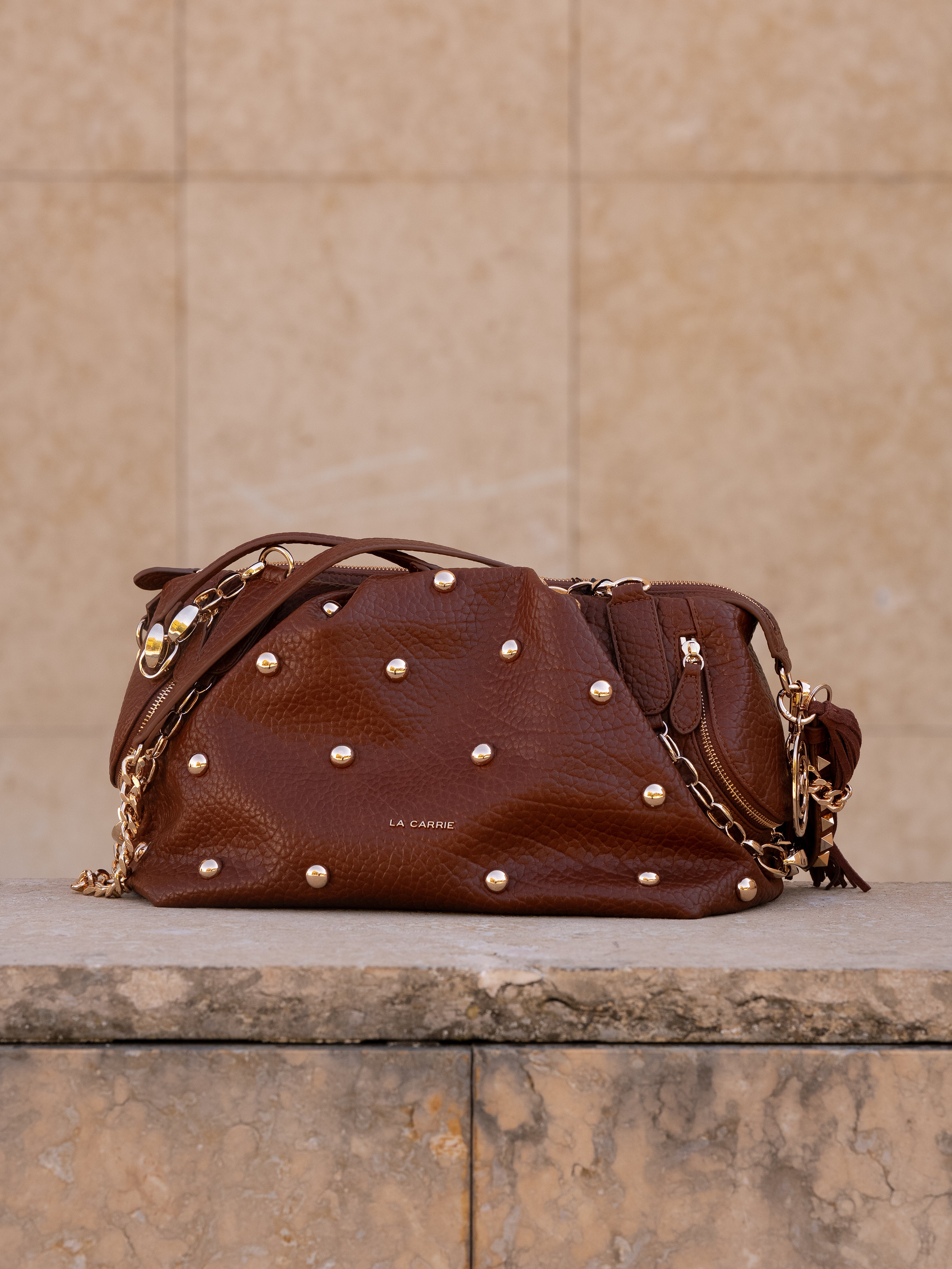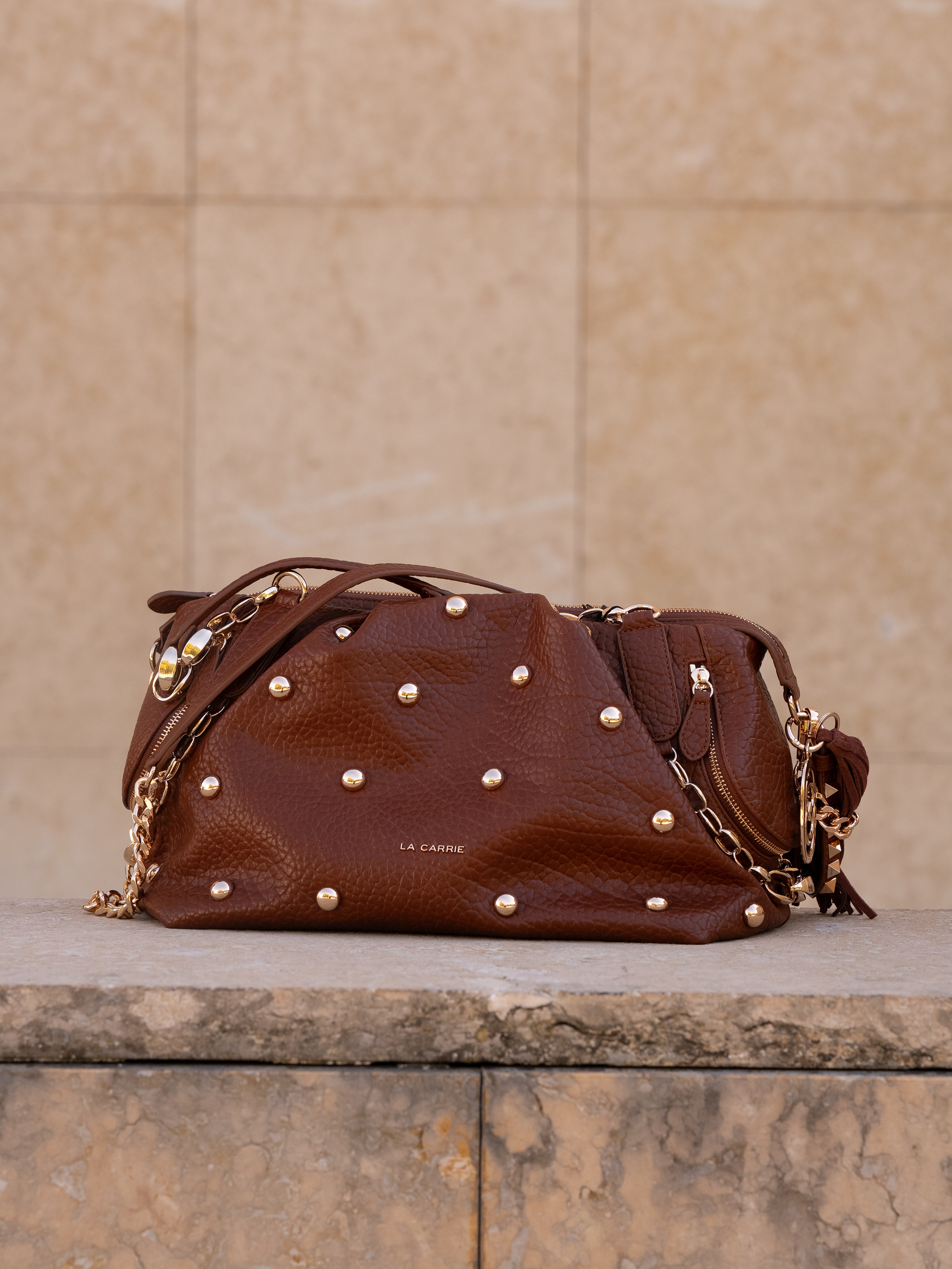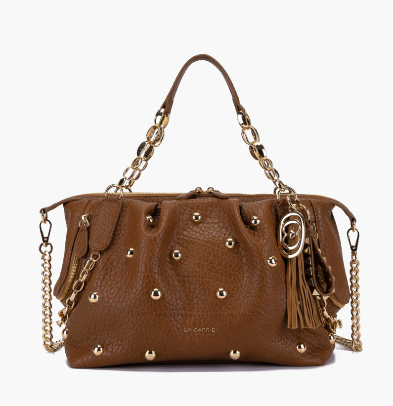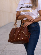 Eco-friendly faux leather shopping bag, chain handles, studs and golden accessories, removable chain shoulder strap