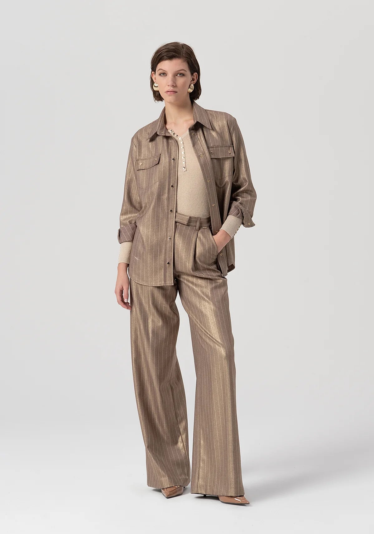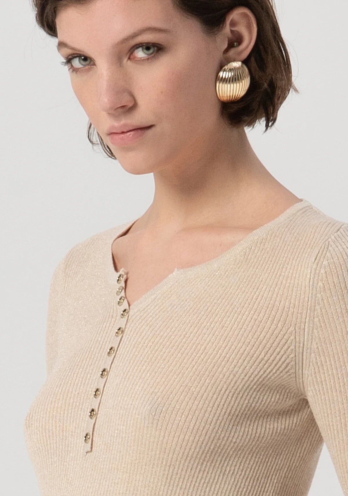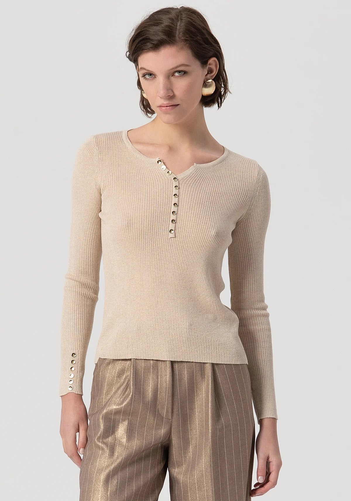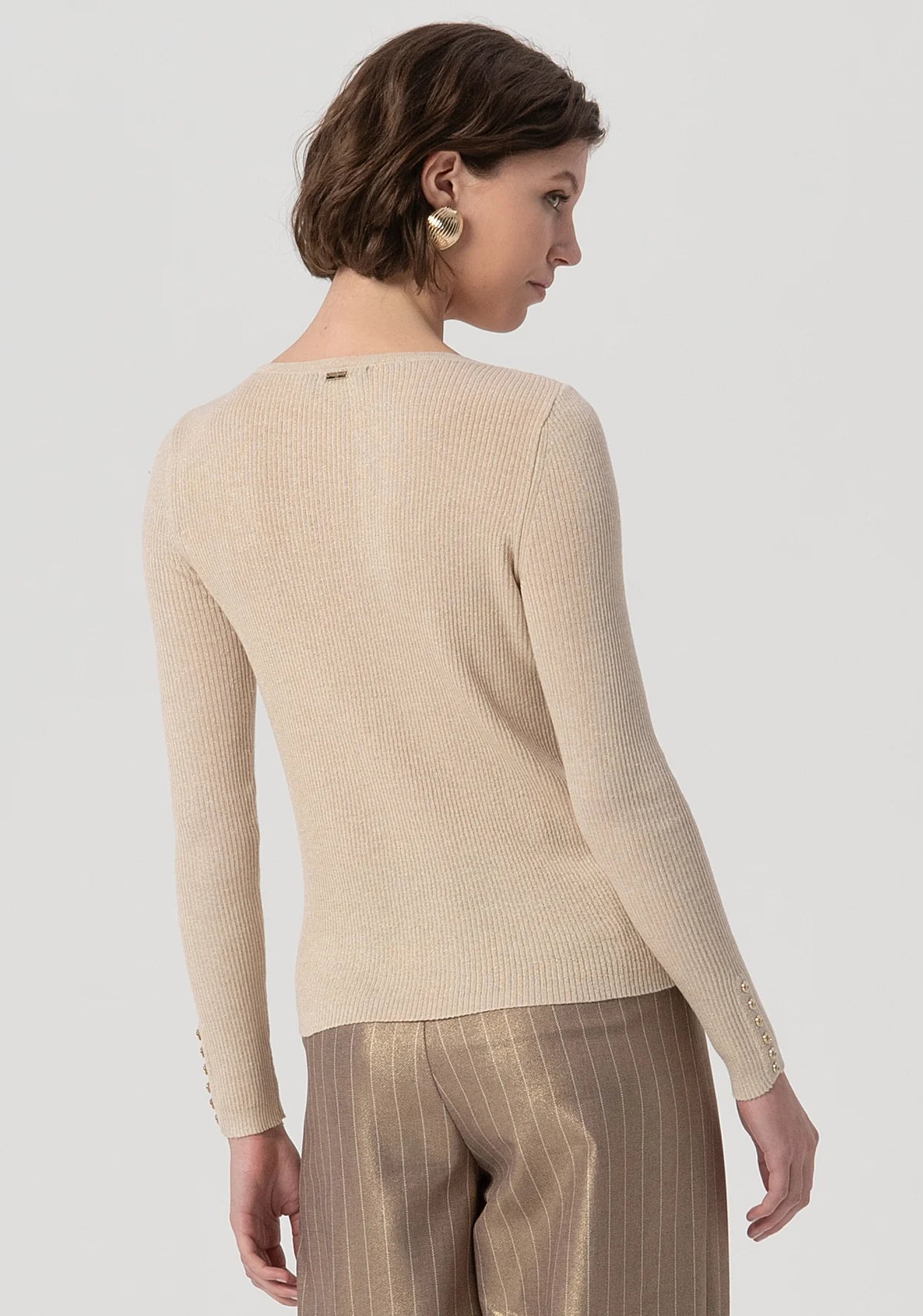 Knitwear slim fit with ribs made with wool and lurex. Round neck with small buttons and long sleeves