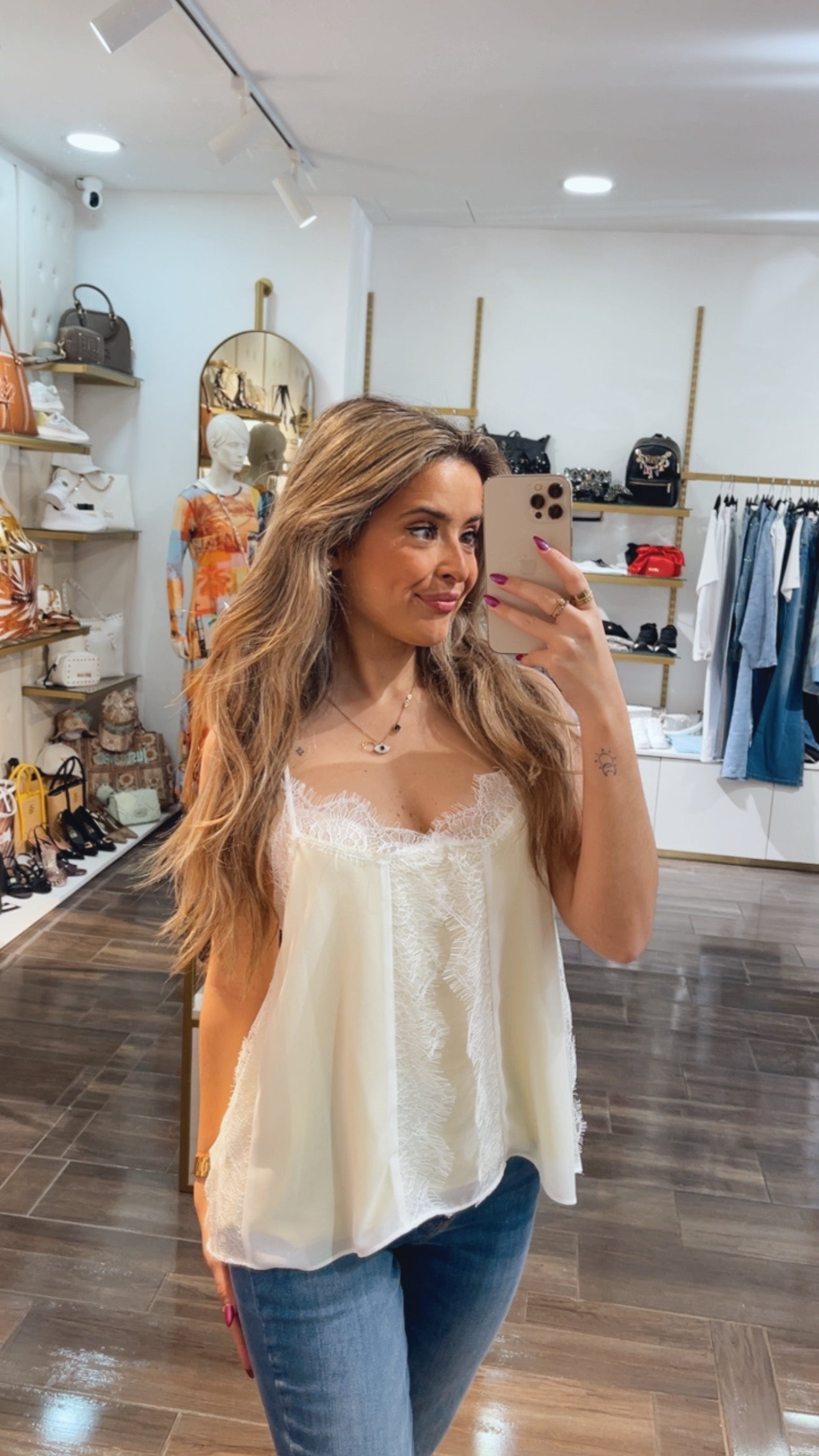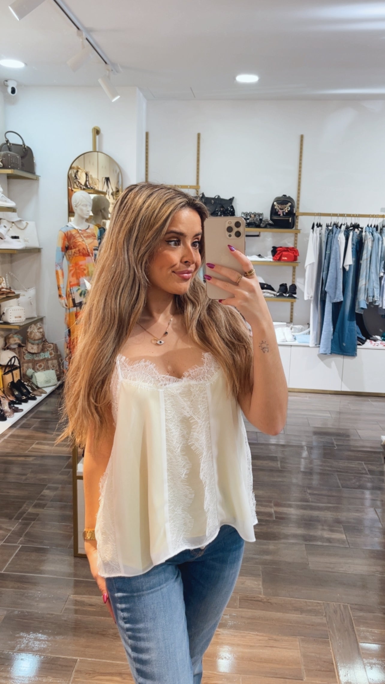 Tank top made in georgette. V-neck drop, thin braces and lace trimmings applied