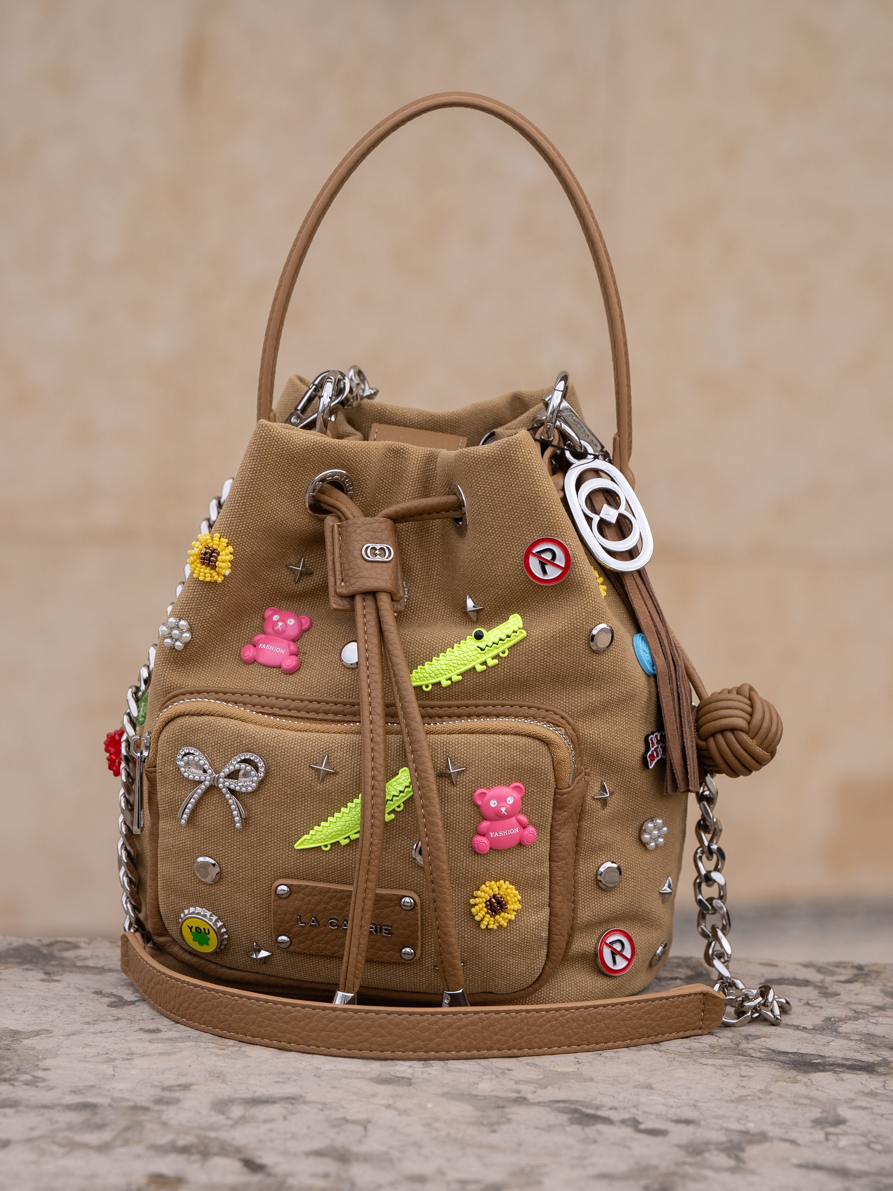 Canvas bucket bag with coloured pins applied, removable handle and shoulder strap