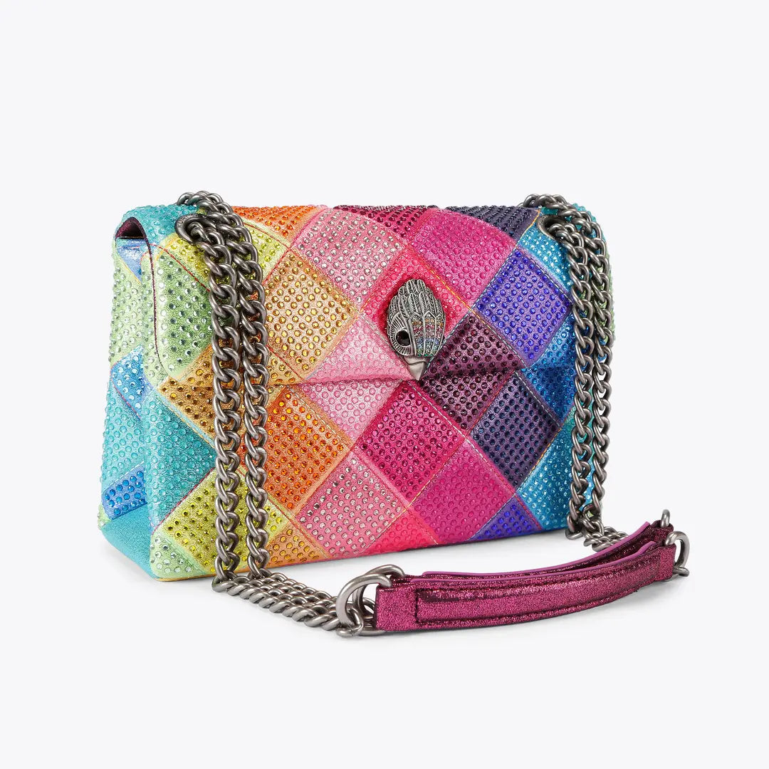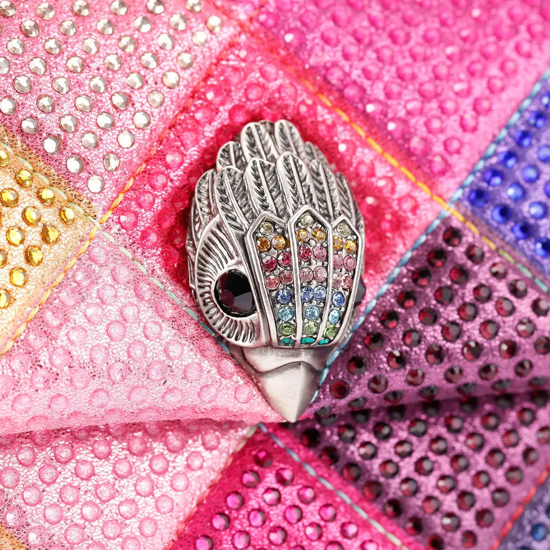 This medium Kensington Bag is crafted from a multi-colour diamond design with crystal embellishment. The antiqued silver eagle head features rainbow crystals and black bead eyes on the front flap.