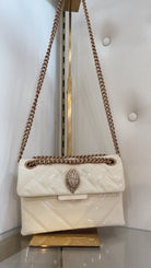 The Leather Mini Kensington bag is crafted from a white leather with overstitch quilting combining both weave and chevron patterns. The antiqued brass eagle head sits on the front flap.