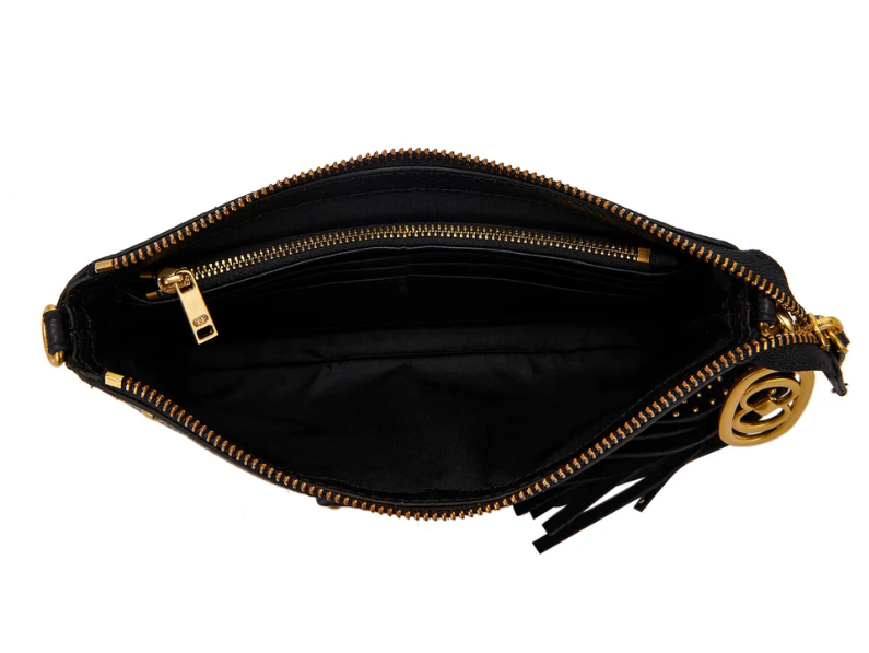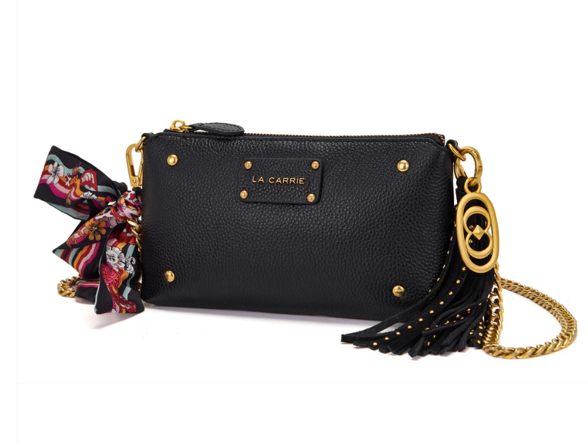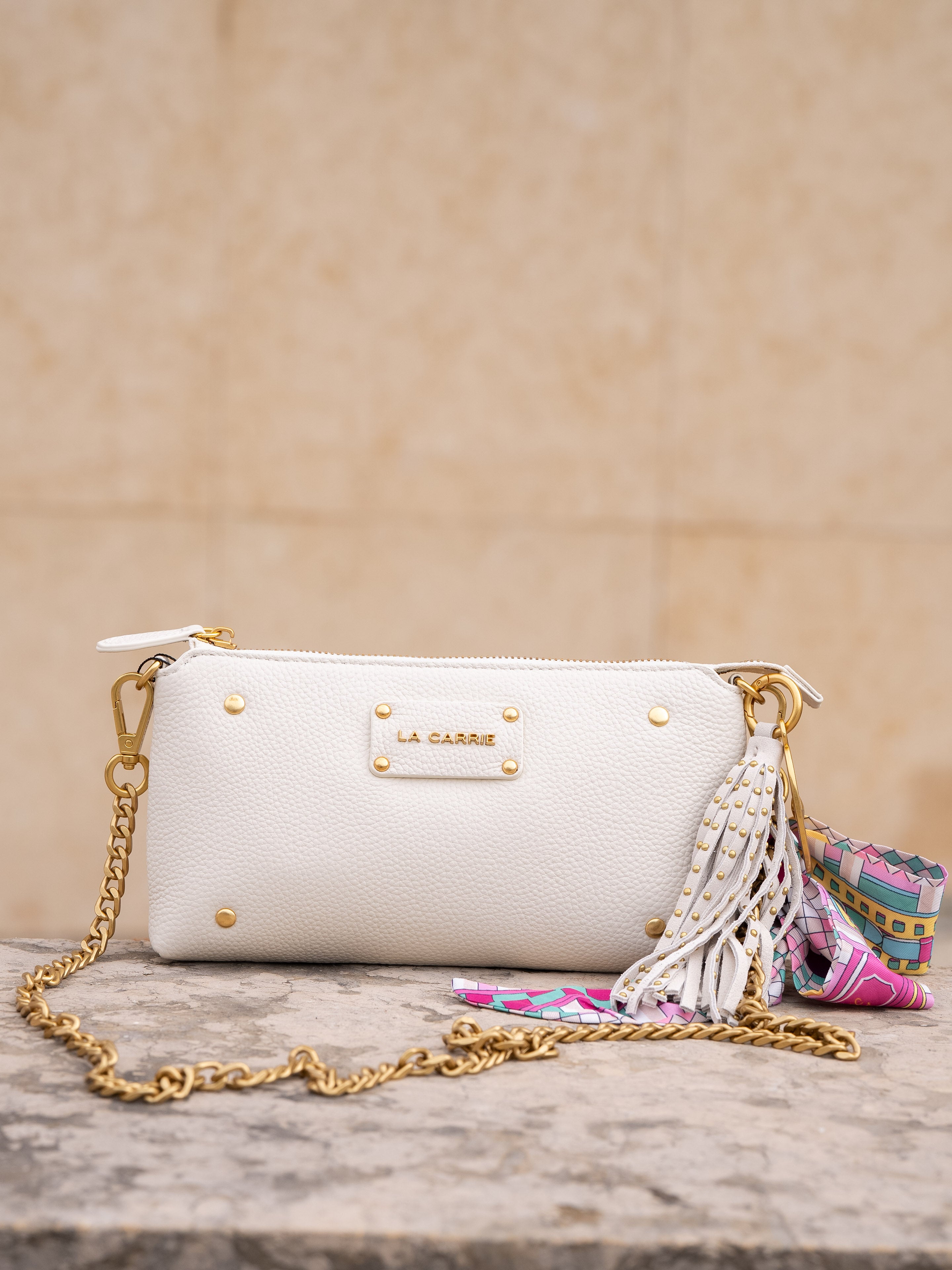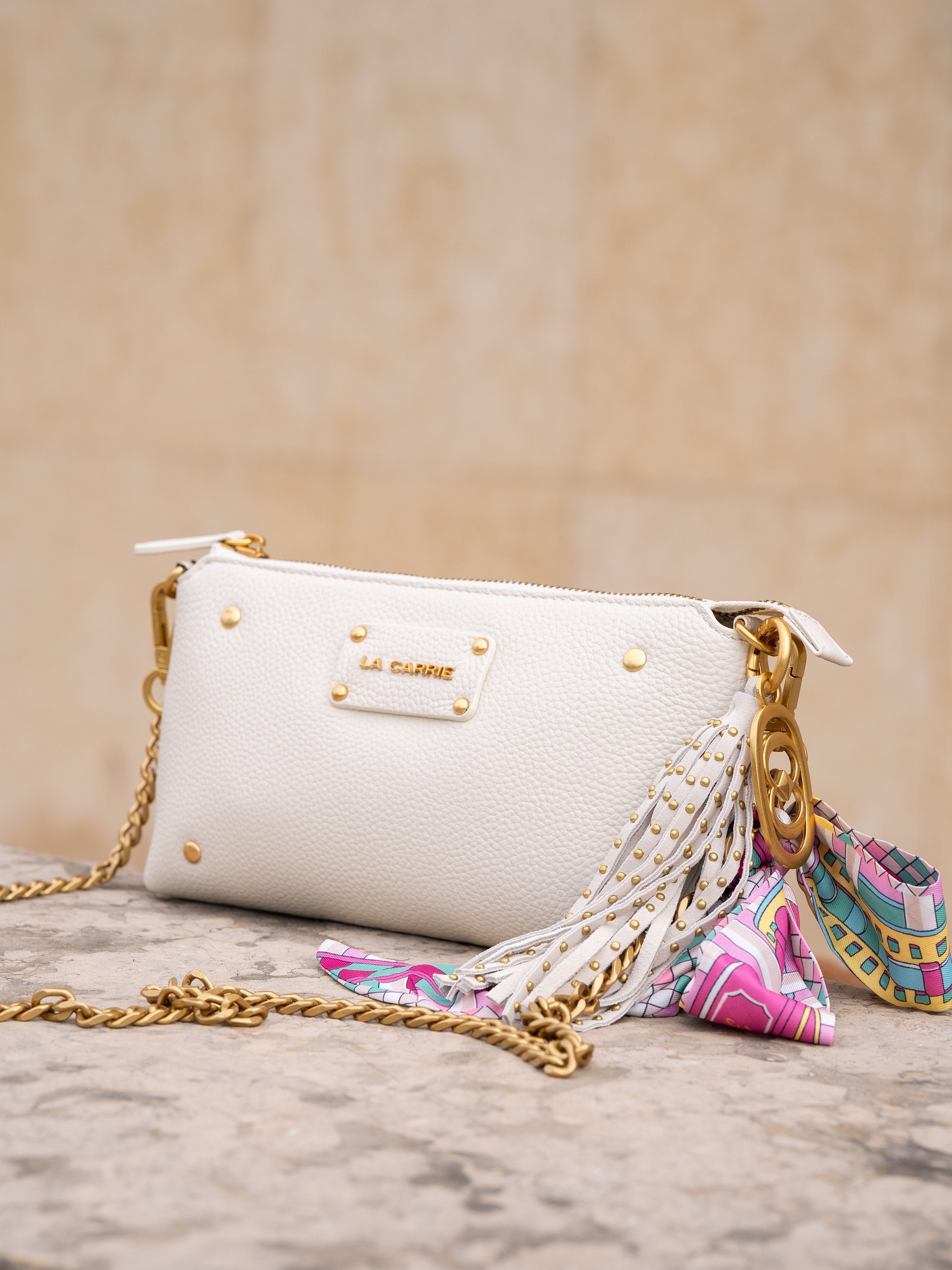 Large hammered leather wallet with applied studs, removable chain shoulder strap and colorful scarf