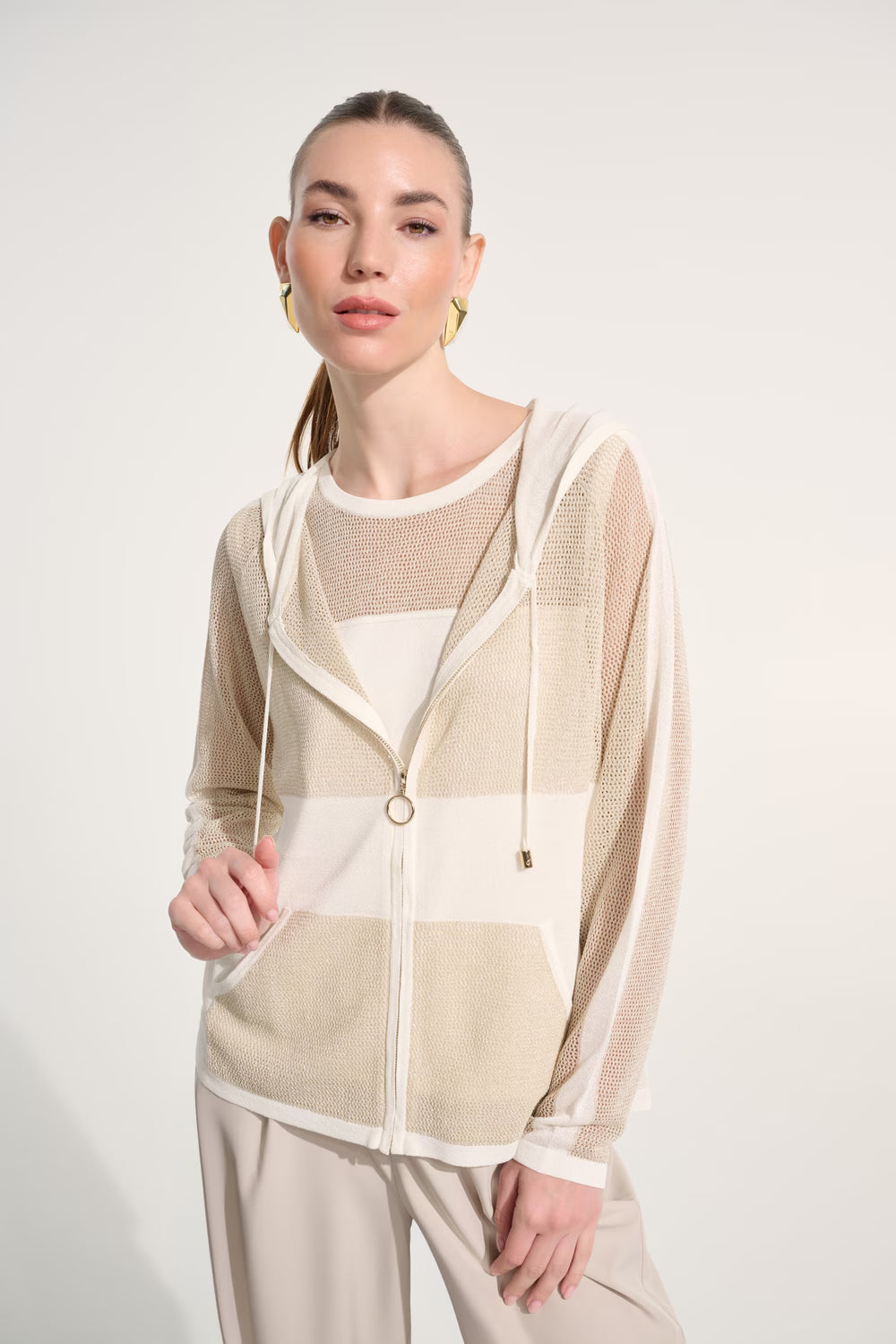 Introducing the Joseph Ribkoff hoodie, designed for ultimate comfort and style. This hip-length, relaxed fit piece features a zipper closure, long straight sleeves, and a crew neck, making it perfect for casual, home-lounge, and summer occasions. With its versatile striped and plain patterns, practical pockets, and sporty yet casual vibe, this hoodie is a must-have addition to your wardrobe.