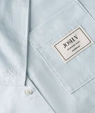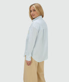 The JOSH V Neveah women’s blouse in the color Fresh Blue Stripe is an oversized blouse with a yarn-dyed stripe pattern. The blouse is made from a comfortable quality with recycled polyester and cotton, sourced via the Better Cotton Initiative (BCI™). The blouse closes with JOSH V branded buttons and is finished with a logo emblem on the chest. The blouse comes with a matching scarf that can be styled in different ways