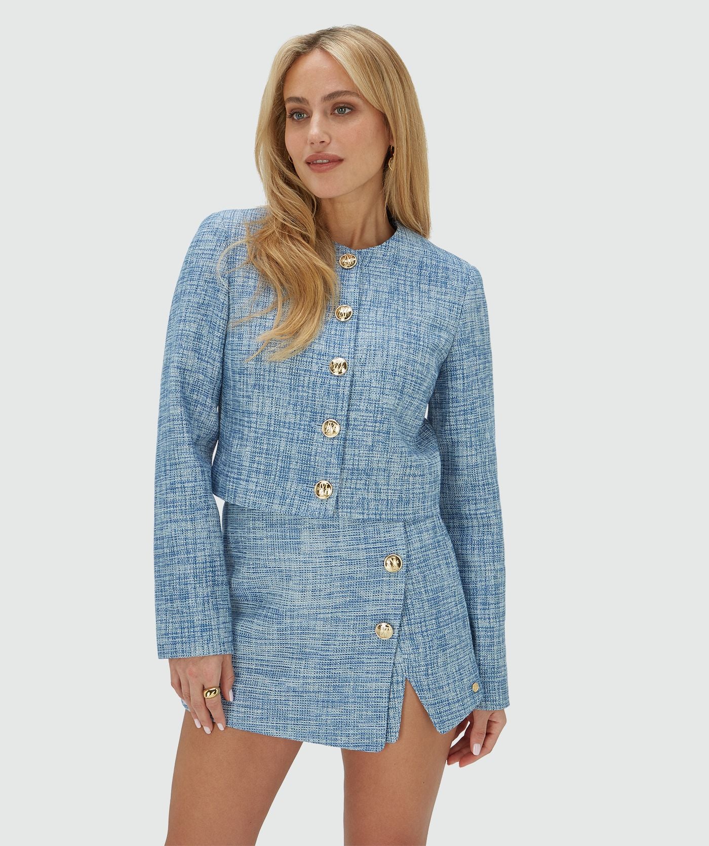 The JOSH V Remi women’s blazer in the color Blue Bouclé is a stylish statement piece with a modern, feminine look. The blazer is made from a luxurious bouclé quality with cotton and recycled polyester and is enriched with metallic lurex for a subtle shimmer. The cropped fit gives the design a contemporary twist and makes the blazer perfect for both casual and chic looks. Combine the blazer with the matching Lotti skort for a stylish co-ord look, or wear it with light-wash jeans.