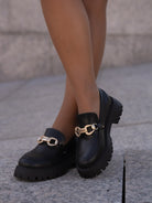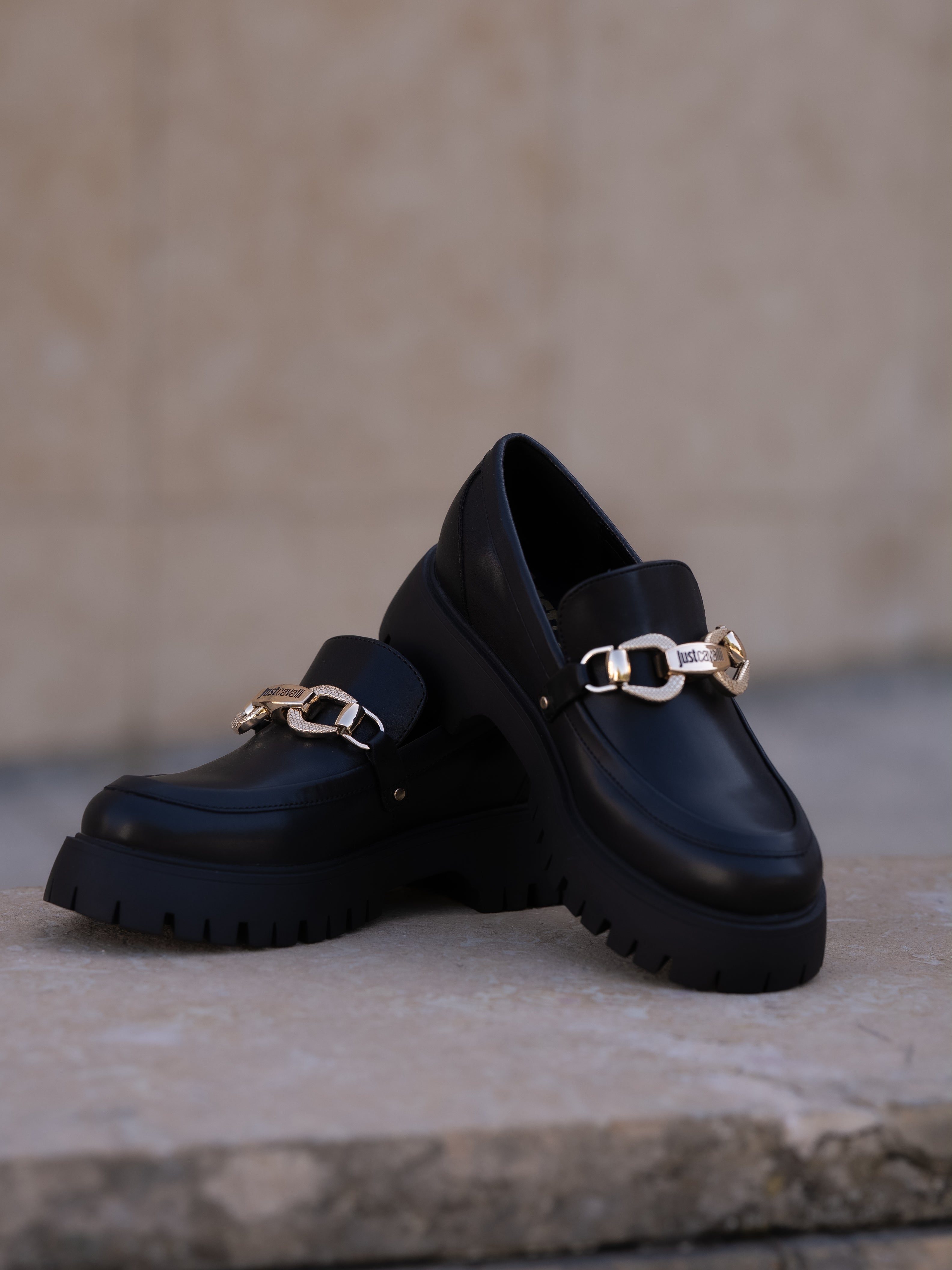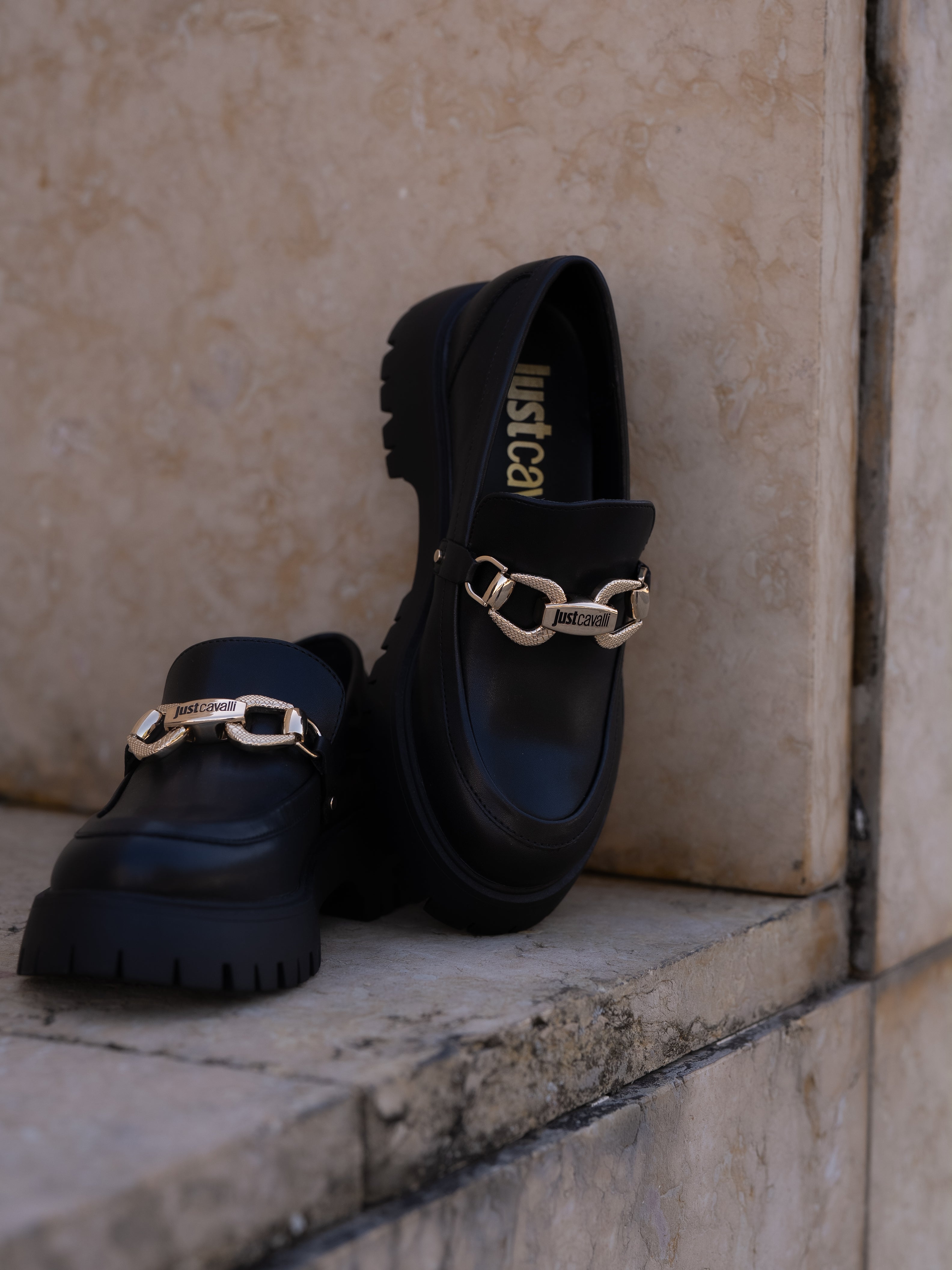 Make a bold statement with this Just Cavalli chunky loafer, designed for those who love to combine elegance with edge. Crafted from sleek black leather, this moccasin features a rugged, thick rubber sole for a modern, urban twist on a classic silhouette. The standout detail is the gold-toned chain across the upper, adding a touch of luxury and signature Cavalli flair. Comfortable, durable, and stylish—this loafer is perfect for elevating your everyday outfits with a hint of attitude.
