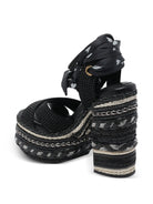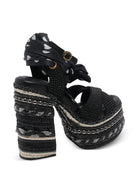 This Chelsea Scarf Platform heel is crafted from a black suede leather on the crossed straps and a statement woven rope heel in multiple colours. The ankle strap is accented with an optional scarf detail.