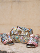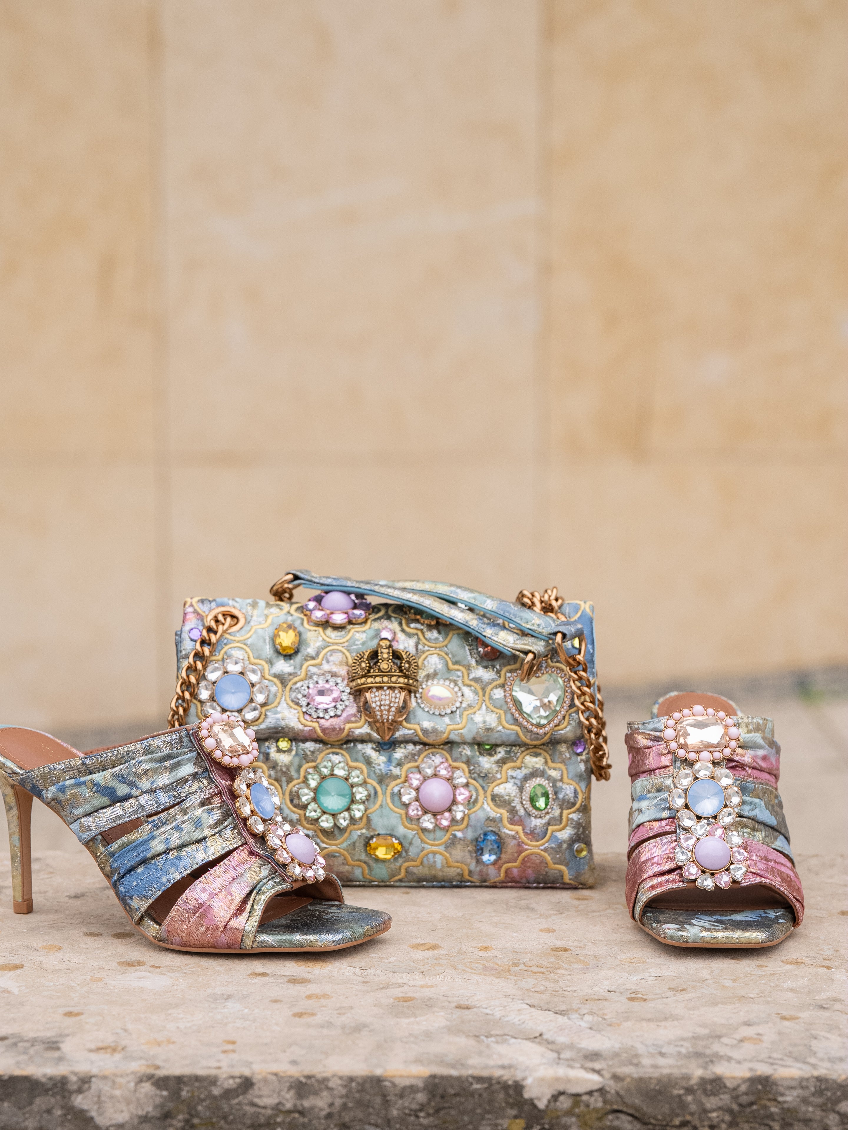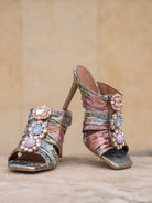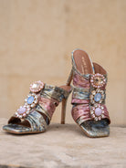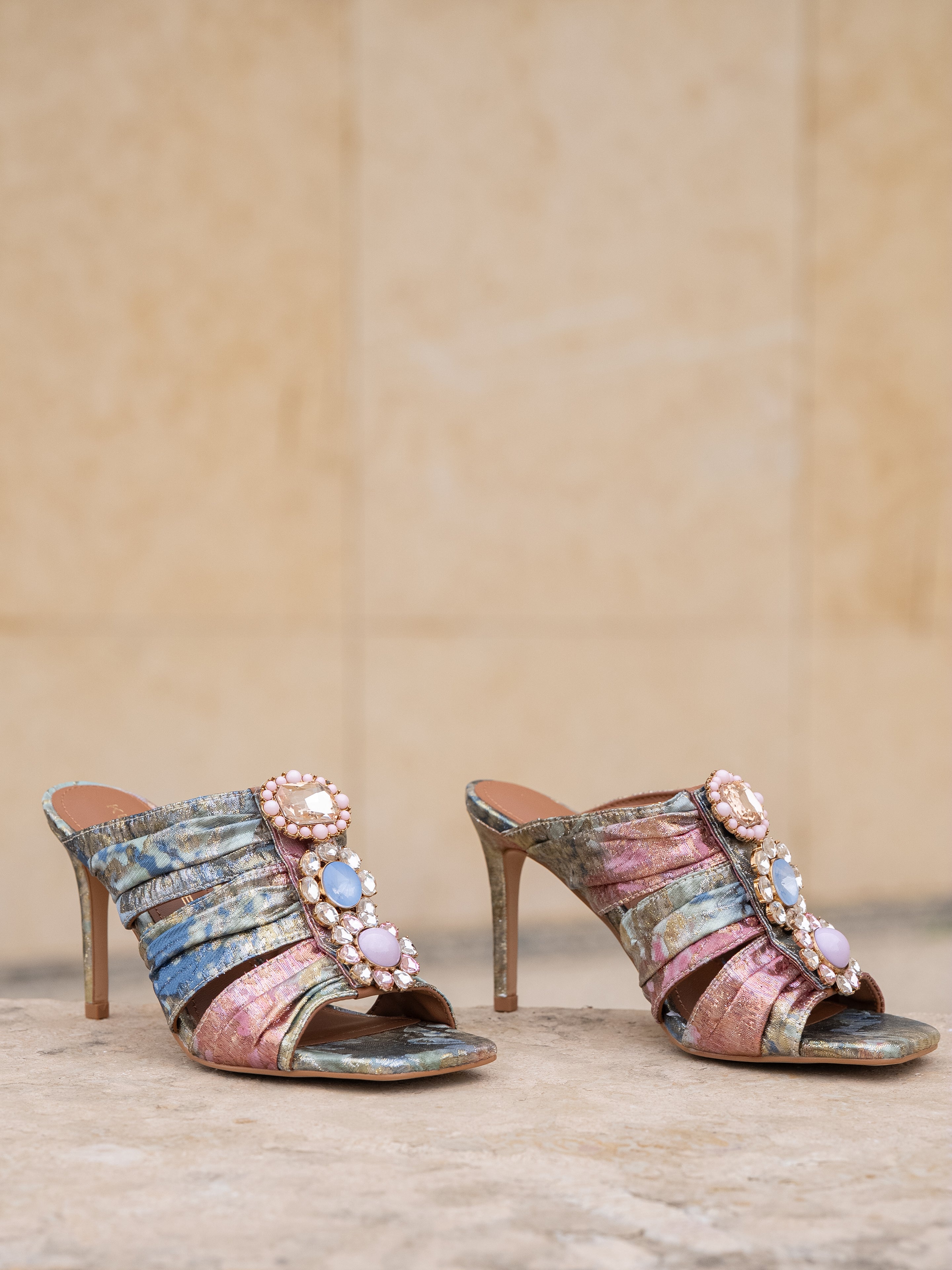 This Kensington Soft Bow Mule features three folded green iridescent straps. Each strap is accented with a stone and crystal charm.