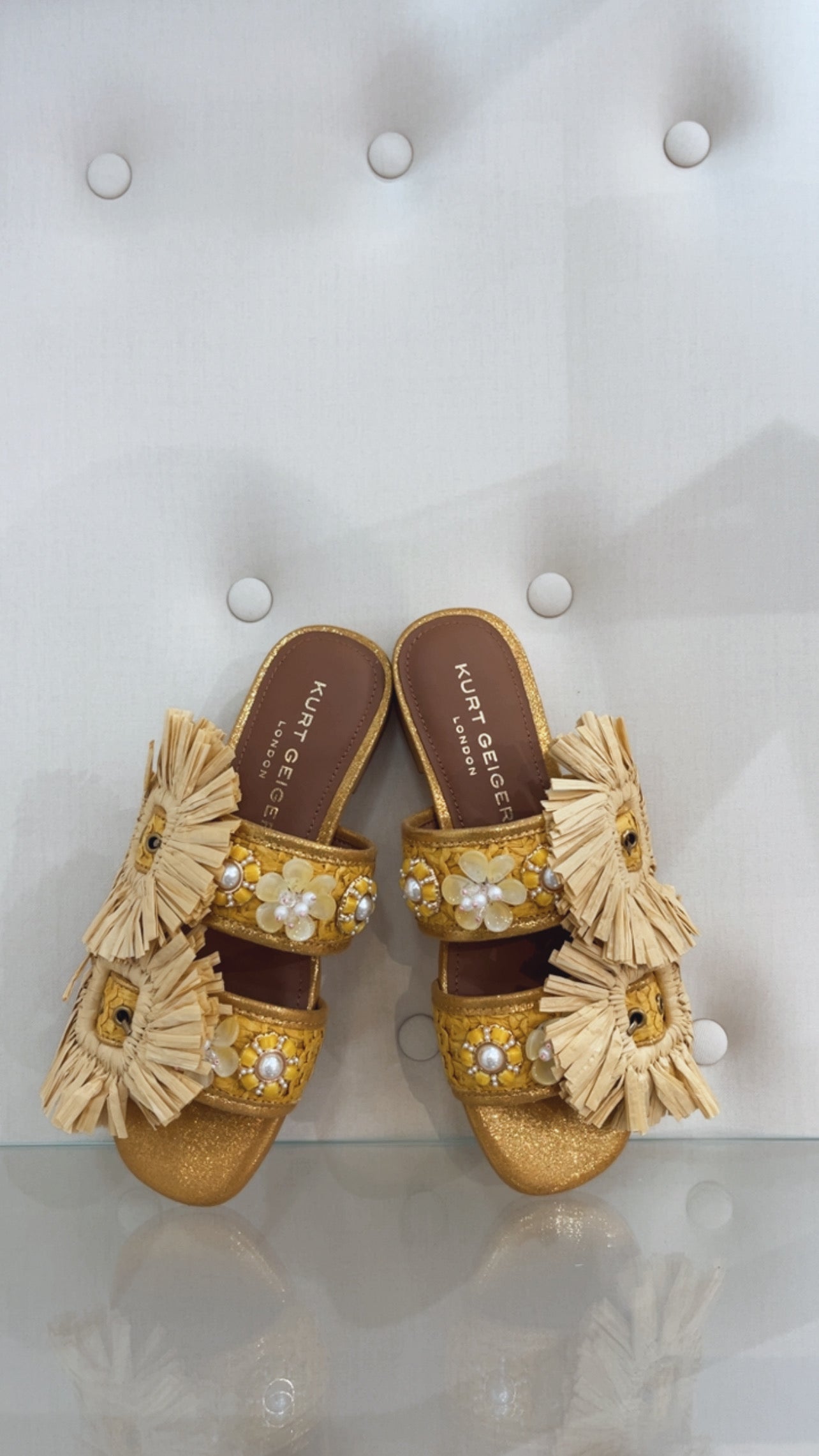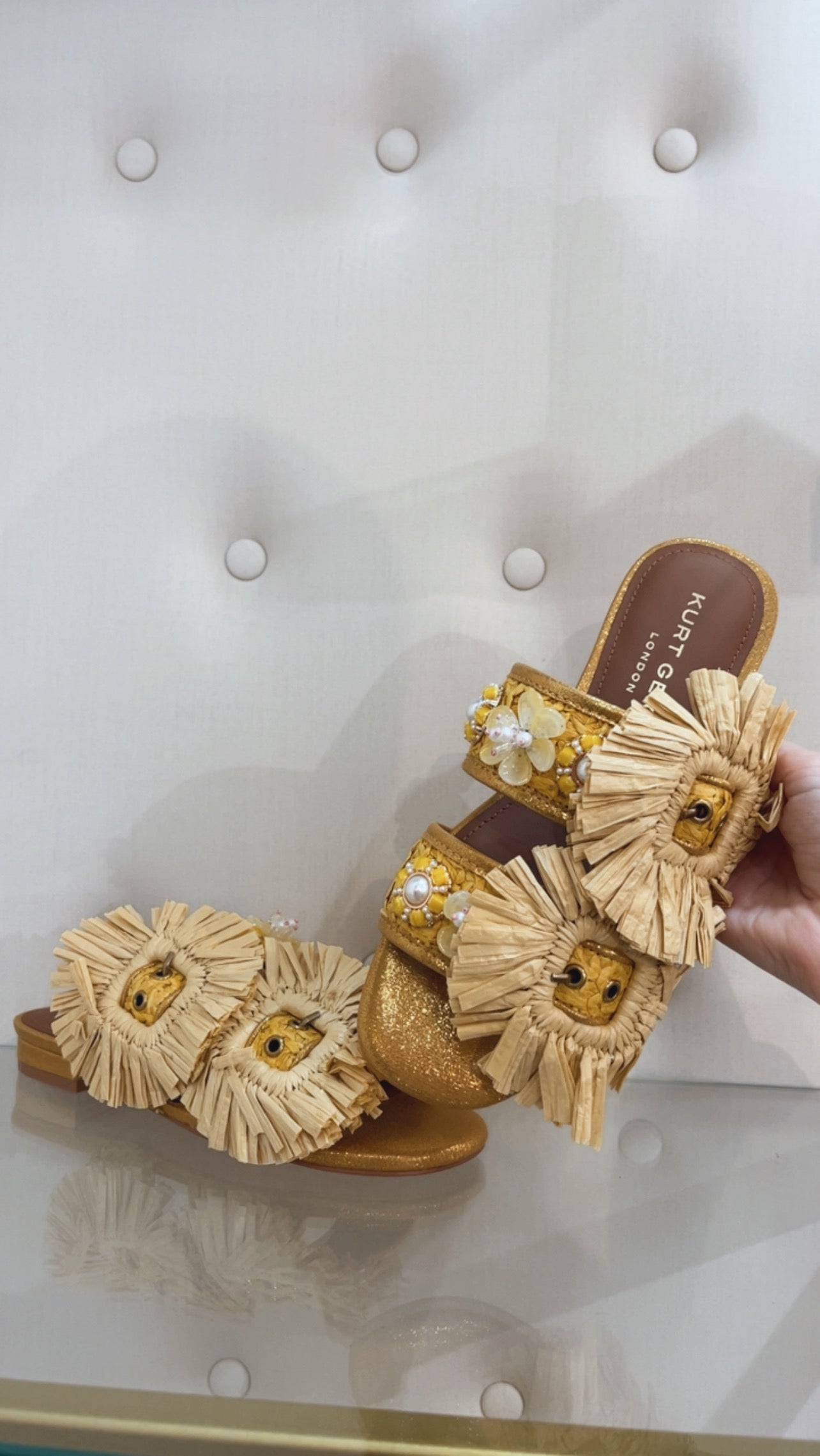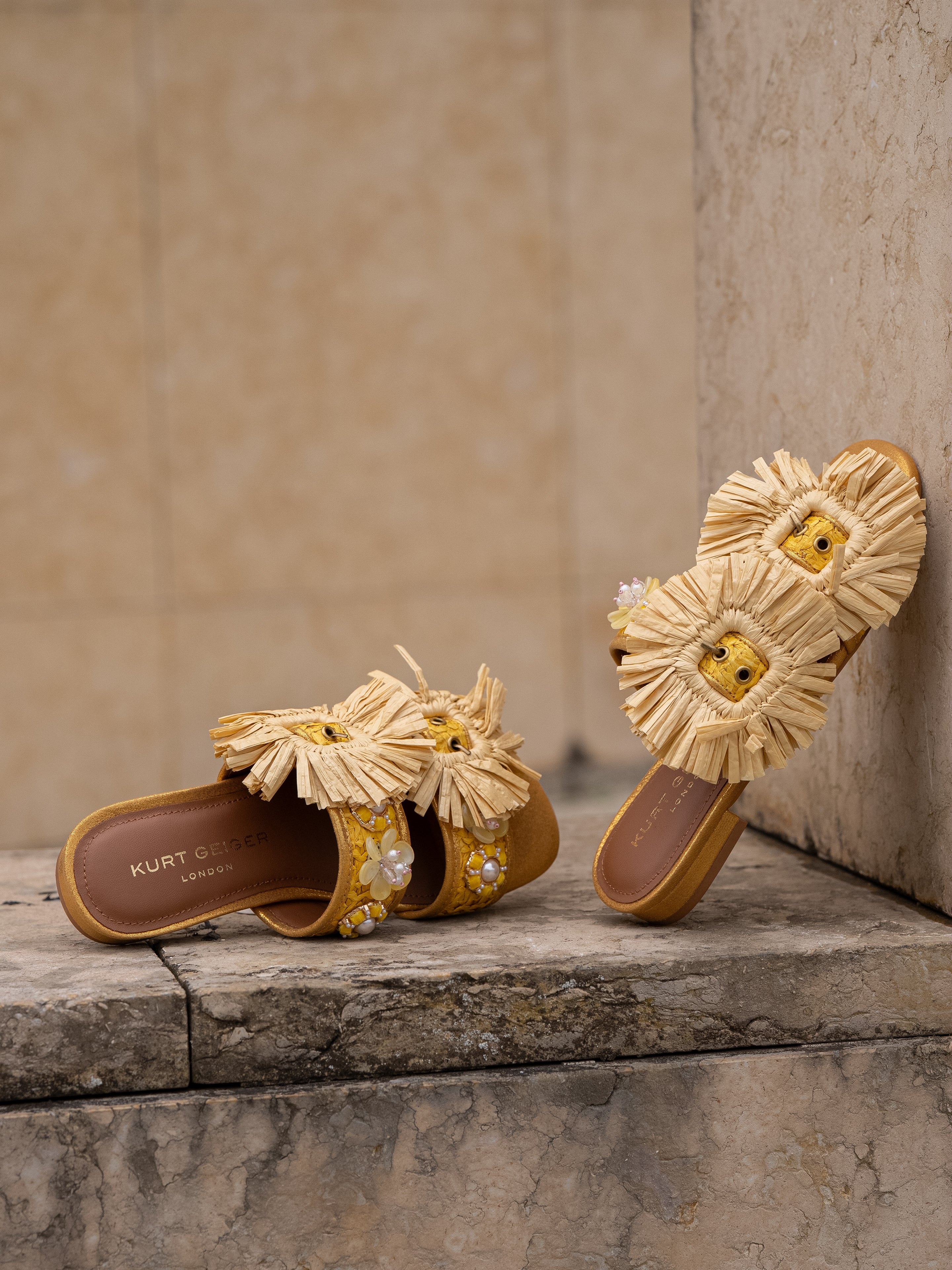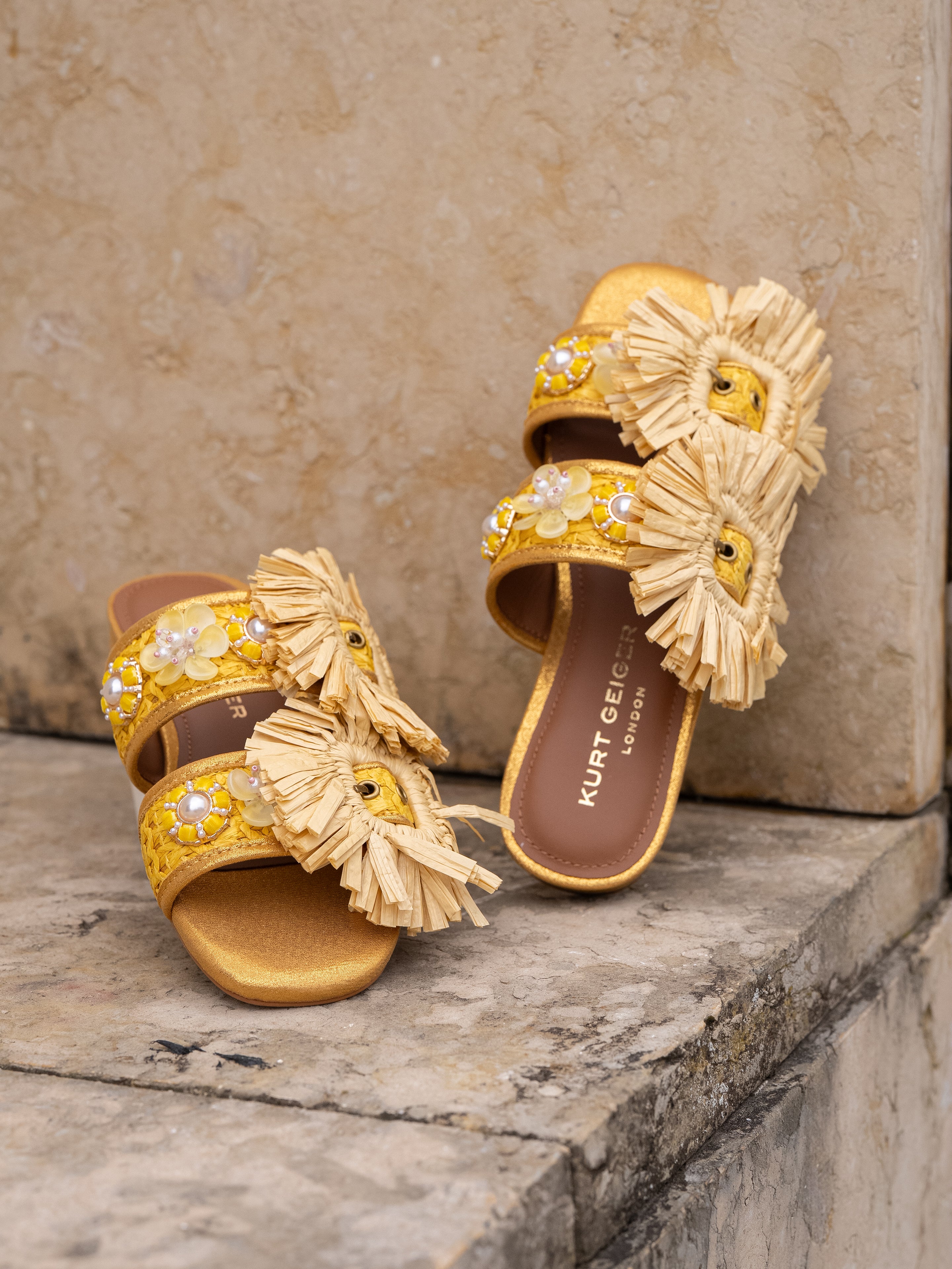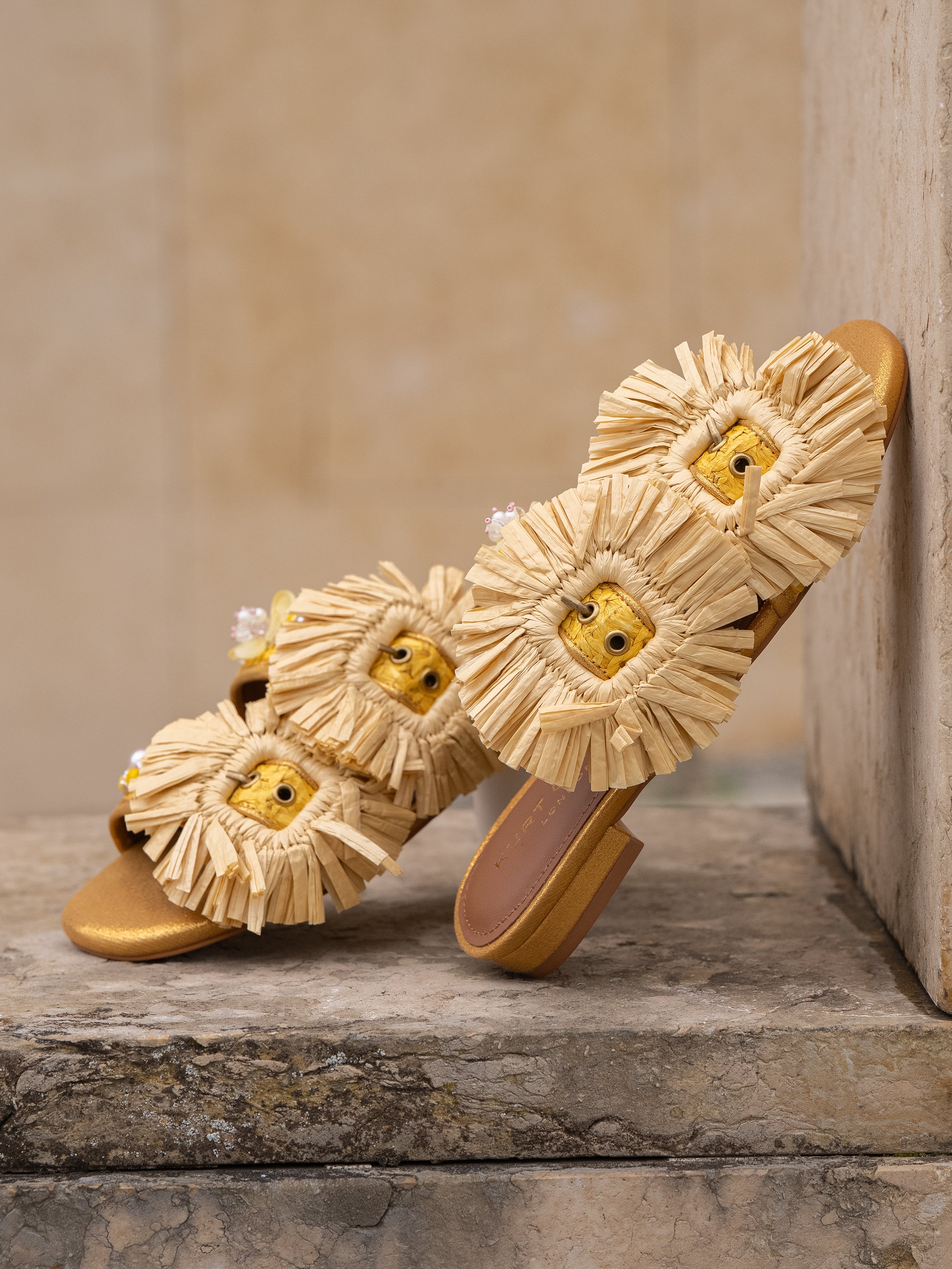 This Raffia Buckle Flat sandal is crafted from a yellow metallic fabric. There are two straps across the foot that are accented with statement pink raffia flowers on the buckles.