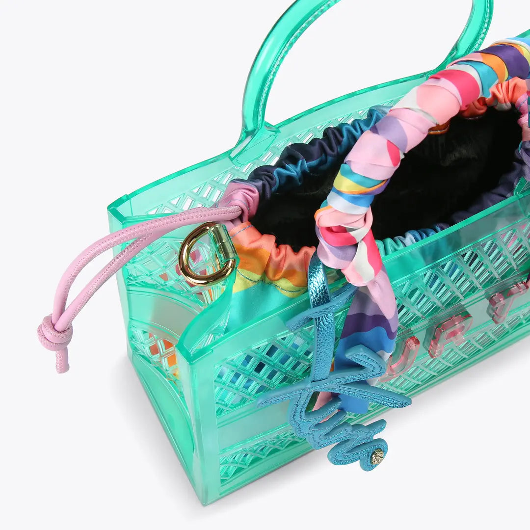 This Small Jelly Tote Bag is crafted from a turquoise vinyl jelly mesh fabric. There is an inner pouch in a rainbow swirl fabric matching the satin scarf wrapped around the handle.
