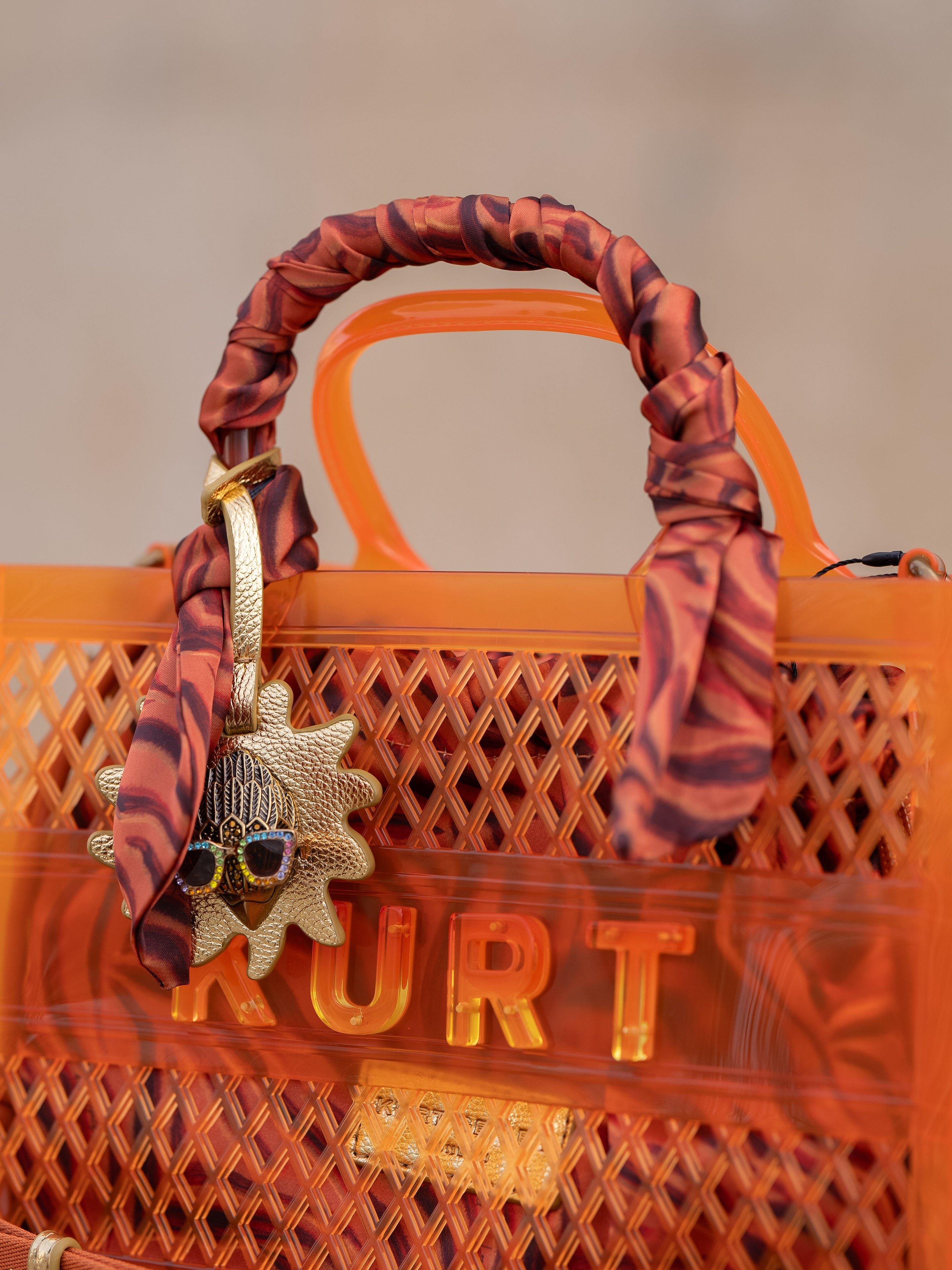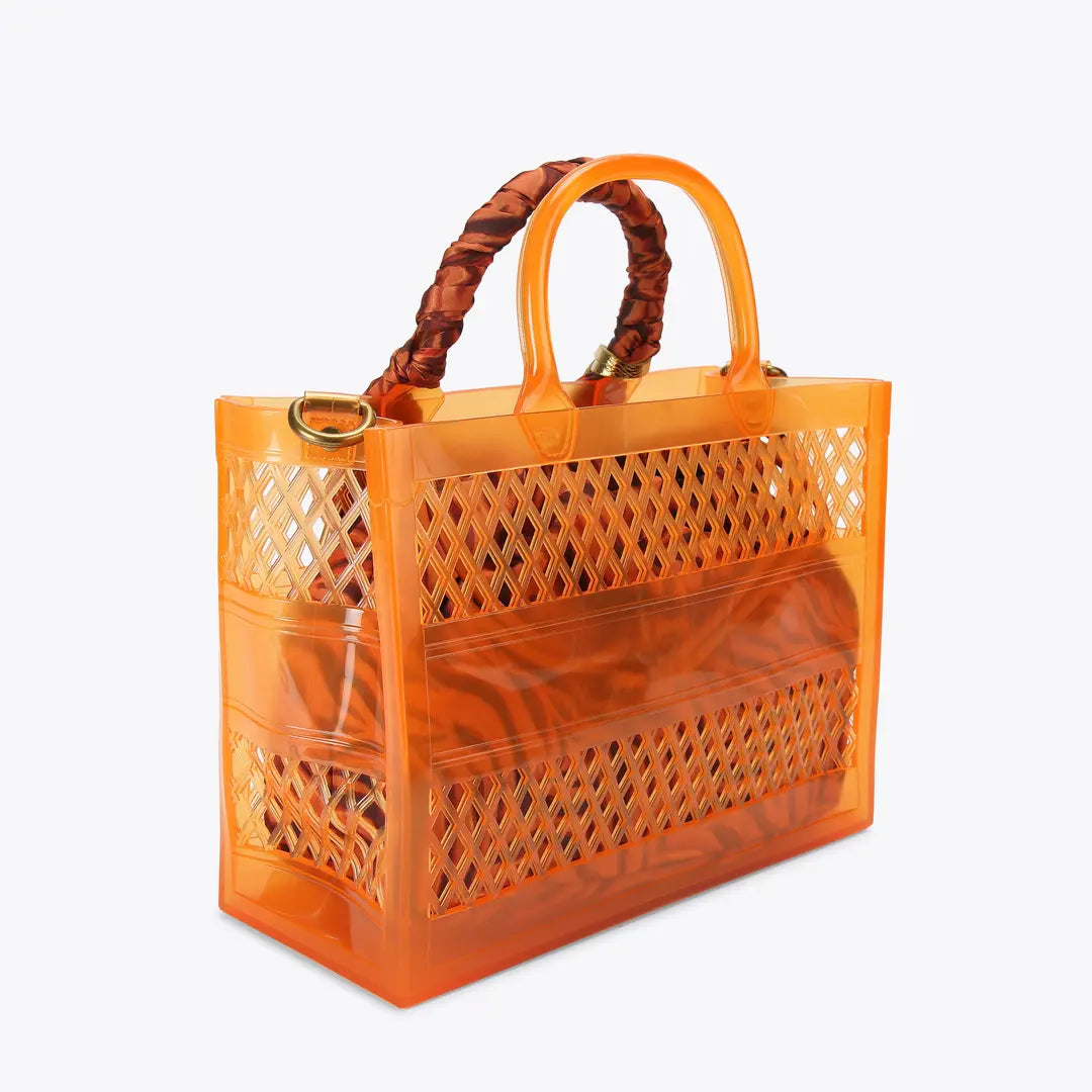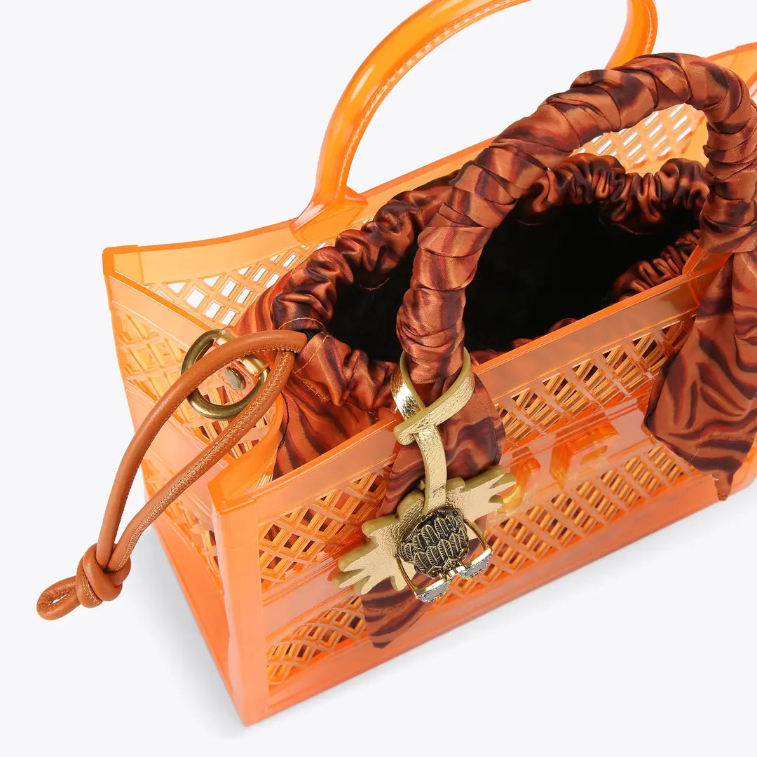 This Small Jelly Tote Bag is crafted from an orange vinyl jelly mesh fabric. There is an inner pouch in a tiger striped fabric matching the satin scarf wrapped around the handle.