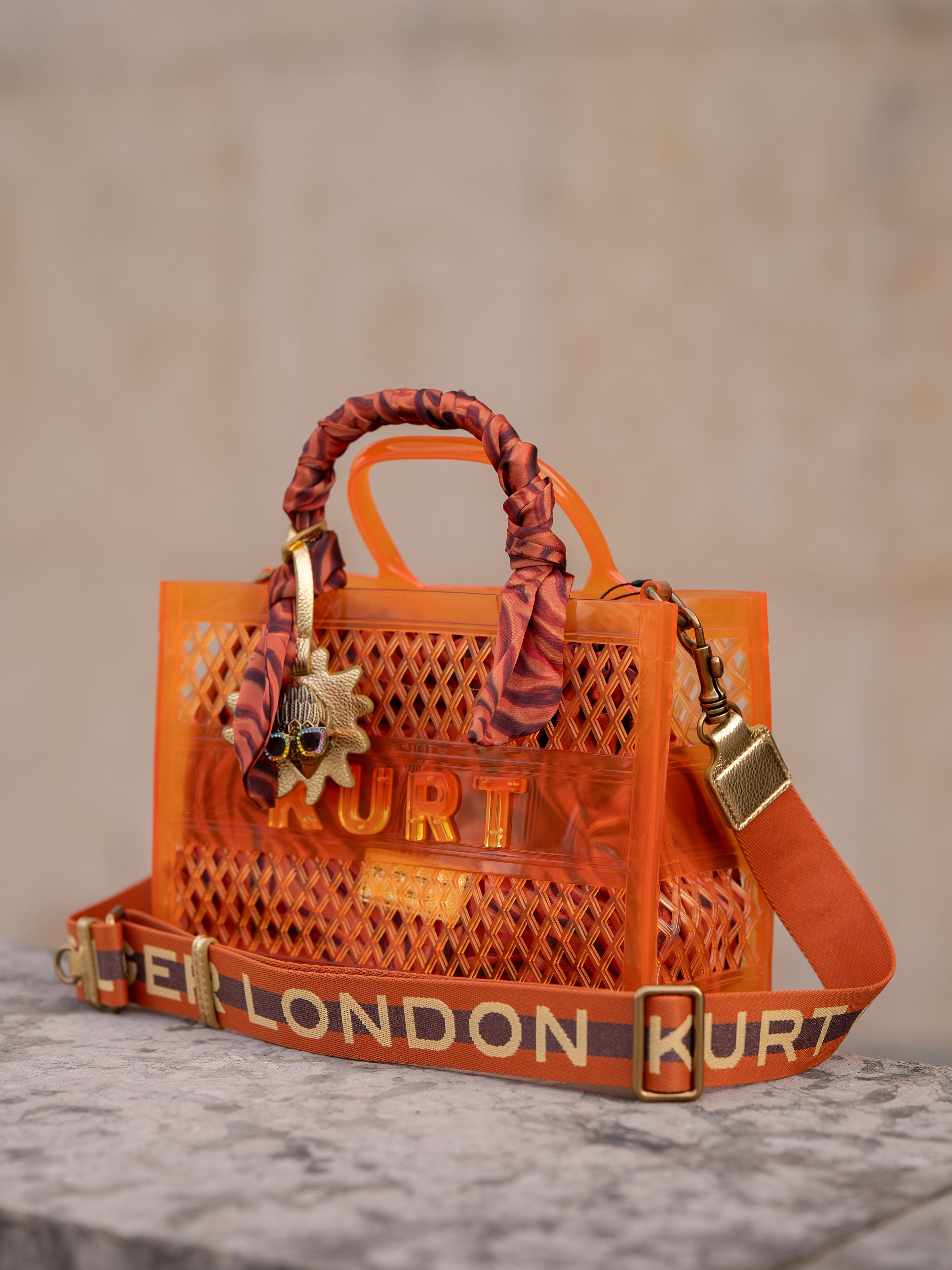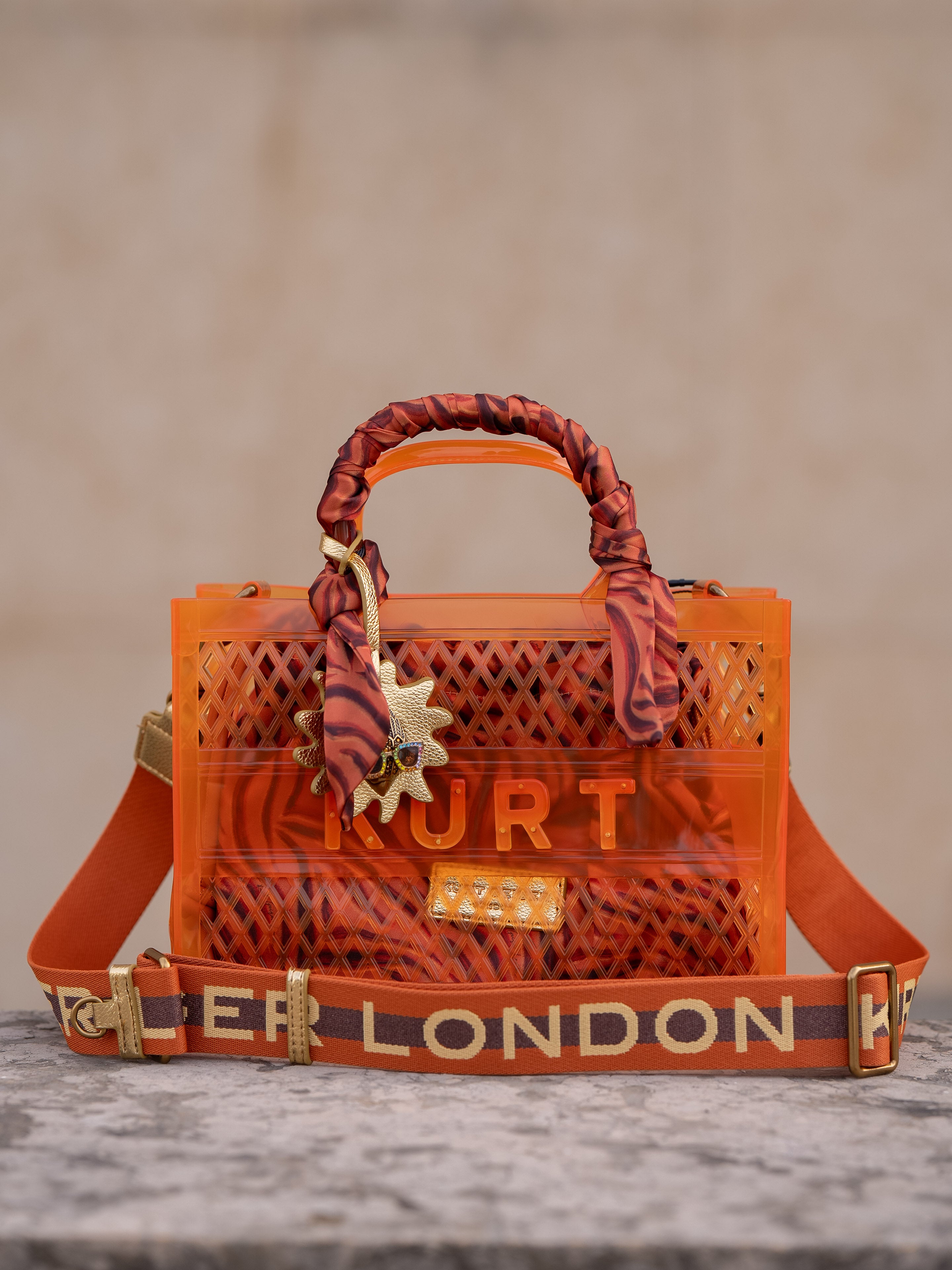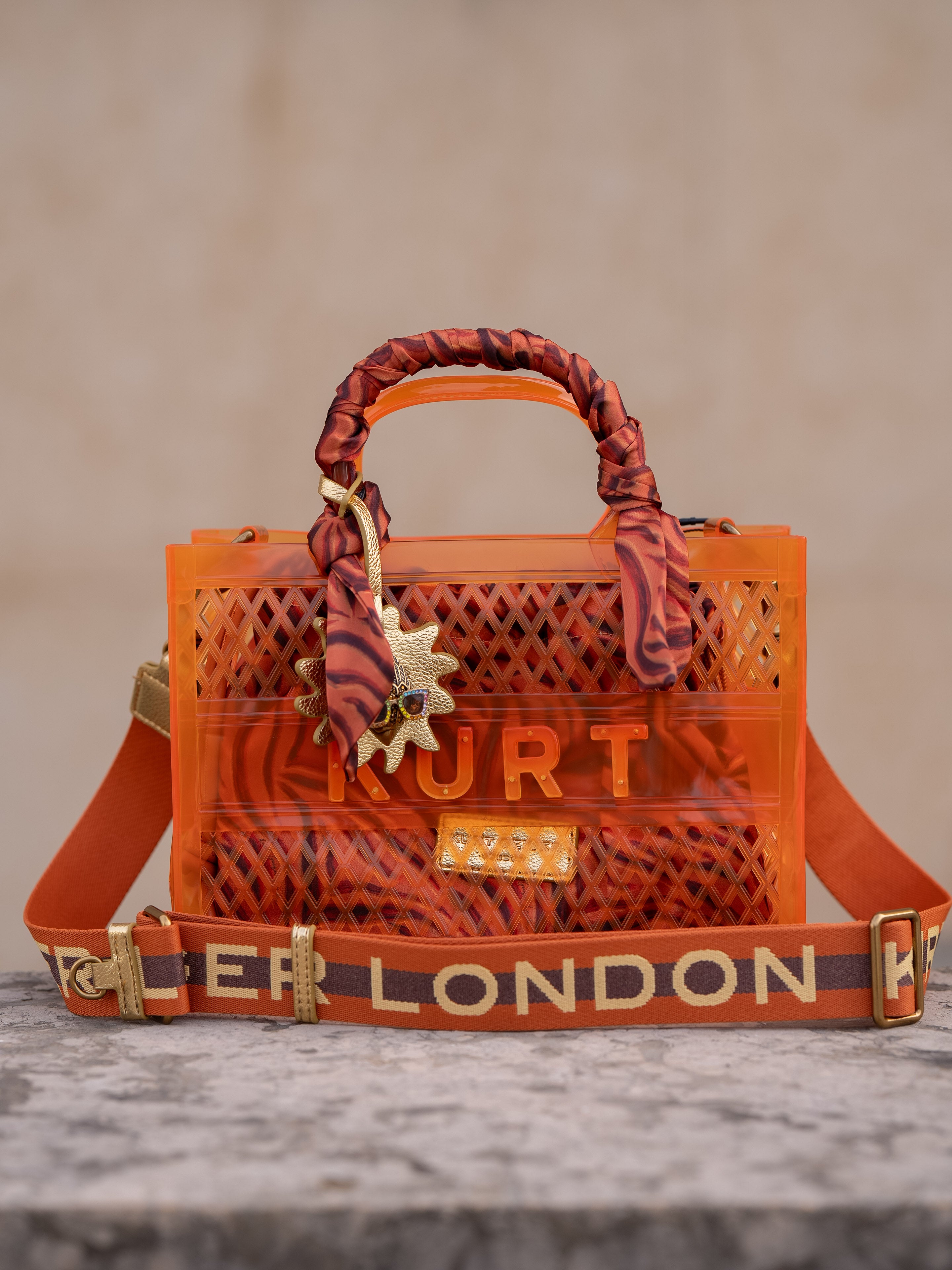This Small Jelly Tote Bag is crafted from an orange vinyl jelly mesh fabric. There is an inner pouch in a tiger striped fabric matching the satin scarf wrapped around the handle.