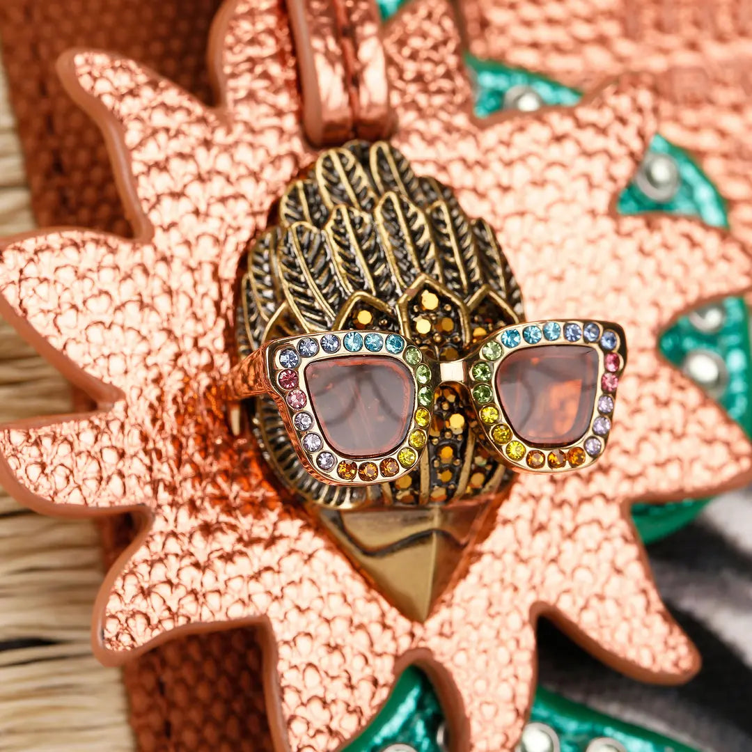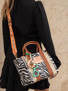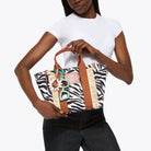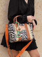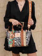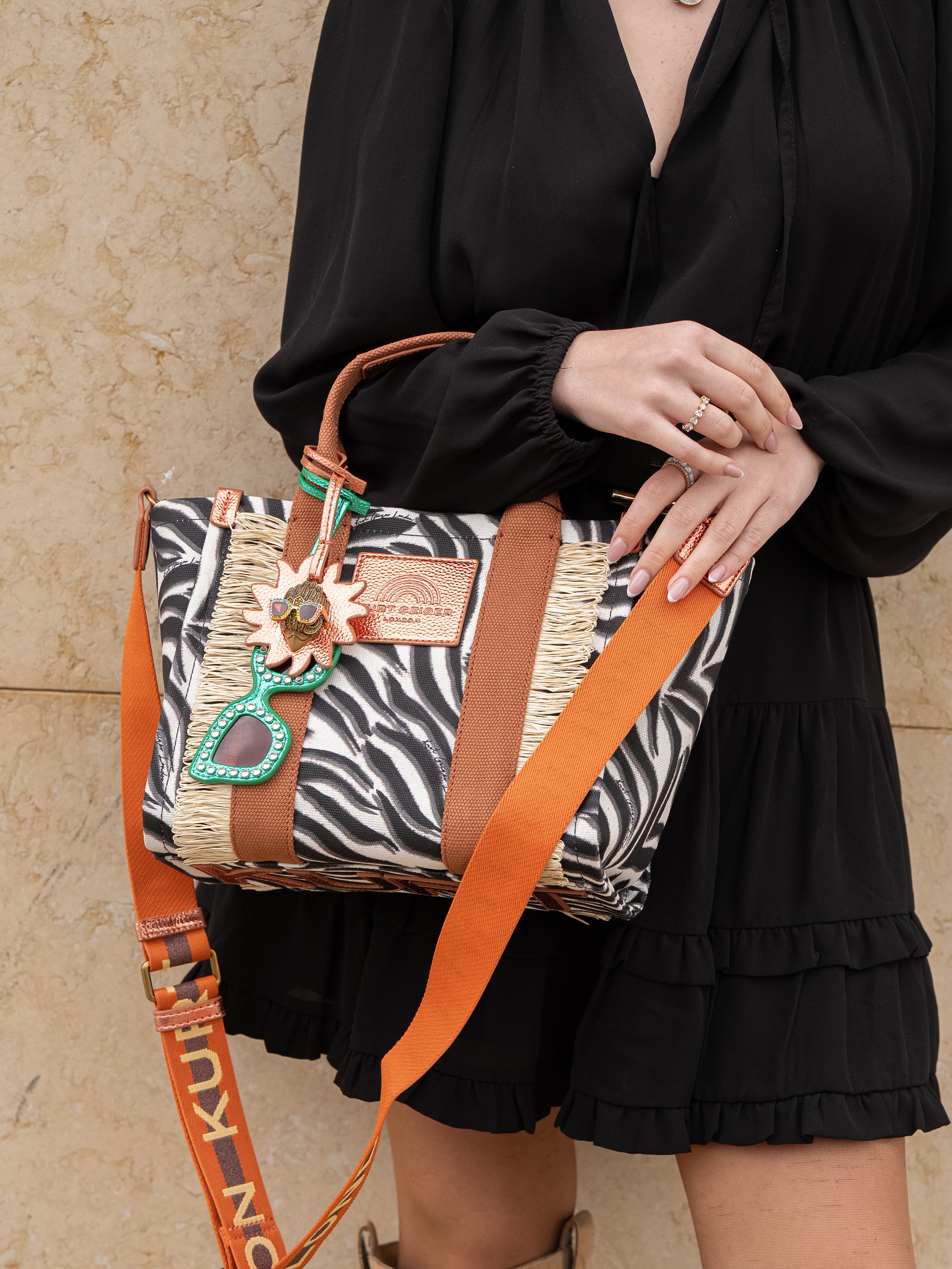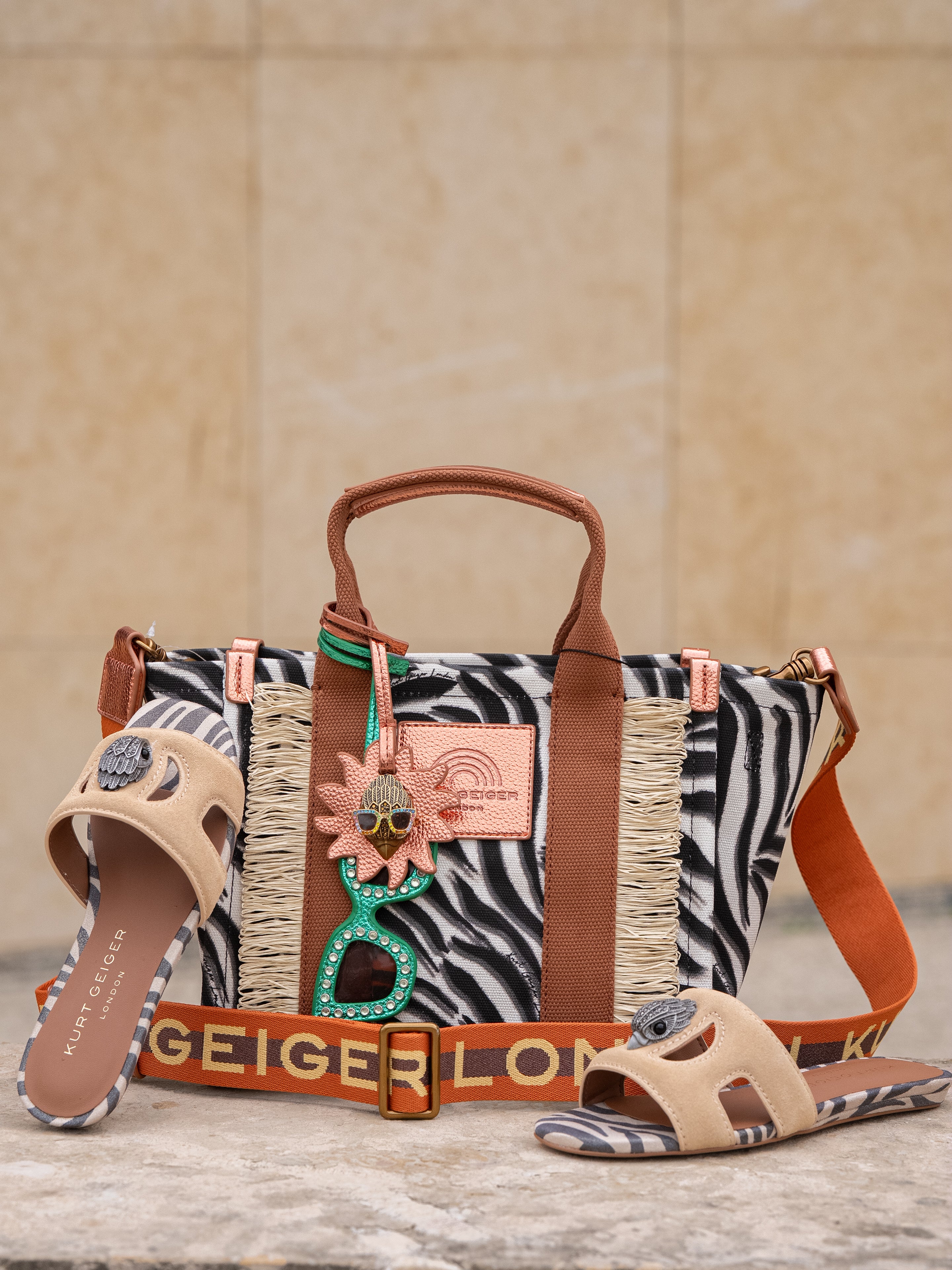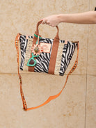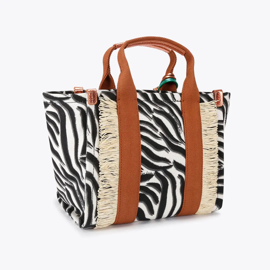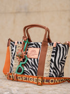 The Small Southbank Tote is crafted in a zebra canvas. There is a metallic green crystal sunglasses tag next to a metallic orange sunbeam tag with antiqued brass head on top.