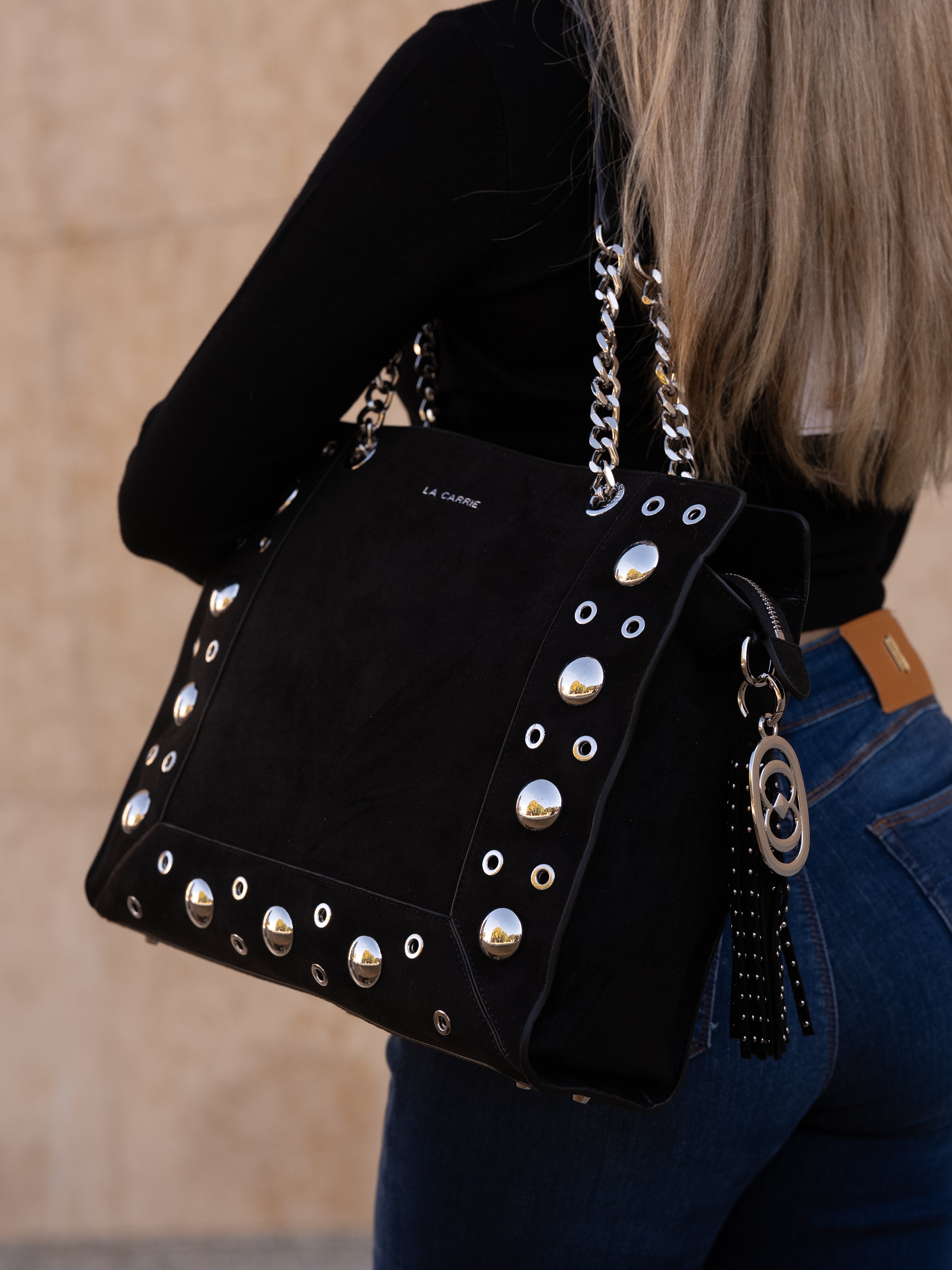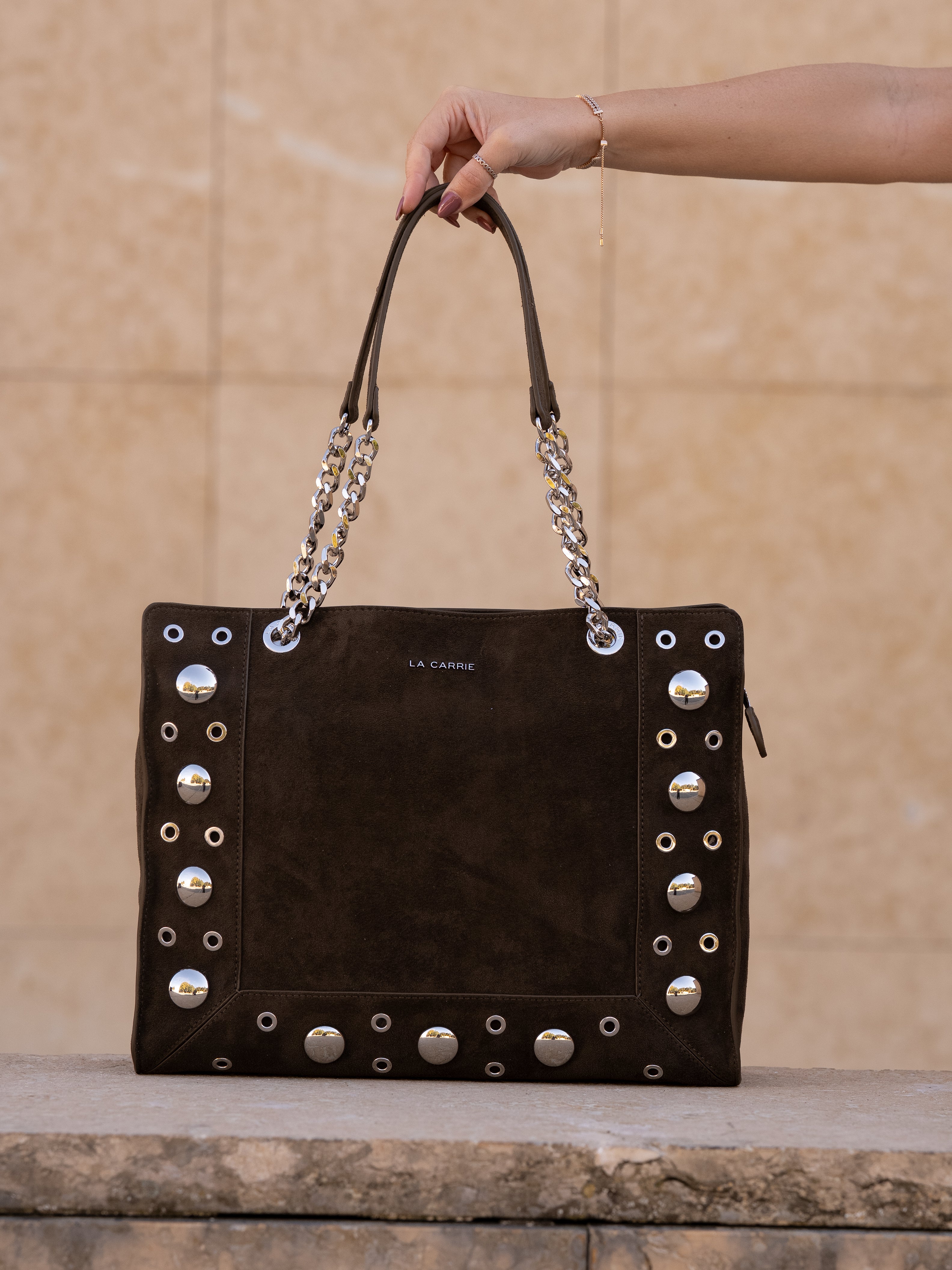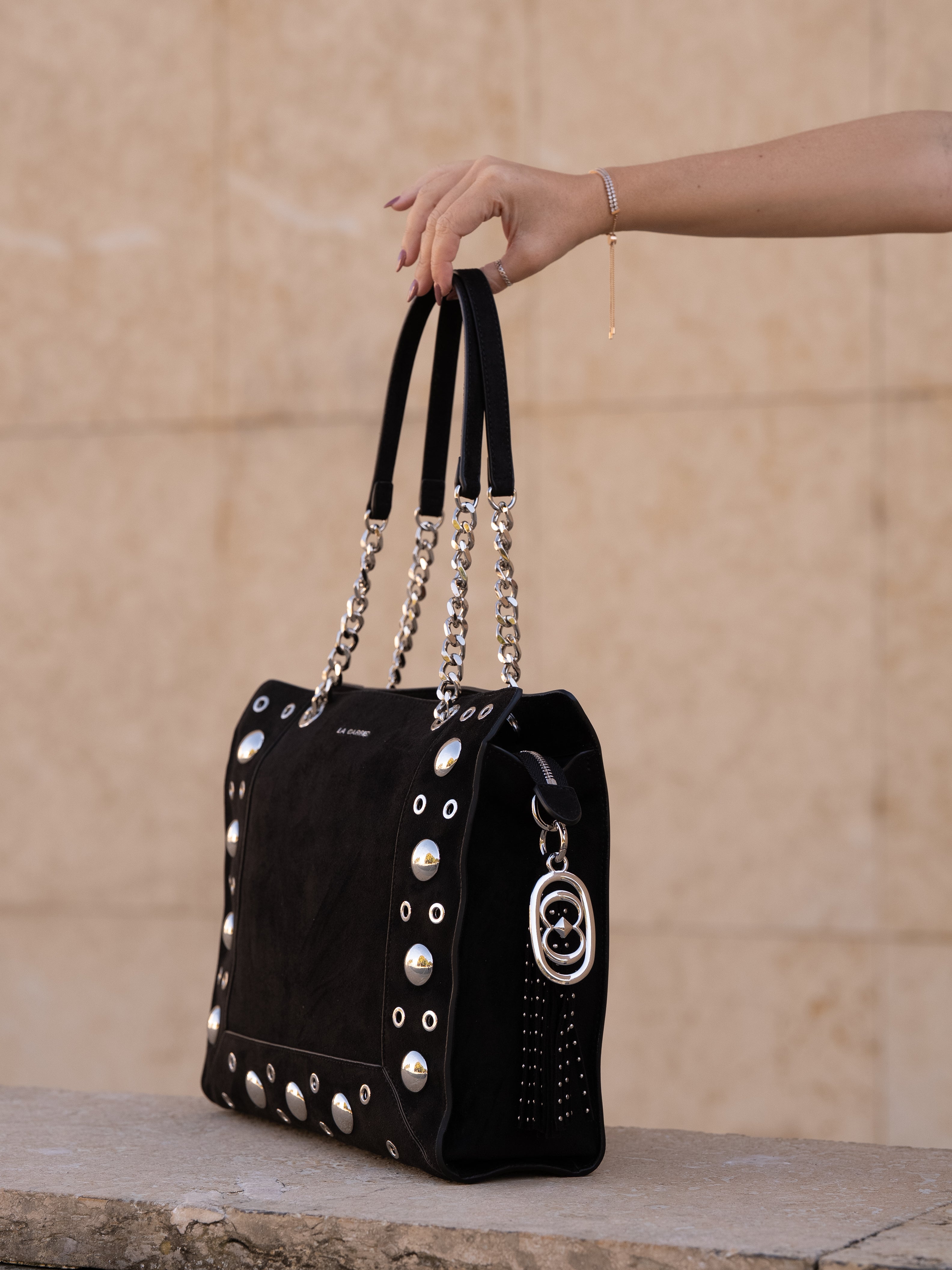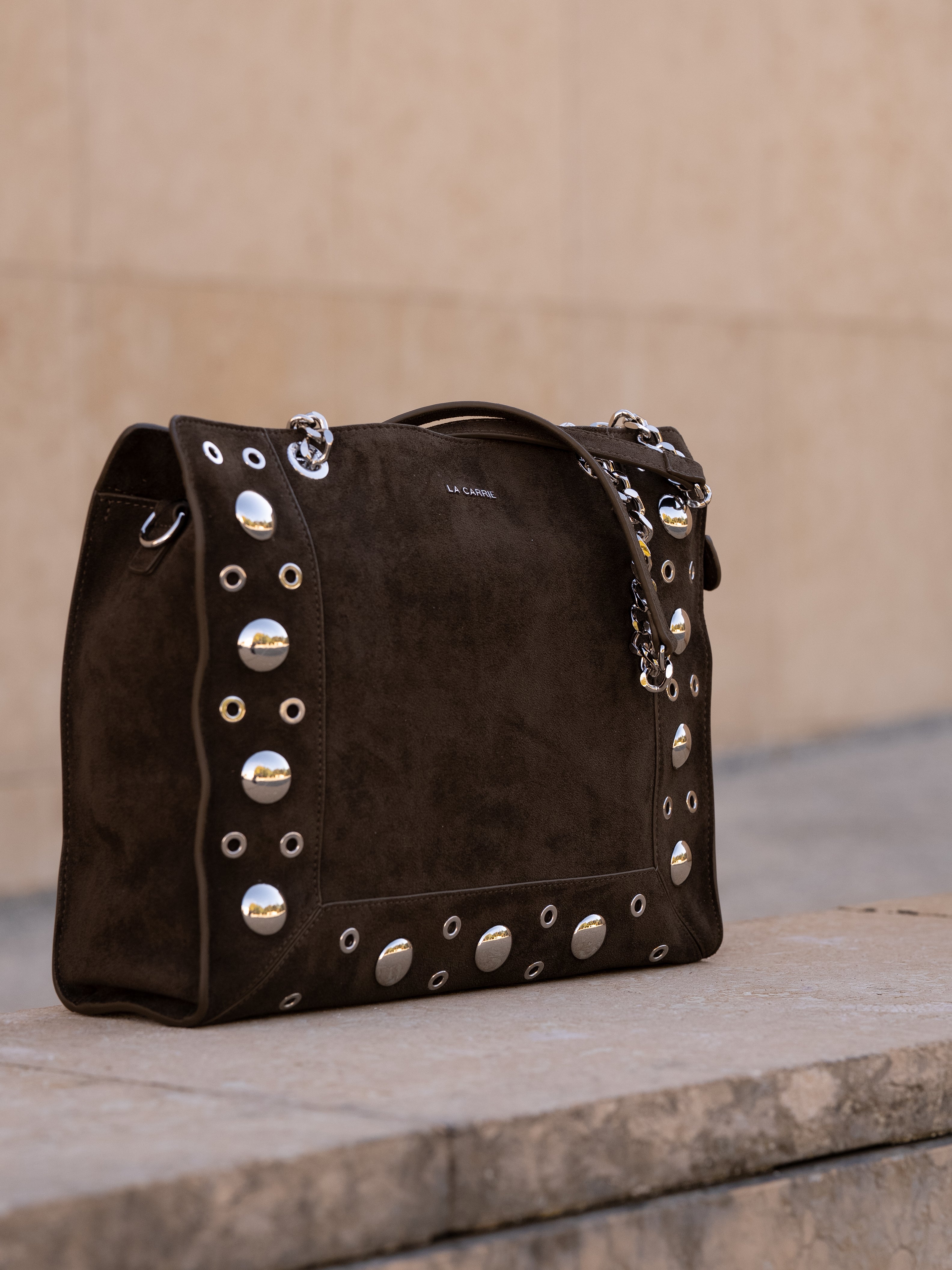 Suede shopping bag with eyelets and silver studs, double chain handles and removable shoulder strap
