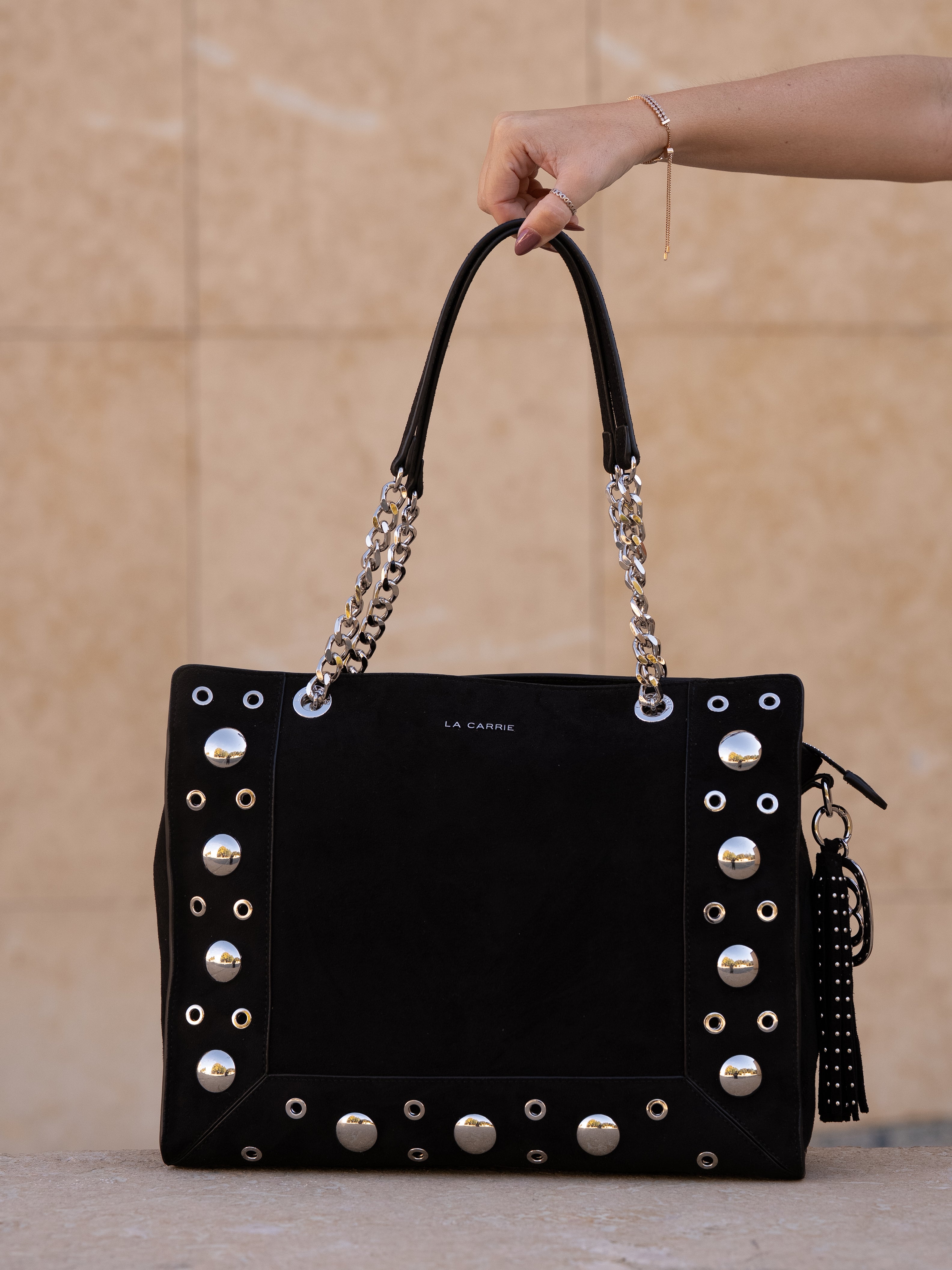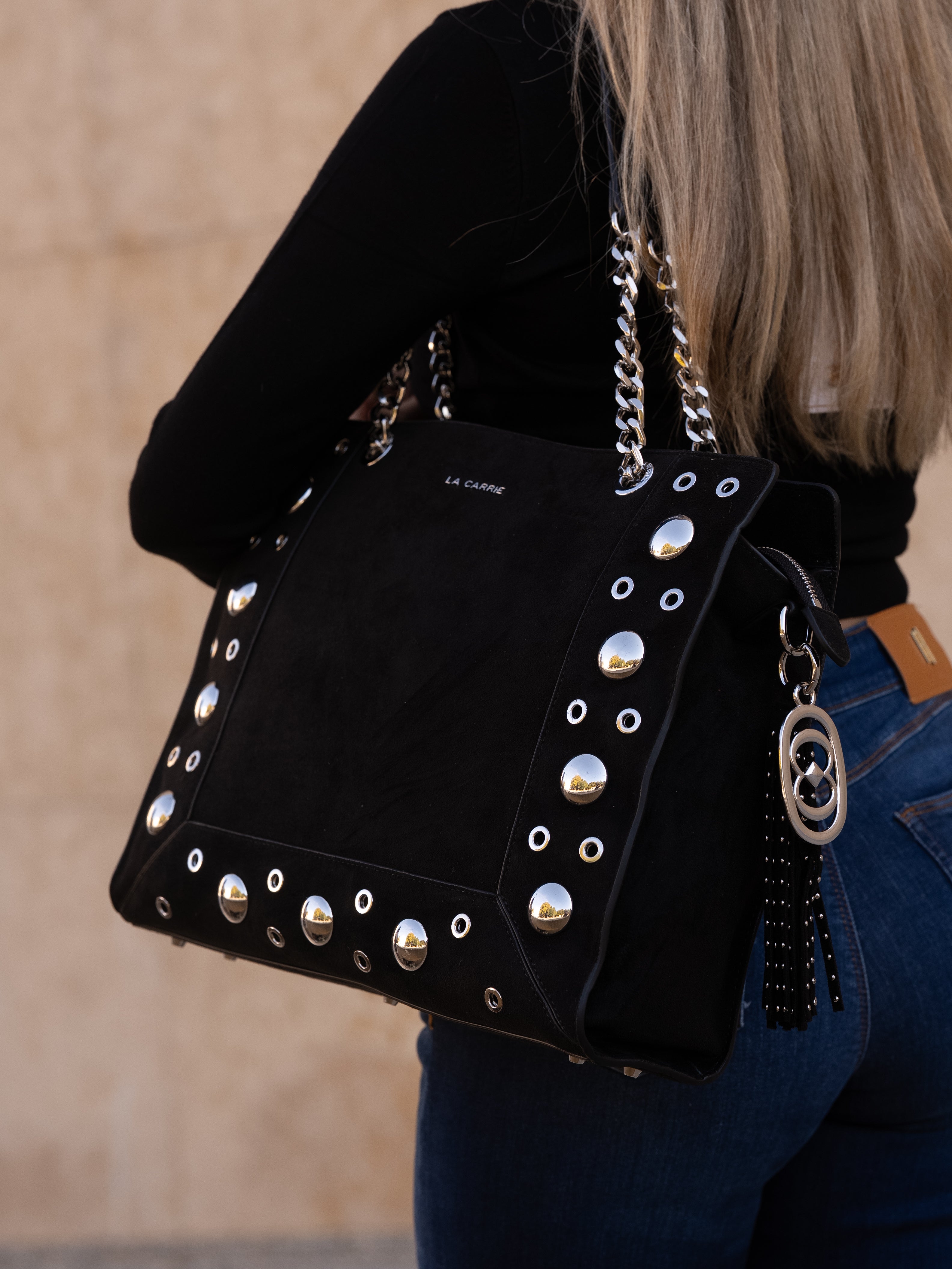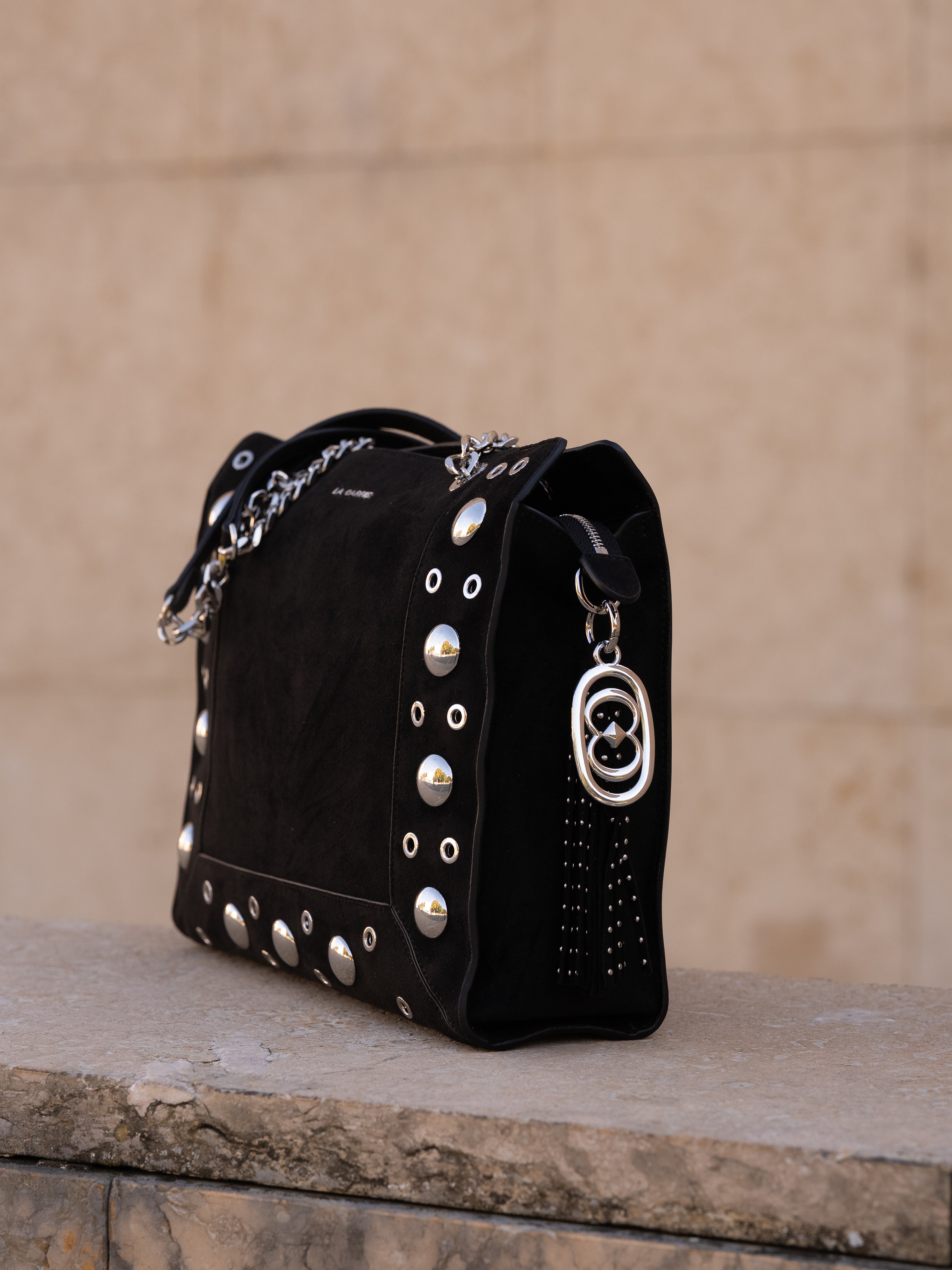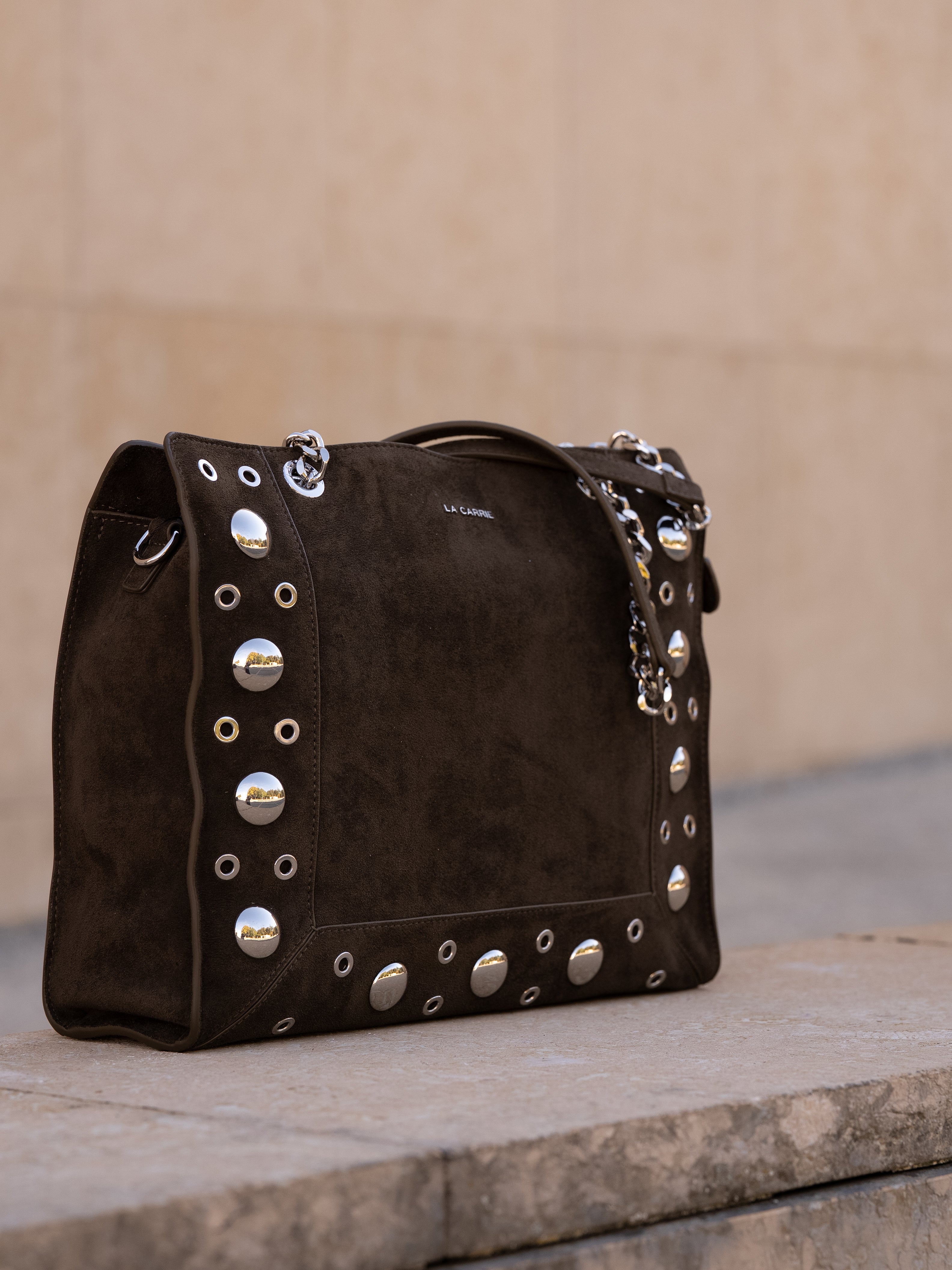 Suede shopping bag with eyelets and silver studs, double chain handles and removable shoulder strap