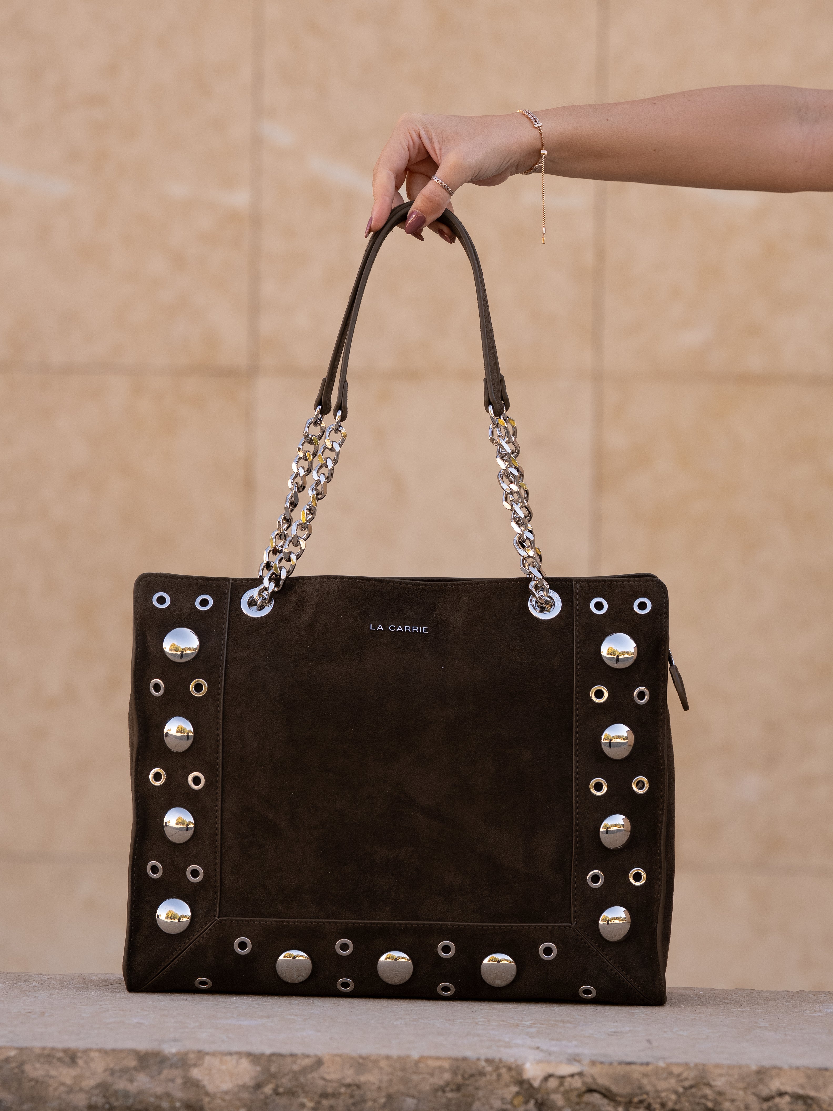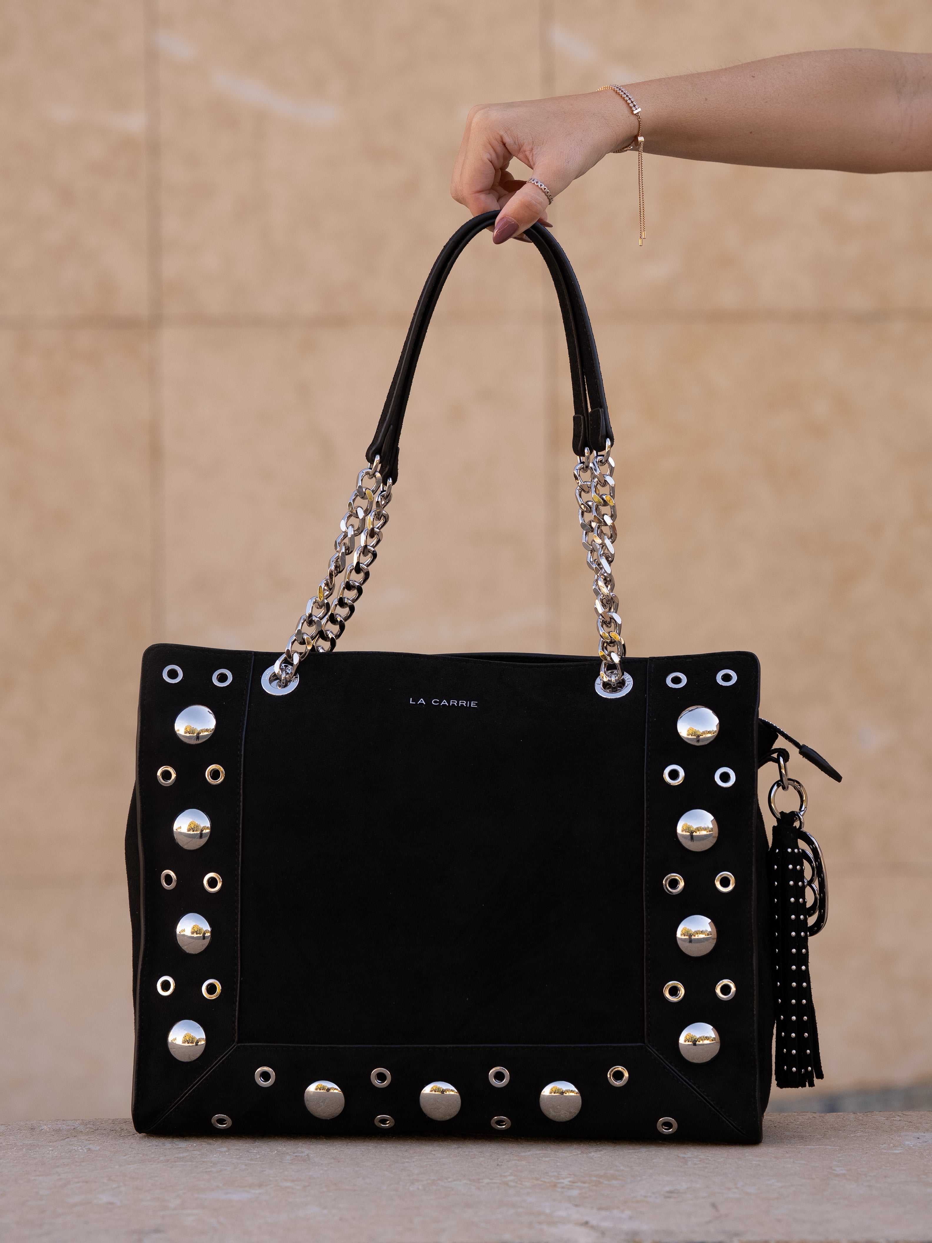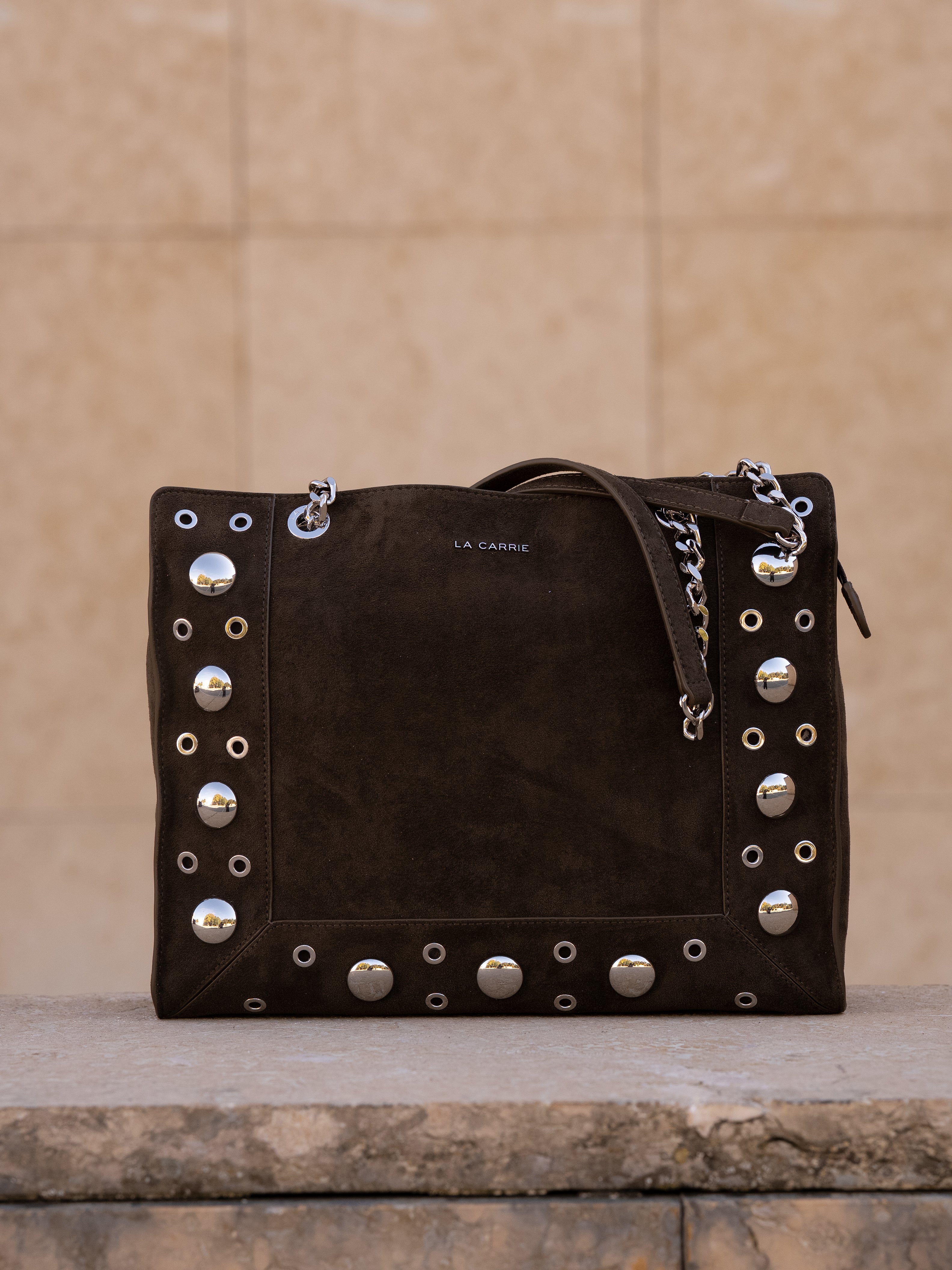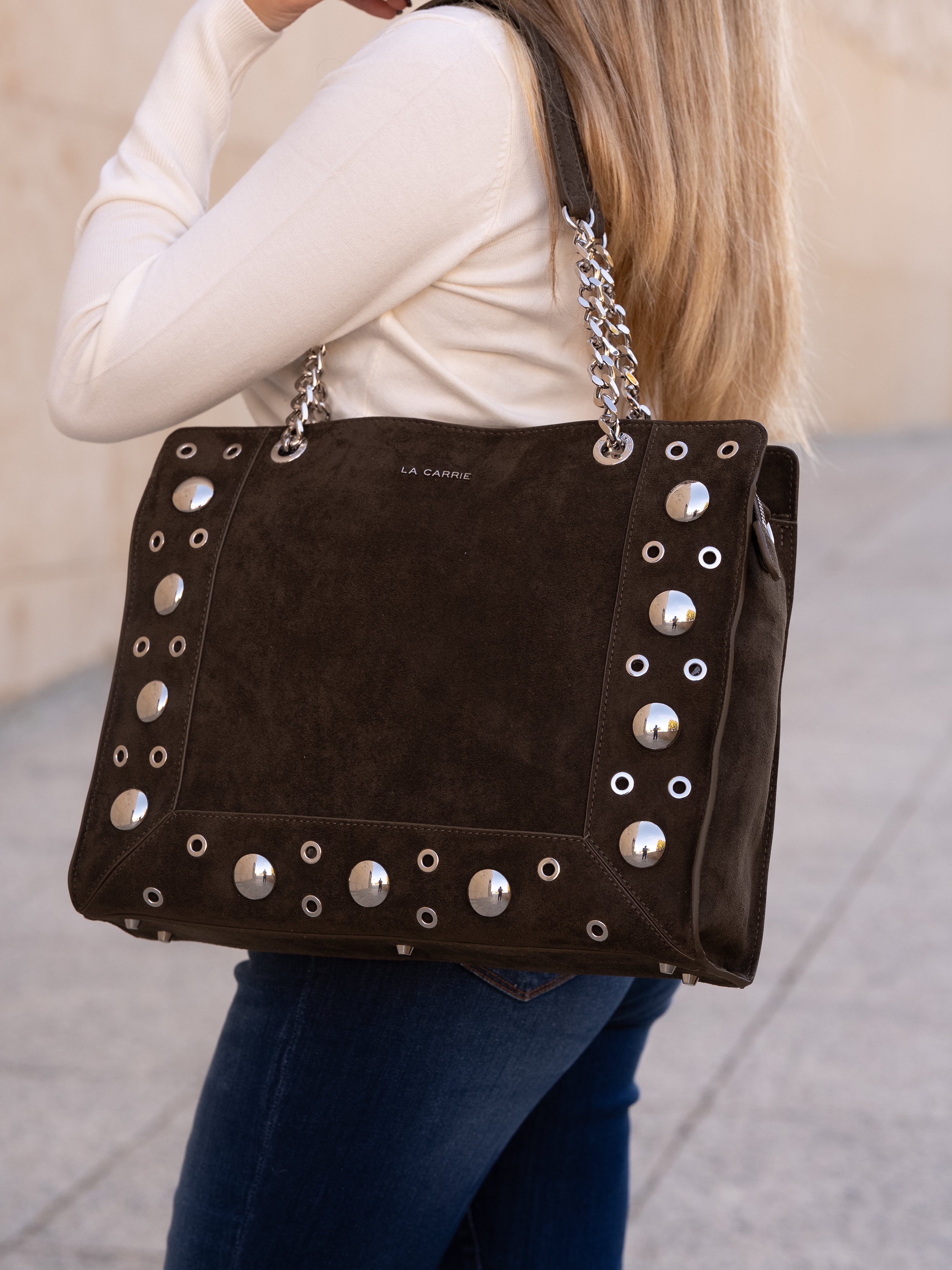 Suede shopping bag with eyelets and silver studs, double chain handles and removable shoulder strap